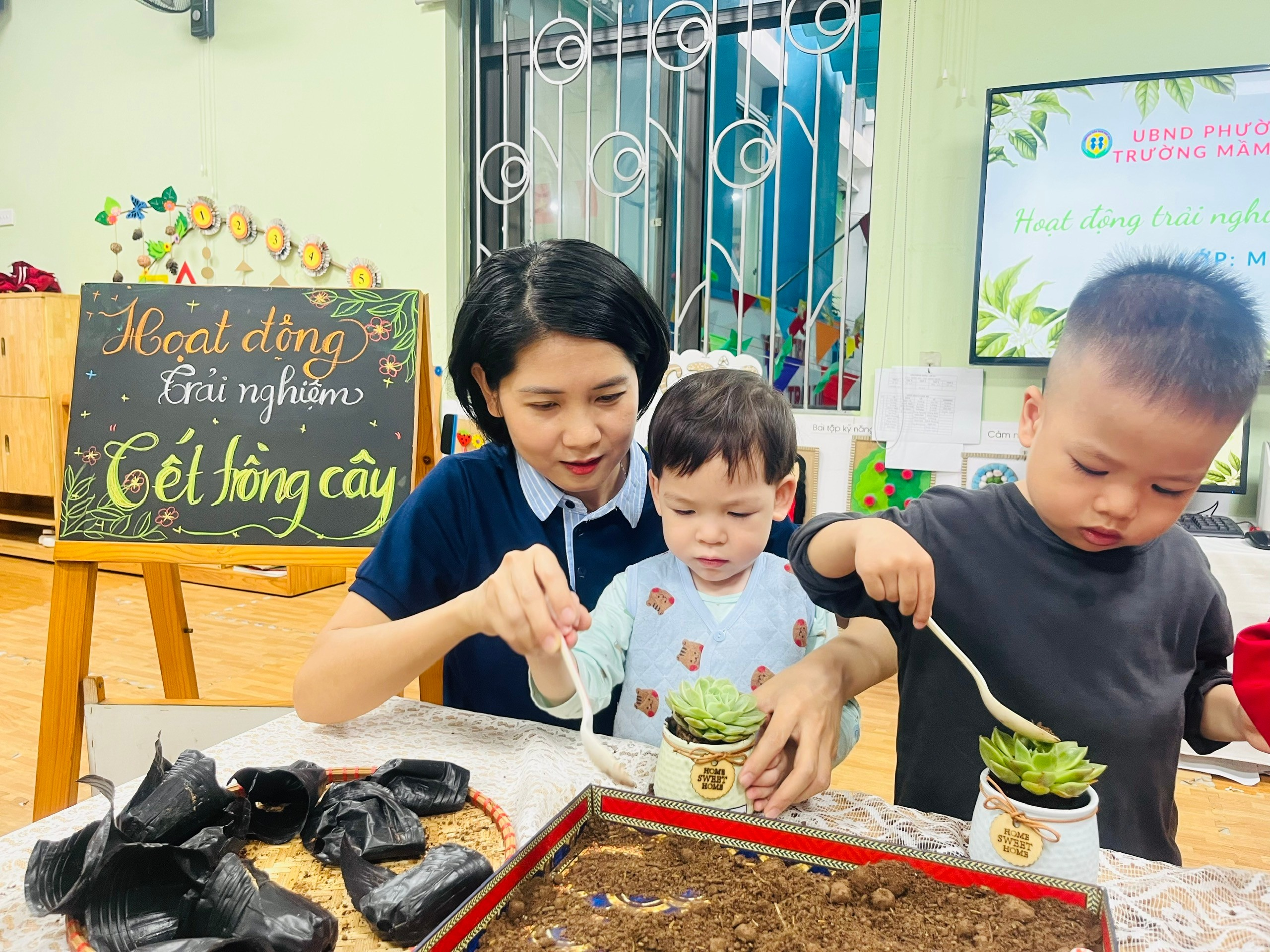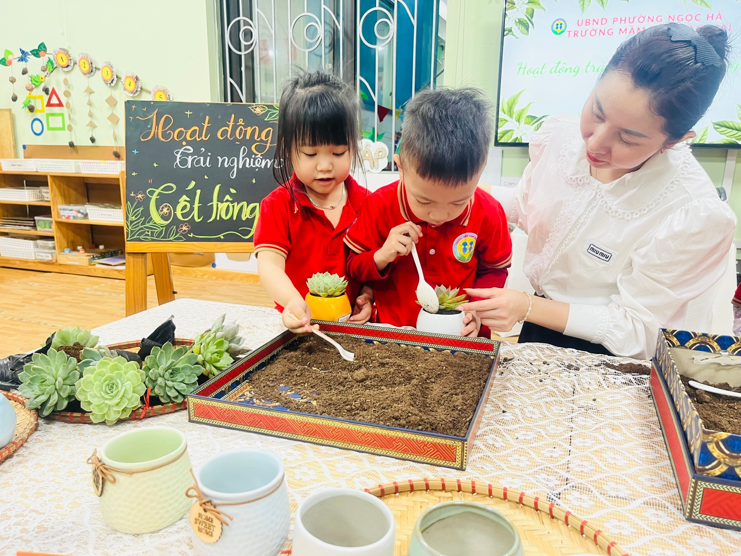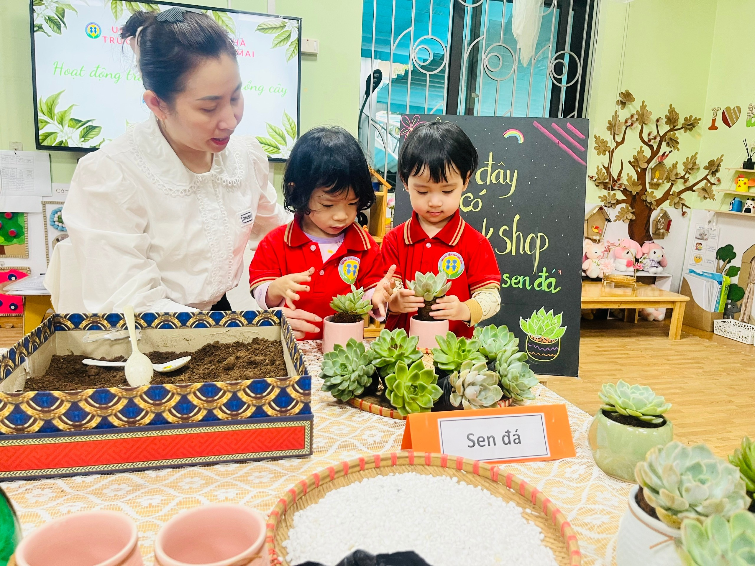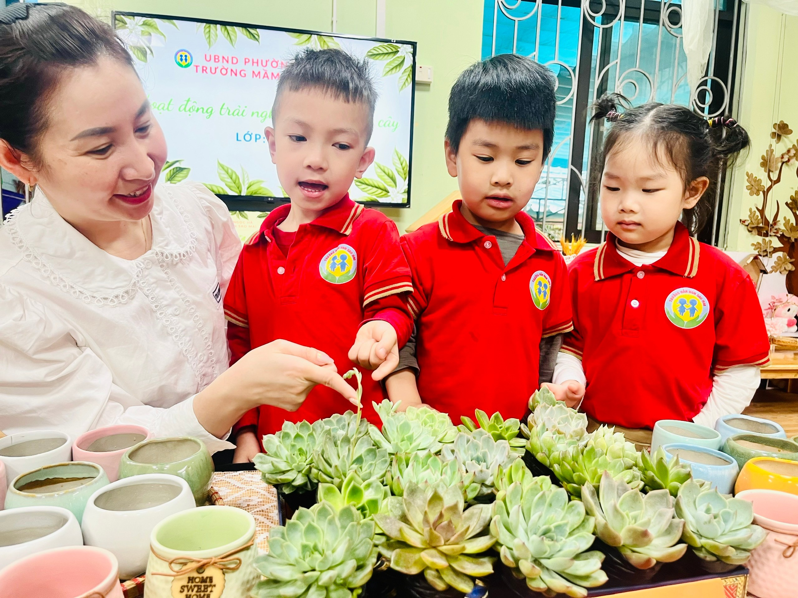 Thông qua hoạt động này, các bé không chỉ được rèn luyện kỹ năng vận động tinh, sự khéo léo của đôi tay mà còn học được cách yêu quý và chăm sóc cây xanh mỗi ngày. Các con hiểu rằng để cây lớn lên khỏe mạnh cần có sự quan tâm, tưới nước và đặt ở nơi có ánh sáng phù hợp. Từ việc chăm sóc một chậu sen đá nhỏ, các con dần hình thành thói quen tốt trong việc bảo vệ môi trường xung quanh.