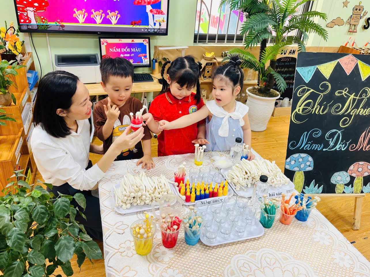 Không khí lớp học trở nên sôi nổi khi các con chăm chú quan sát từng chút biến đổi của cây nấm. Nhiều bạn còn hào hứng thử nghiệm với các màu khác nhau để tạo ra những “cây nấm sắc màu” độc đáo theo ý thích của mình. Qua hoạt động, trẻ không chỉ được rèn luyện sự khéo léo mà còn phát triển khả năng quan sát và tư duy khám phá khoa học.