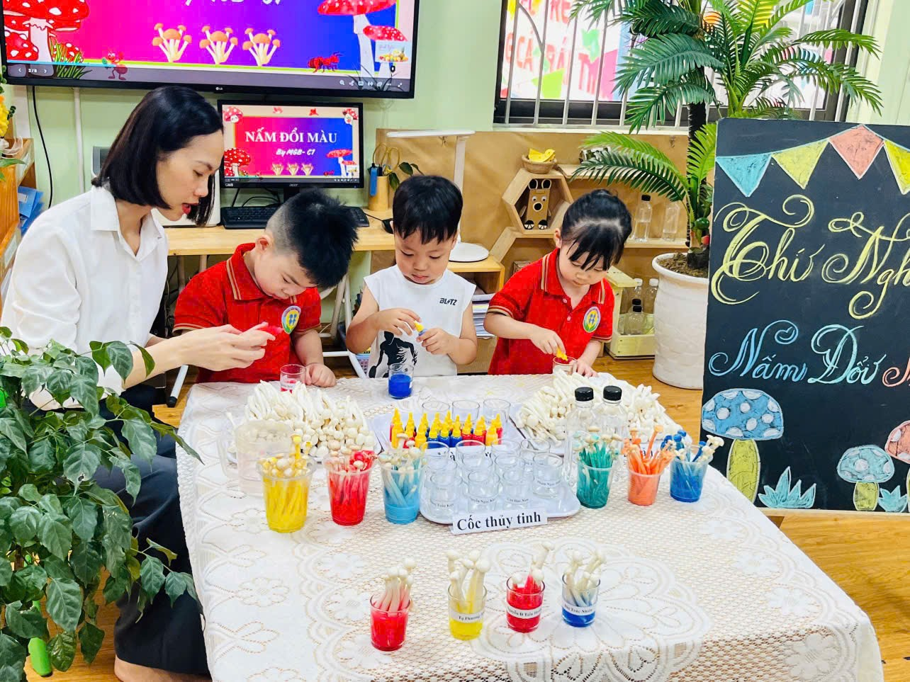 Trong quá trình thực hiện, dưới sự hướng dẫn của cô giáo, các bé được tự tay đổ màu nước (xanh, đỏ, vàng) vào những chiếc cốc thủy tinh. Sau đó, trẻ nhẹ nhàng cắm cây nấm hải sản vào trong cốc. Chỉ sau một thời gian ngắn, điều thú vị đã diễn ra khi cây nấm bắt đầu hút nước màu, các sợi nấm dần dần chuyển sang những sắc màu rực rỡ. Sự thay đổi kỳ diệu này khiến các bé vô cùng ngạc nhiên và thích thú.