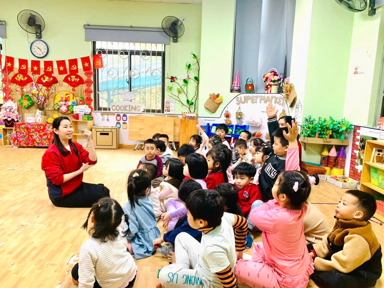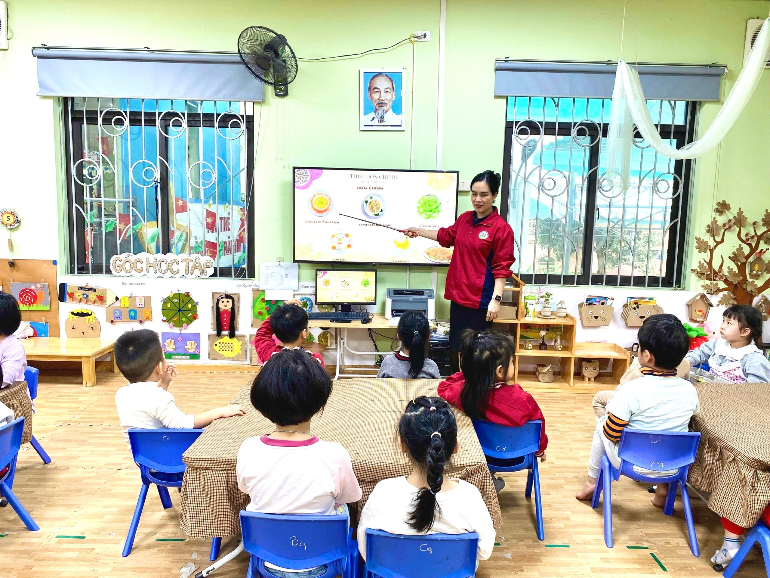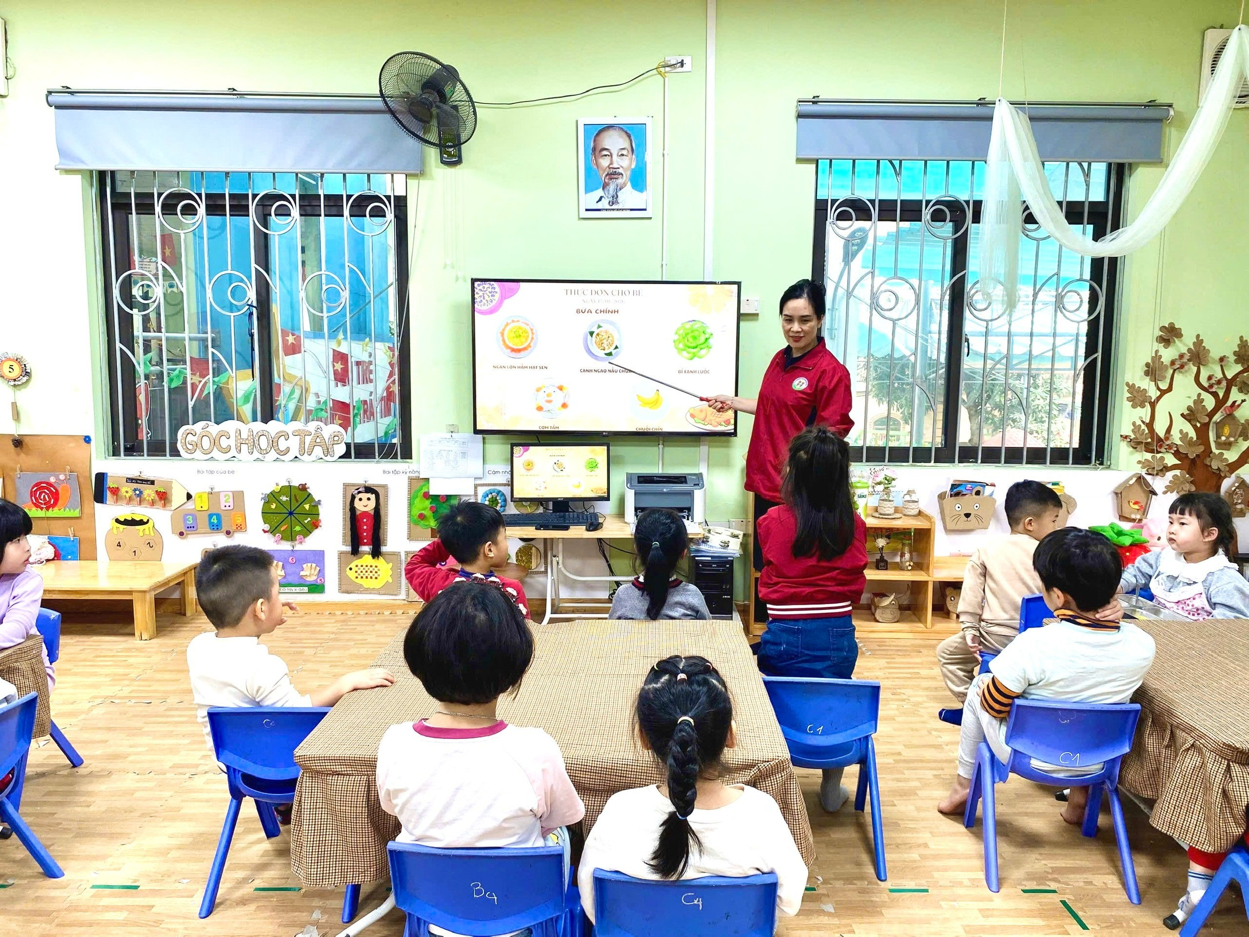 Tiếp theo, cô giáo Hồng Vân đã giới thiệu đến các con thực đơn của bữa ăn trong ngày. Bằng giọng nói gần gũi, dễ hiểu, cô giúp trẻ nhận biết các món ăn trong thực đơn, đồng thời giải thích về những chất dinh dưỡng có trong từng món như chất đạm giúp cơ thể khỏe mạnh, chất bột đường cung cấp năng lượng, vitamin và khoáng chất giúp tăng sức đề kháng. Qua đó, cô nhấn mạnh tác dụng của việc ăn uống đầy đủ chất, ăn đa dạng thực phẩm để cơ thể phát triển toàn diện, cao lớn và thông minh. Những ánh mắt chăm chú, những cái gật đầu hồn nhiên của trẻ cho thấy các con rất hào hứng và tiếp thu tích cực.