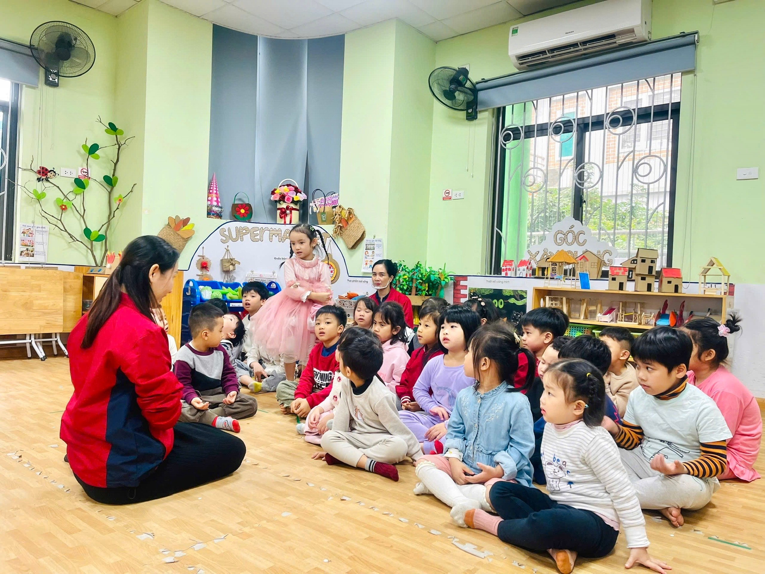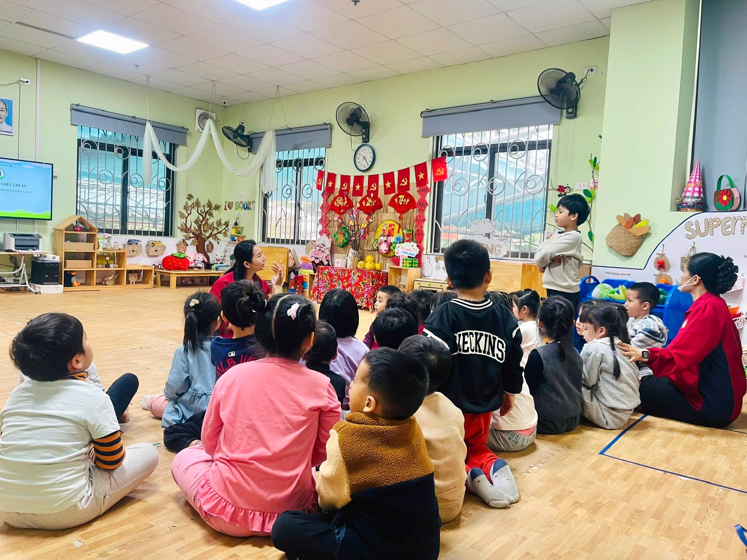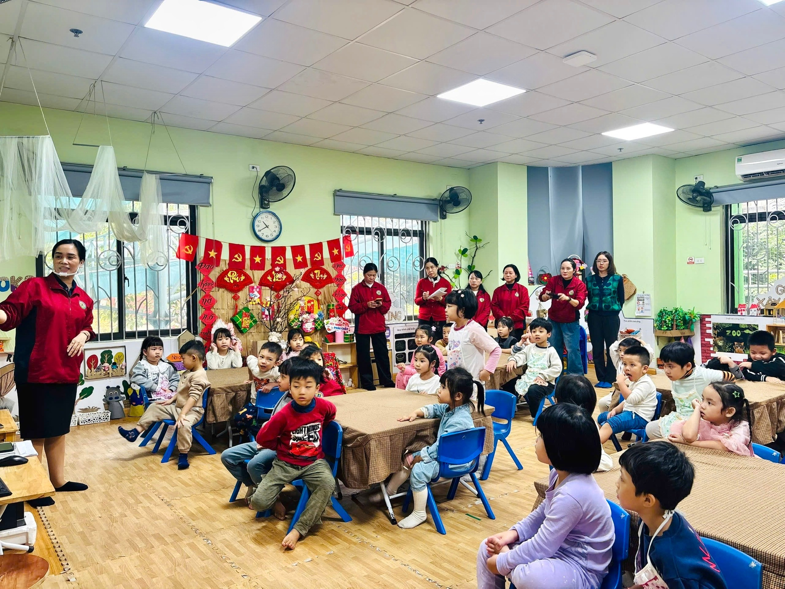 Tiếp theo, cô giáo Hồng Vân đã giới thiệu đến các con thực đơn của bữa ăn trong ngày. Bằng giọng nói gần gũi, dễ hiểu, cô giúp trẻ nhận biết các món ăn trong thực đơn, đồng thời giải thích về những chất dinh dưỡng có trong từng món như chất đạm giúp cơ thể khỏe mạnh, chất bột đường cung cấp năng lượng, vitamin và khoáng chất giúp tăng sức đề kháng. Qua đó, cô nhấn mạnh tác dụng của việc ăn uống đầy đủ chất, ăn đa dạng thực phẩm để cơ thể phát triển toàn diện, cao lớn và thông minh. Những ánh mắt chăm chú, những cái gật đầu hồn nhiên của trẻ cho thấy các con rất hào hứng và tiếp thu tích cực.