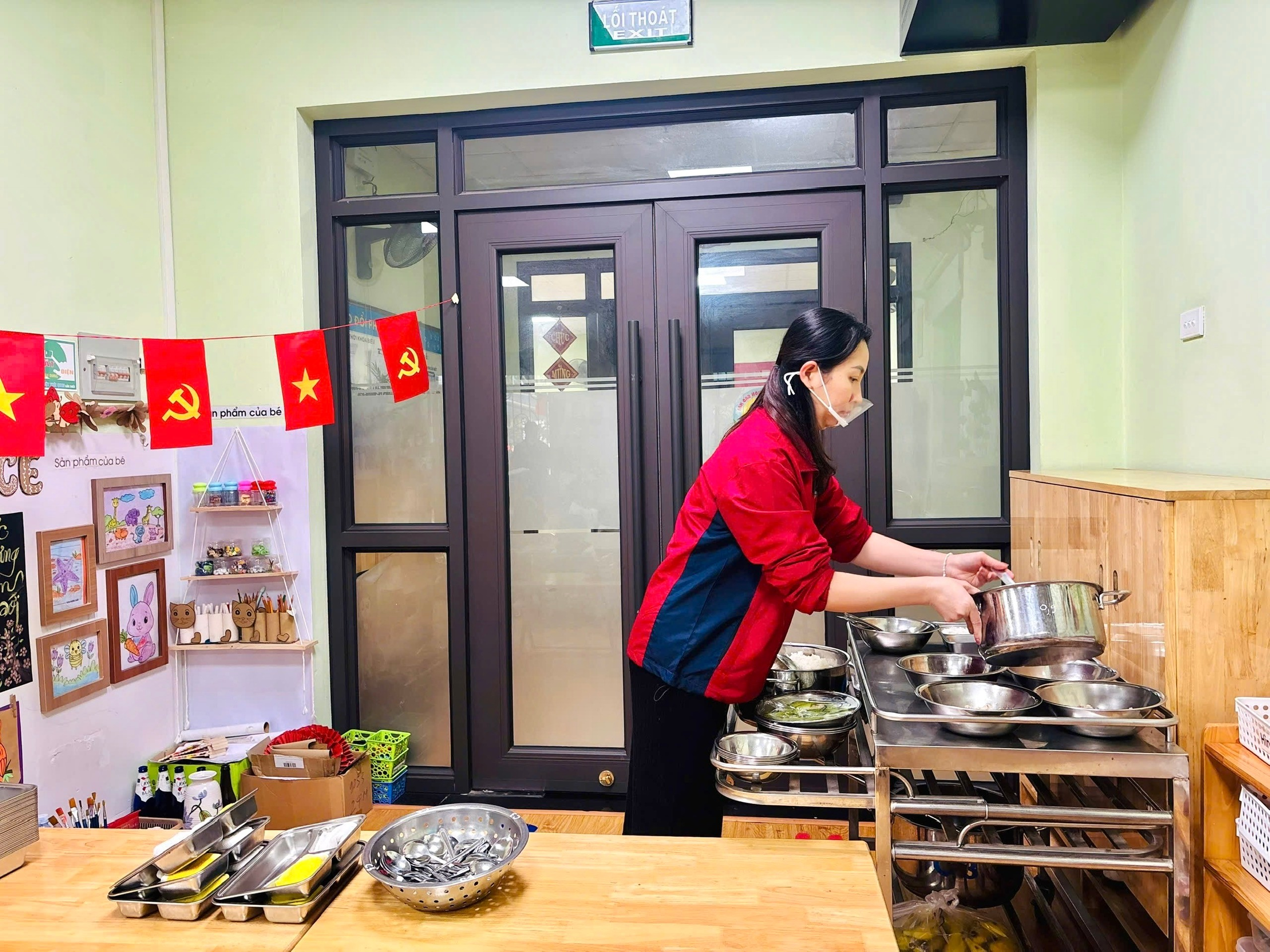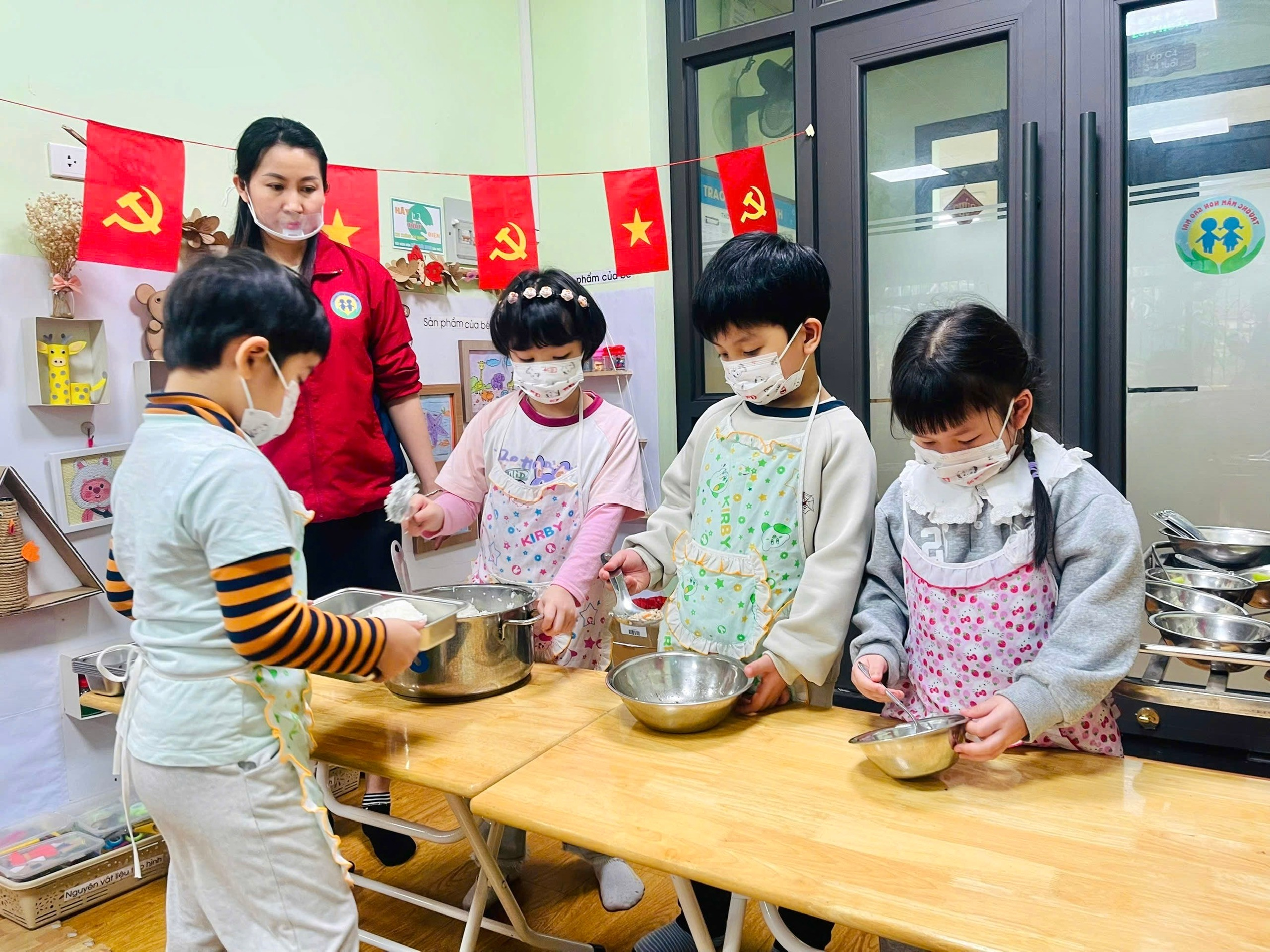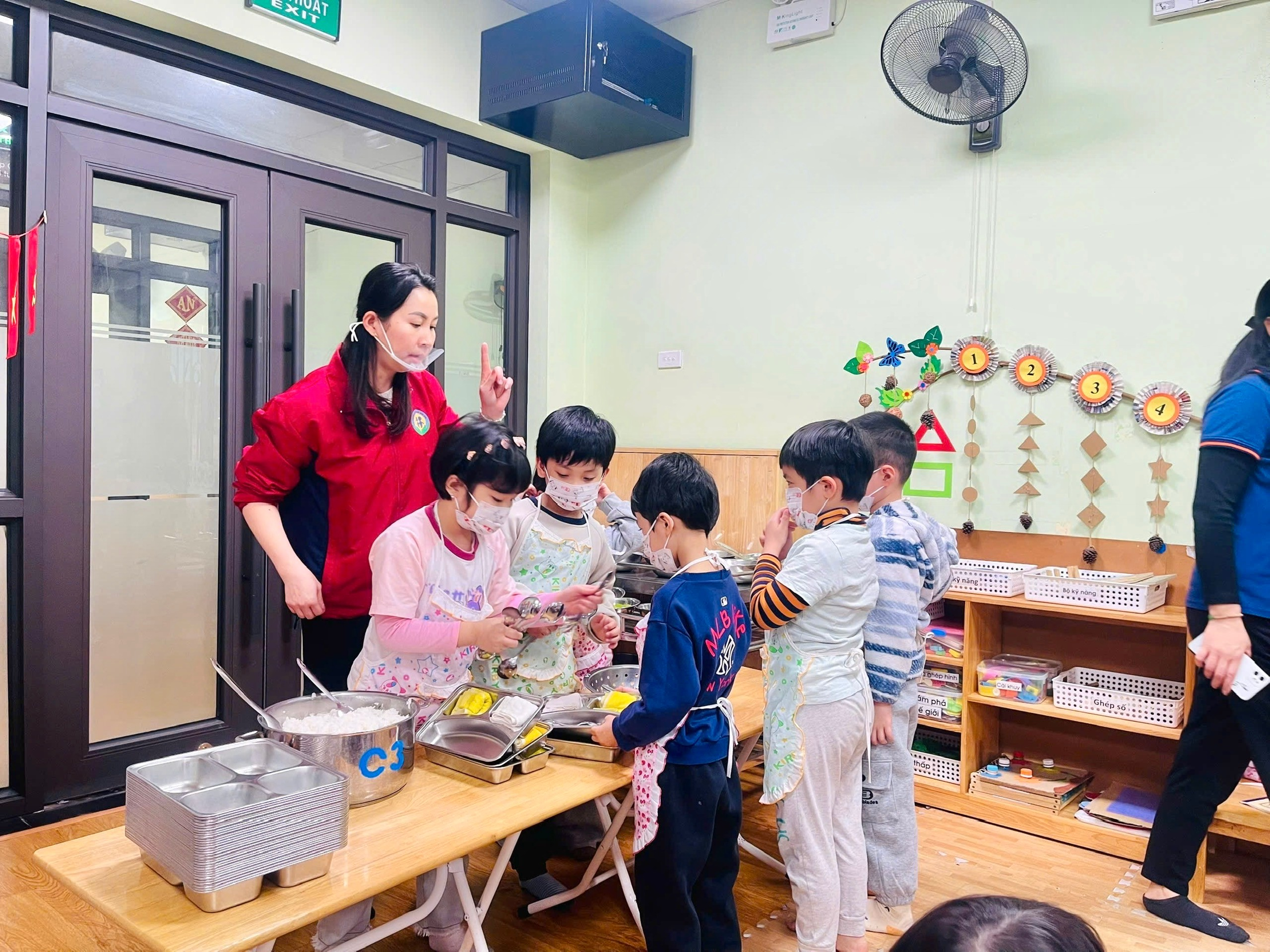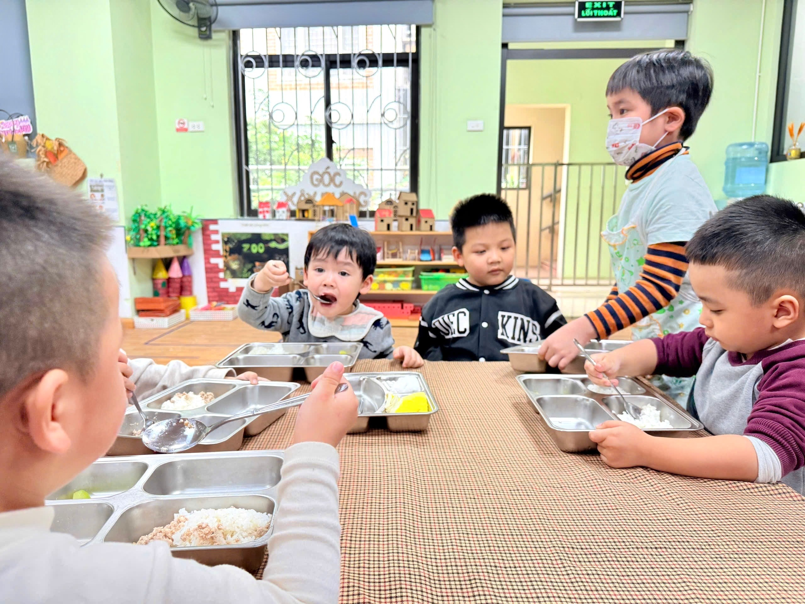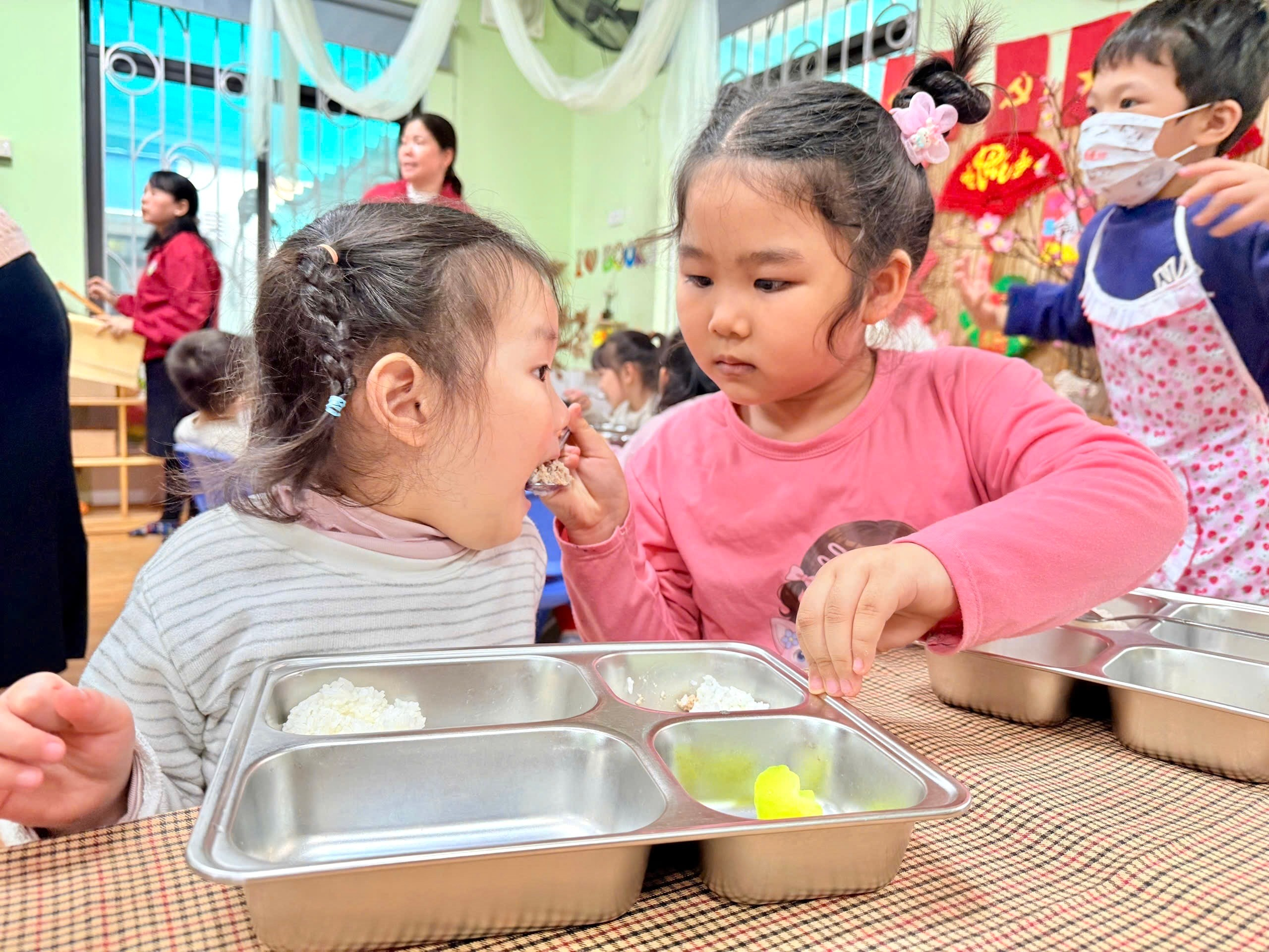 Trong suốt bữa ăn, các giáo viên luôn đồng hành, hỗ trợ trẻ một cách nhẹ nhàng. Các anh chị mẫu giáo lớn được khuyến khích tự chia thức ăn vào khay, cẩn thận bê khay về bàn ăn của mình. Không chỉ vậy, các con còn biết quan tâm, giúp đỡ những em nhỏ lớp A3, ân cần hỗ trợ để các em ăn ngon miệng, ăn hết suất. Hình ảnh các bạn lớn chăm sóc, nhường nhịn các em nhỏ đã tạo nên một bữa ăn chan chứa yêu thương và tinh thần đoàn kết.