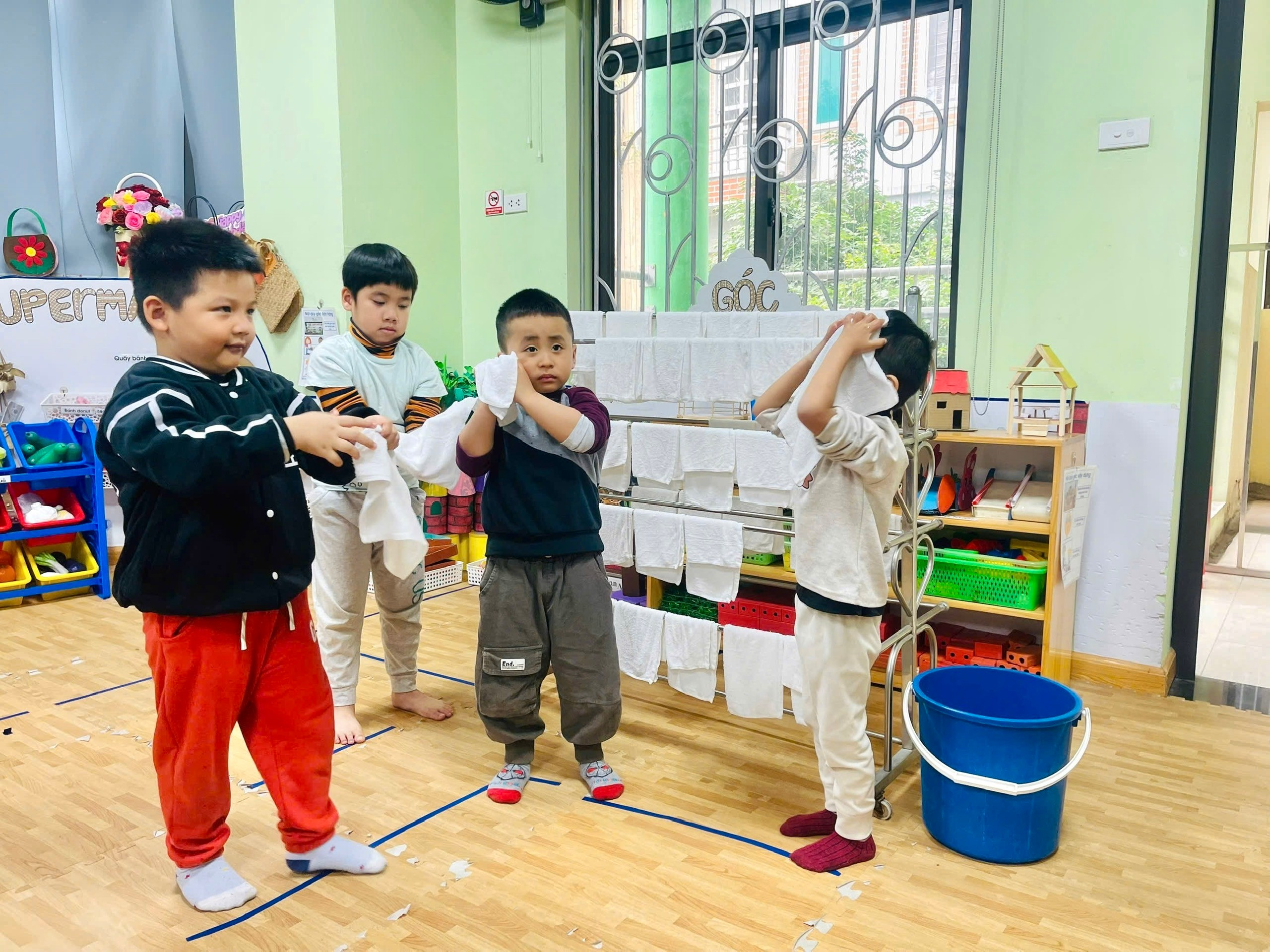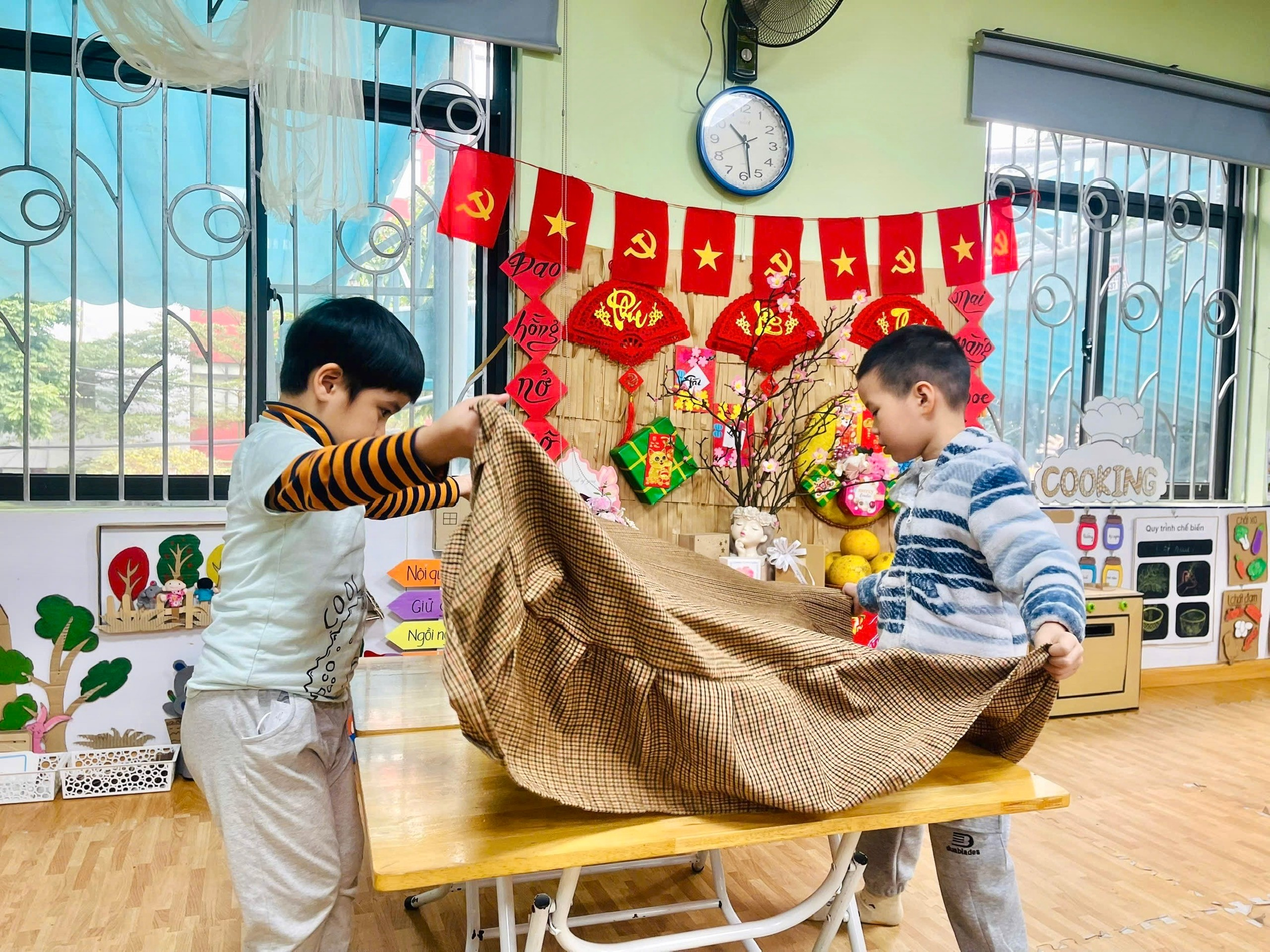 Mở đầu giờ ăn, cô giáo Thiên Hương đã nhẹ nhàng ổn định tổ chức, hướng dẫn trẻ hai lớp vào nề nếp. Dưới sự quan sát, hỗ trợ của cô, các bạn mẫu giáo lớn được tự tay kê bàn ăn, trải khăn trải bàn ngay ngắn. Các anh chị lớn dắt tay em đi lấy ghế, xếp ghế gọn gàng vào bàn, sau đó các con lần lượt rửa tay đúng quy trình trước khi vào bữa. Không khí giờ ăn trở nên vui tươi, ấm áp khi các con cùng hợp tác, giúp đỡ nhau như những người bạn thân thiết trong một gia đình nhỏ.