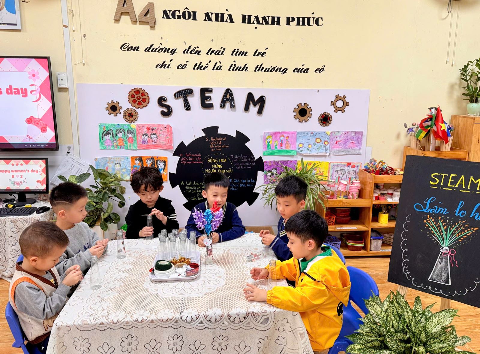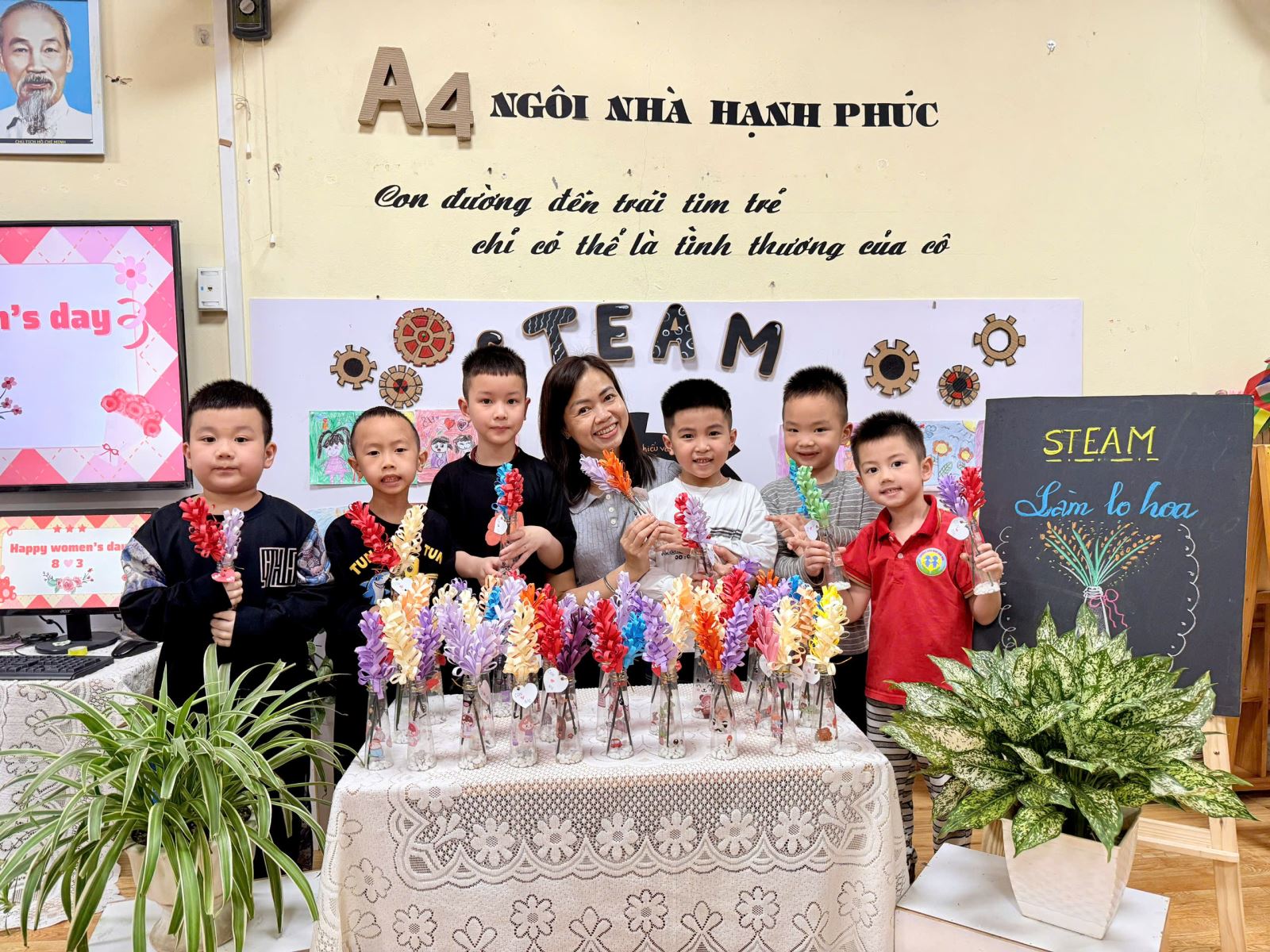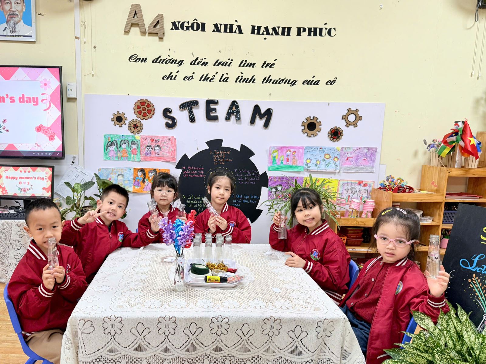 Nhân dịp Ngày Quốc tế Phụ nữ 8/3, các bạn nhỏ lớp Mẫu giáo lớn A4 xin gửi tới bà, tới mẹ và các cô những lời chúc thật nhiều sức khỏe, luôn rạng rỡ và hạnh phúc. Mong rằng những chiếc lọ hoa nhỏ xinh cùng tình cảm trong veo của các con sẽ mang đến thật nhiều nụ cười yêu thương.