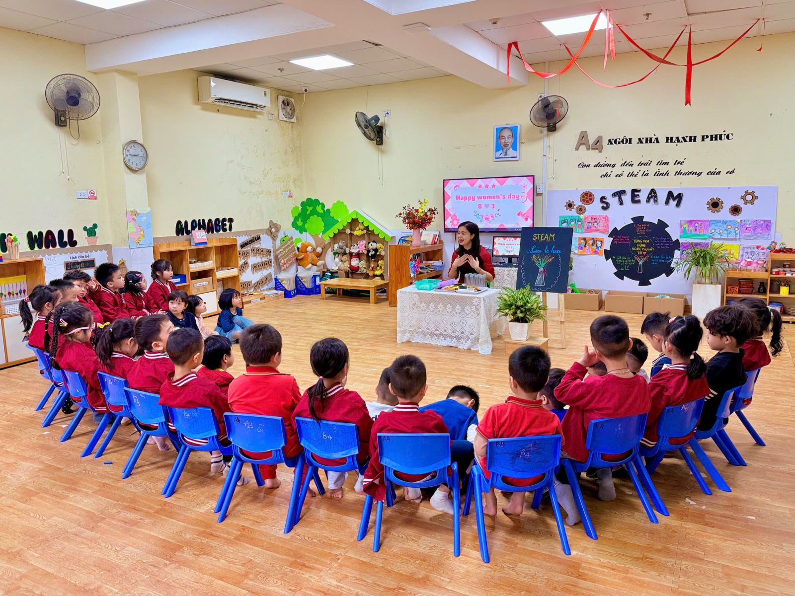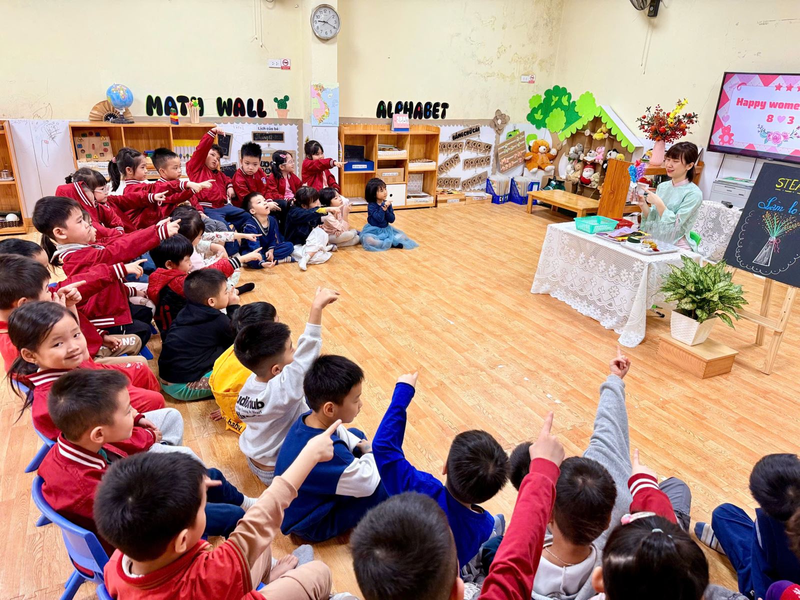 Buổi hoạt động bắt đầu bằng những câu chuyện nhỏ mà cô giáo kể cho các con nghe về ý nghĩa của ngày 8/3 – ngày để tôn vinh và gửi gắm tình yêu thương tới bà, tới mẹ, tới những người phụ nữ dịu dàng luôn chăm sóc và chở che cho các con mỗi ngày. Ánh mắt các bé bỗng trở nên rạng rỡ hơn khi nhắc đến mẹ, đến bà – những người mà các con luôn yêu thương nhất.