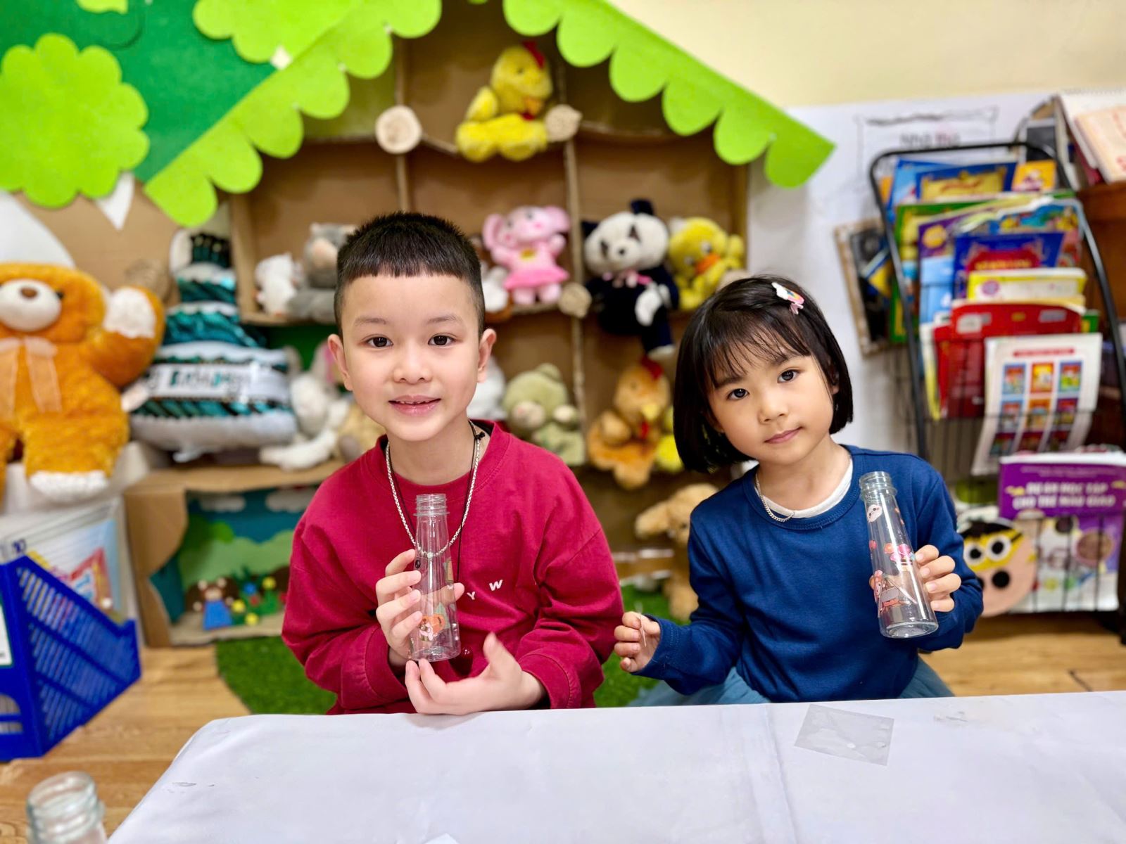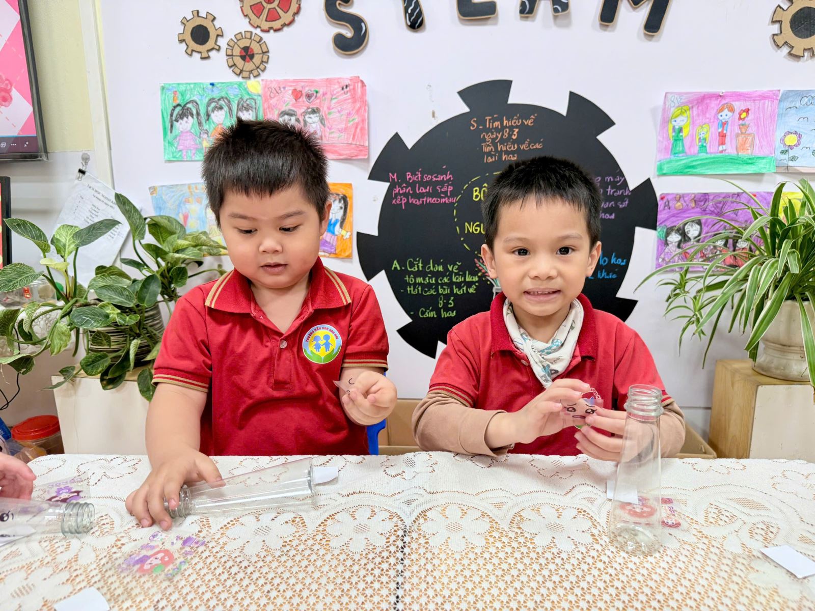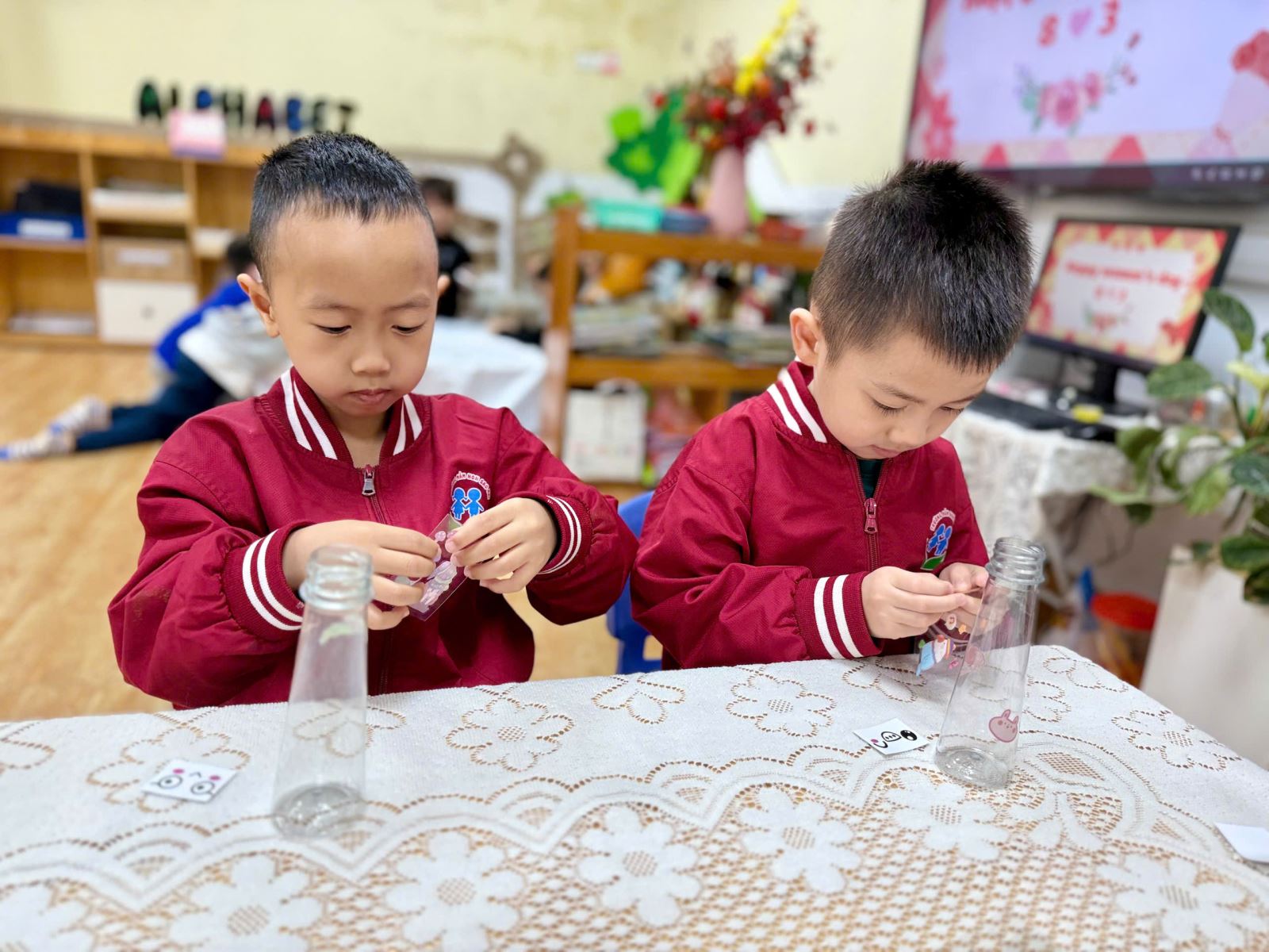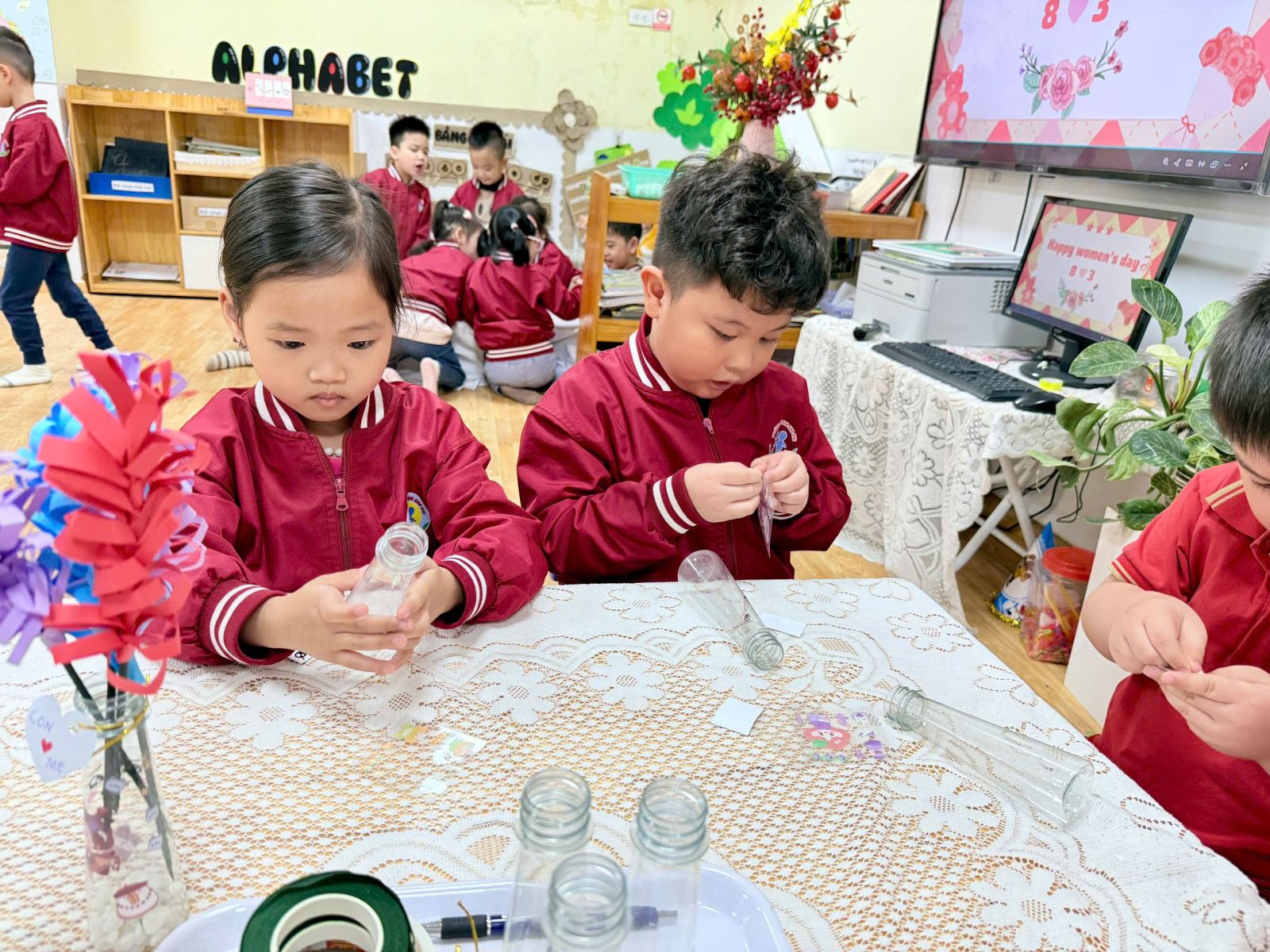 Từ những vật liệu quen thuộc, gần gũi như chai nhựa, giấy màu, dây ruy băng hay những mảnh giấy trang trí xinh xắn, dưới sự hướng dẫn nhẹ nhàng của cô giáo, các bé đã say mê sáng tạo nên những chiếc lọ hoa nhỏ nhắn, đầy màu sắc. Đôi bàn tay bé xíu tỉ mỉ dán từng chi tiết, lựa chọn từng gam màu yêu thích, nâng niu sản phẩm của mình với niềm vui và sự háo hức. Mỗi chiếc lọ hoa là một ý tưởng ngộ nghĩnh, một nét sáng tạo rất riêng và cũng là một món quà chứa đựng biết bao tình cảm trong trẻo của các con.