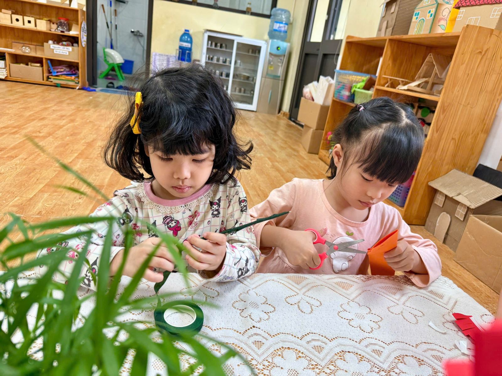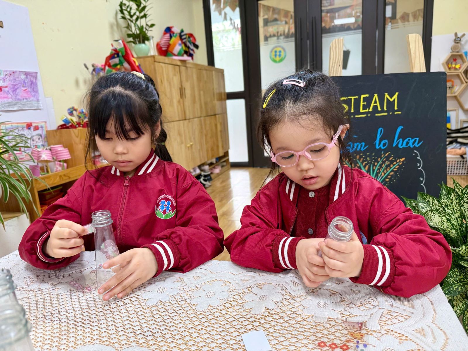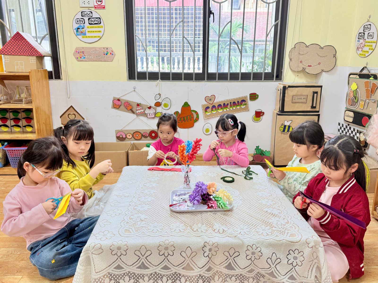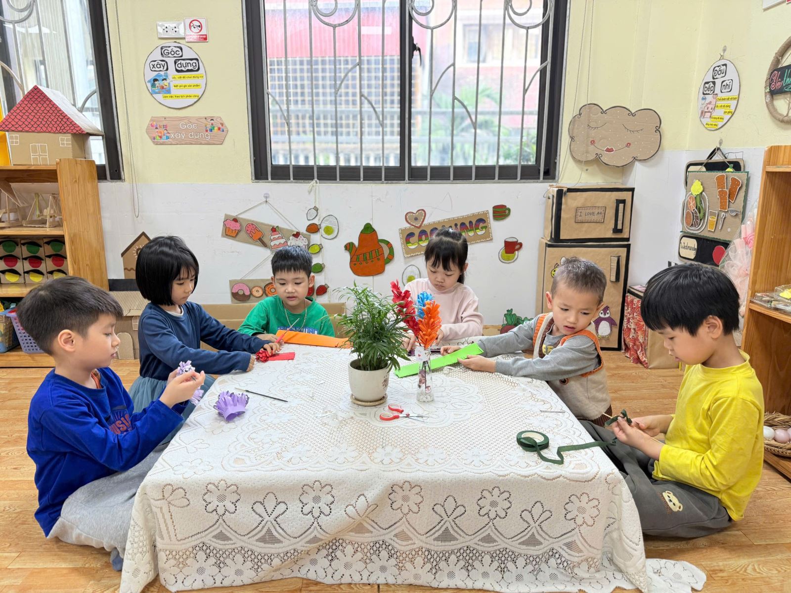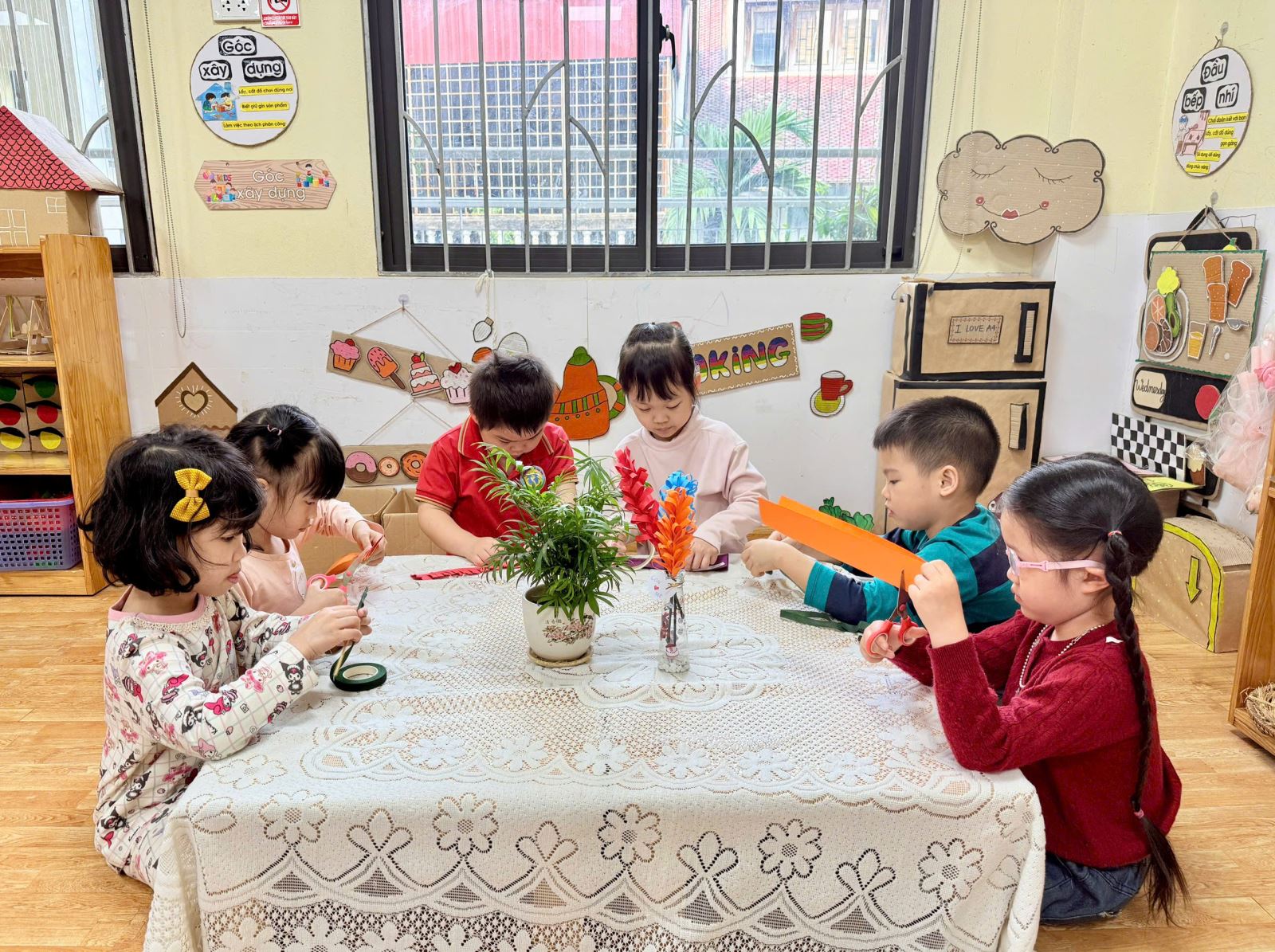 Từ những vật liệu quen thuộc, gần gũi như chai nhựa, giấy màu, dây ruy băng hay những mảnh giấy trang trí xinh xắn, dưới sự hướng dẫn nhẹ nhàng của cô giáo, các bé đã say mê sáng tạo nên những chiếc lọ hoa nhỏ nhắn, đầy màu sắc. Đôi bàn tay bé xíu tỉ mỉ dán từng chi tiết, lựa chọn từng gam màu yêu thích, nâng niu sản phẩm của mình với niềm vui và sự háo hức. Mỗi chiếc lọ hoa là một ý tưởng ngộ nghĩnh, một nét sáng tạo rất riêng và cũng là một món quà chứa đựng biết bao tình cảm trong trẻo của các con.