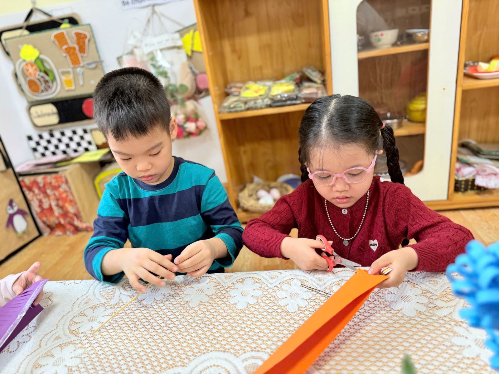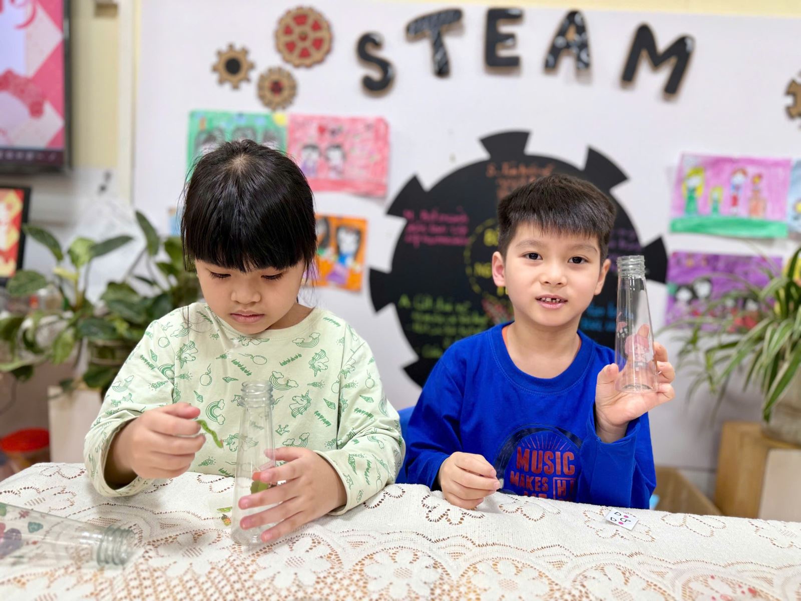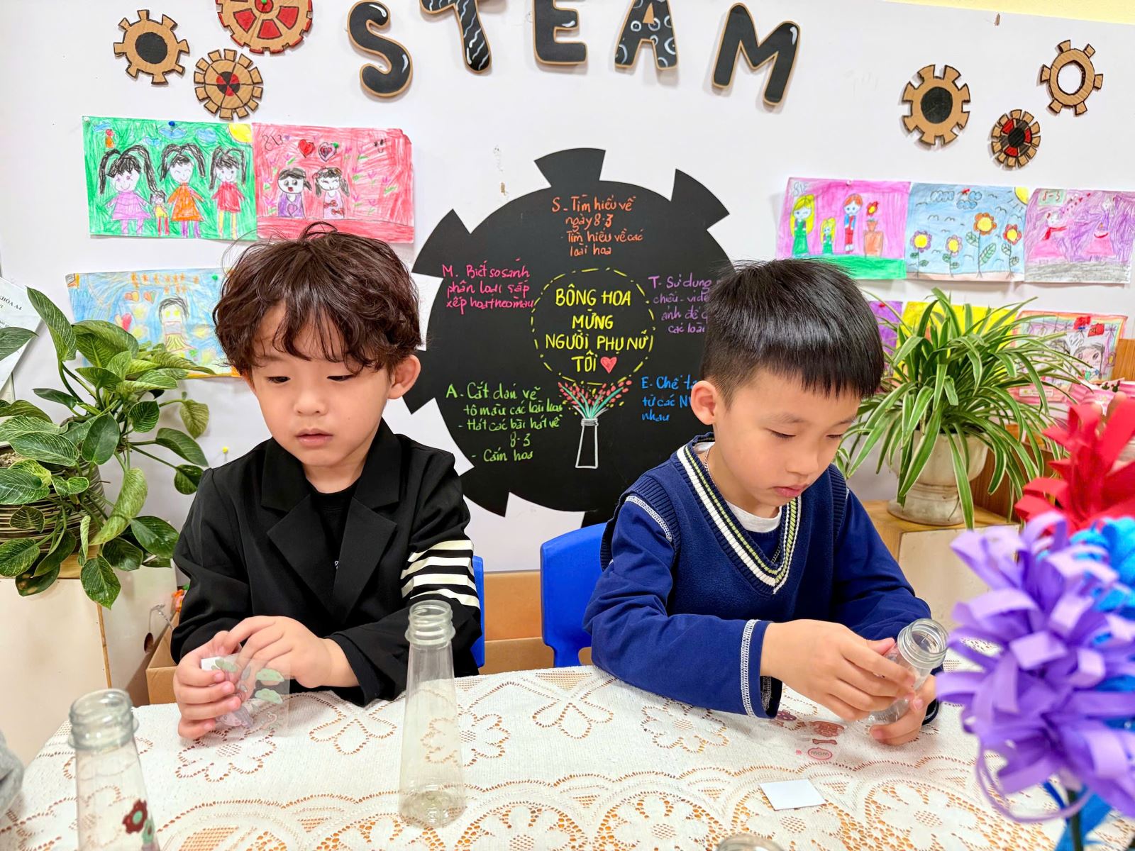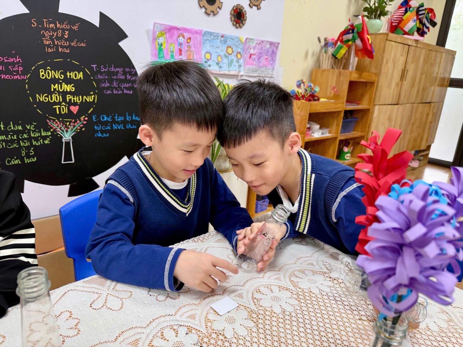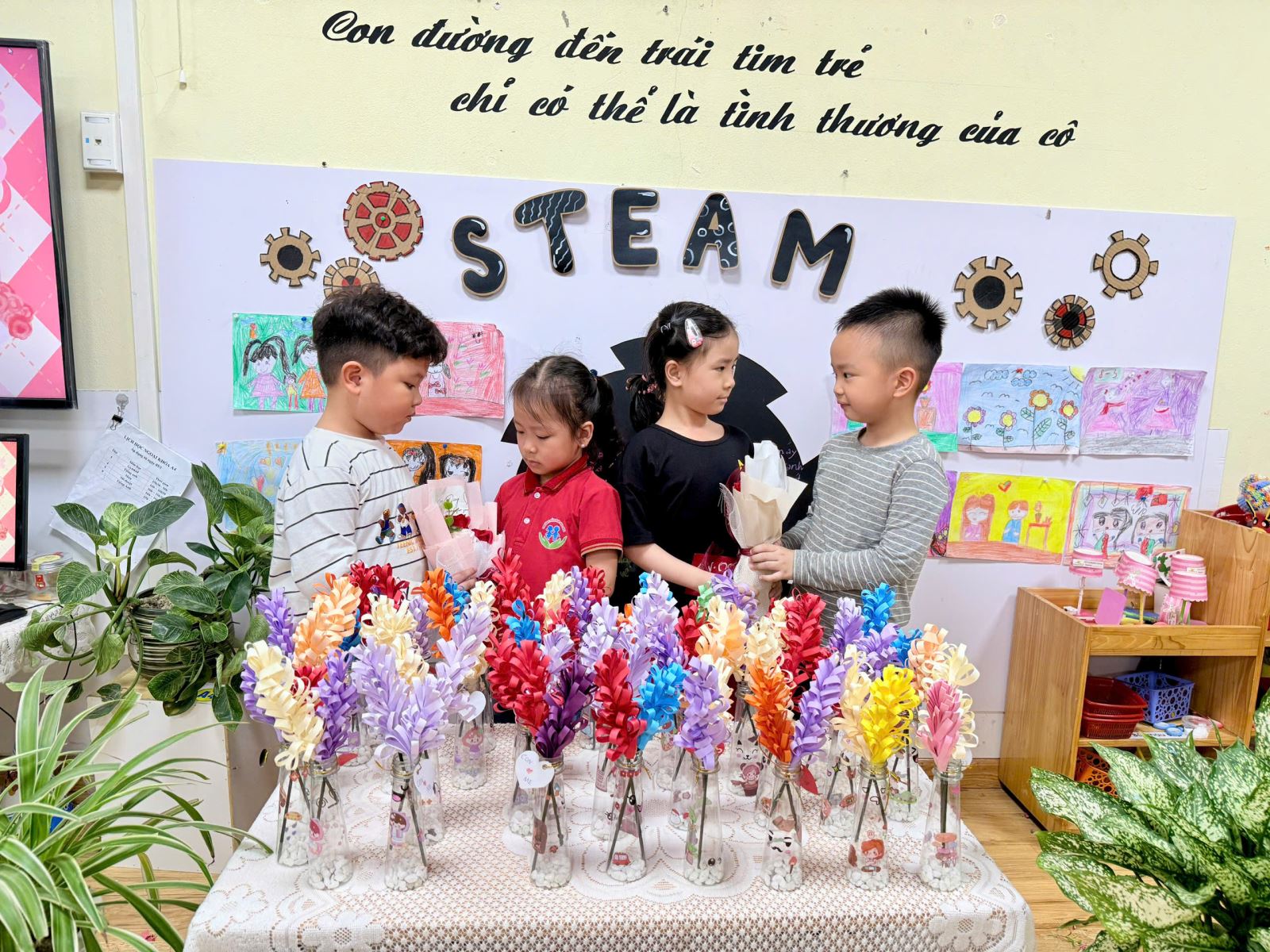 Niềm vui hiện rõ trên từng gương mặt khi các bé tưởng tượng đến khoảnh khắc được mang món quà do chính tay mình làm ra để tặng bà, tặng mẹ. Những chiếc lọ hoa tuy còn mộc mạc, giản dị nhưng lại chứa đựng cả một bầu trời yêu thương – thứ tình cảm chân thành và hồn nhiên nhất của tuổi thơ.