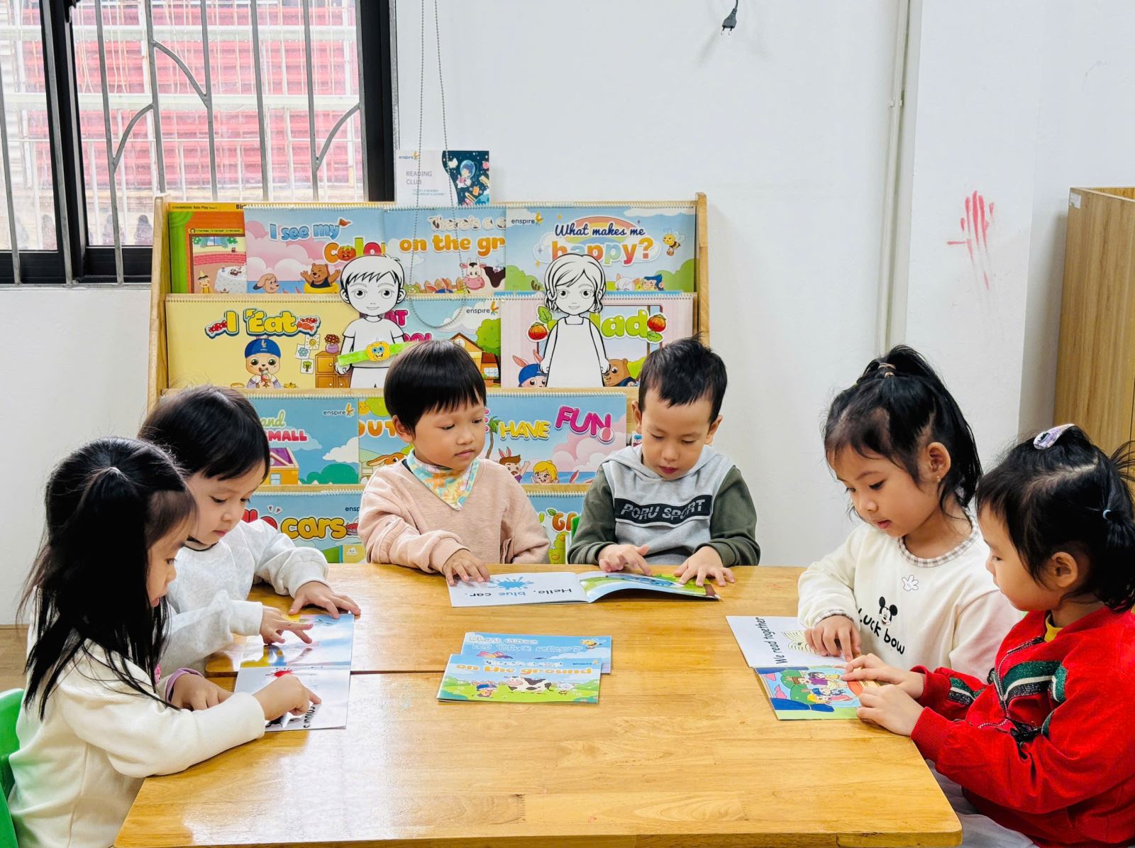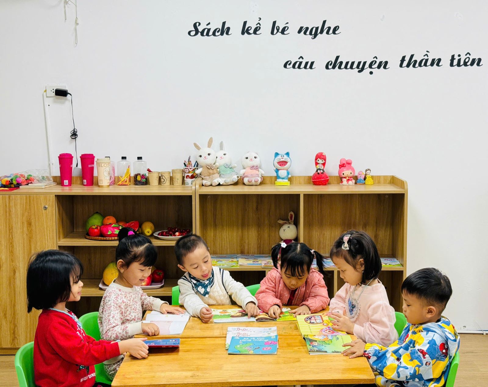 Tại đây, trẻ được tiếp cận với những cuốn sách tranh đa dạng, đầy màu sắc, phù hợp với độ tuổi mầm non. Không gian thư viện được bố trí mở, ấm áp và gần gũi, giúp trẻ dễ dàng lựa chọn cuốn sách mình thích, biết cách lật mở nhẹ nhàng và giữ gìn sách đúng cách.