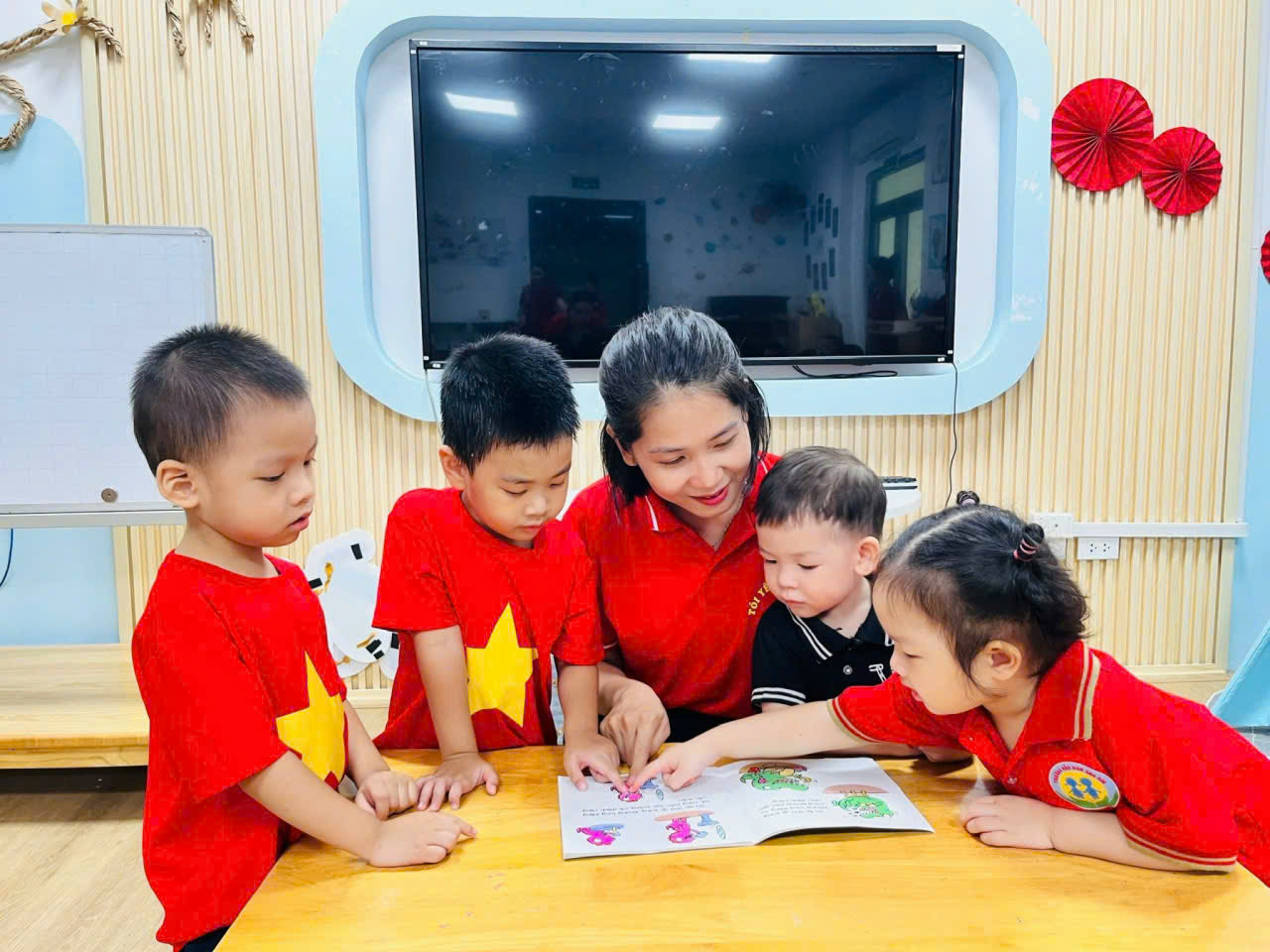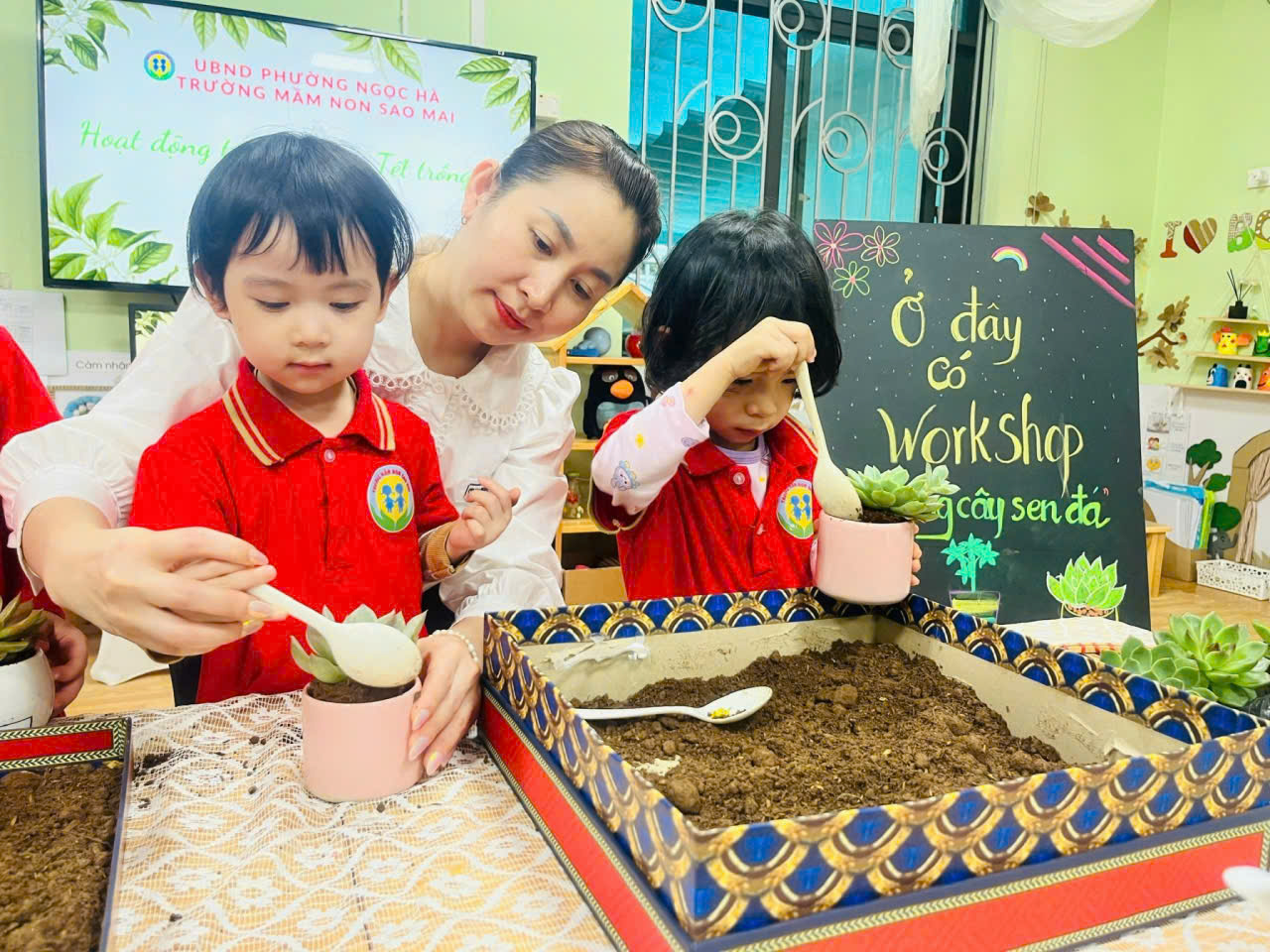 Trong không gian ấm áp của lớp học, các bé được cùng cô đọc những cuốn sách hay, khám phá thế giới qua từng trang truyện đầy màu sắc. Không chỉ vậy, hoạt động trồng cây còn giúp các con học cách yêu thiên nhiên, biết chăm sóc và nâng niu sự sống từ những điều nhỏ bé nhất.