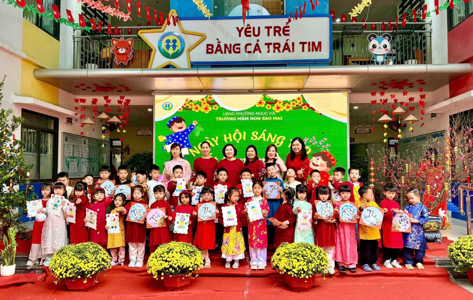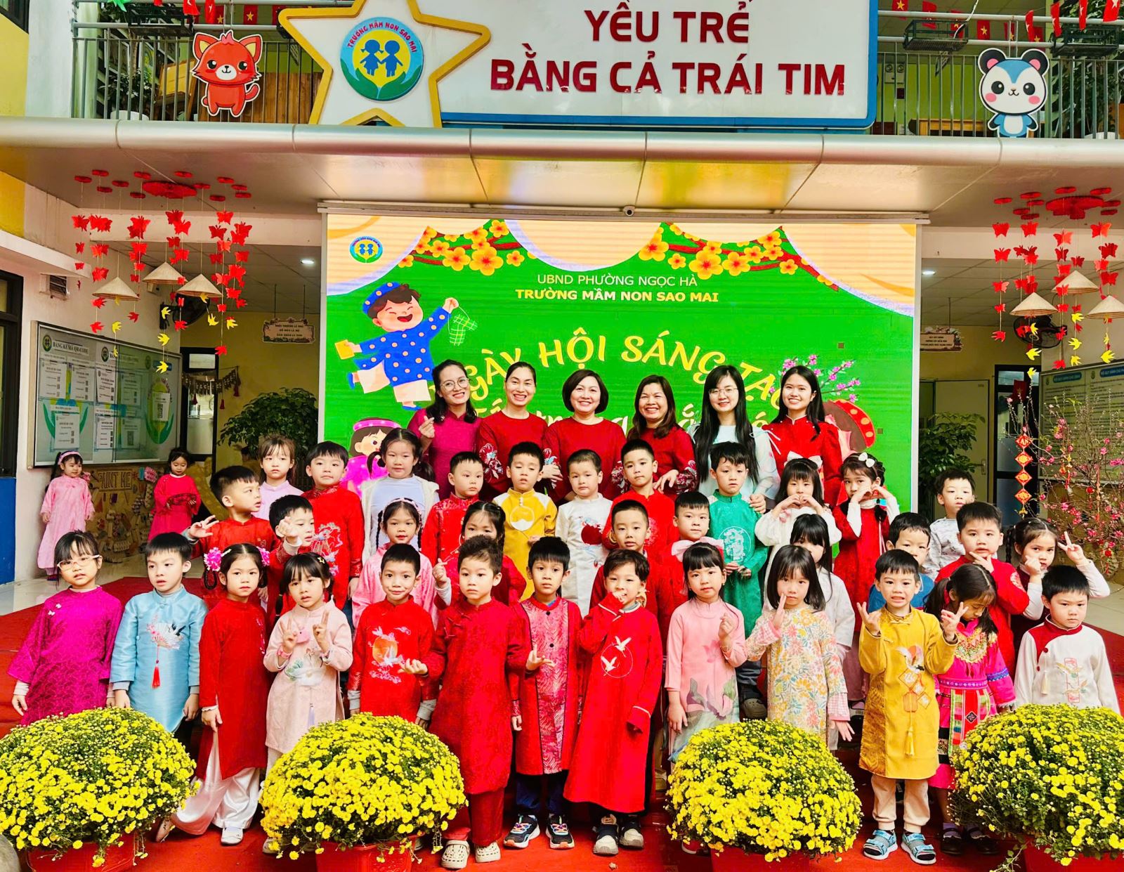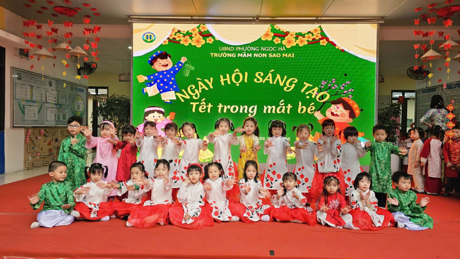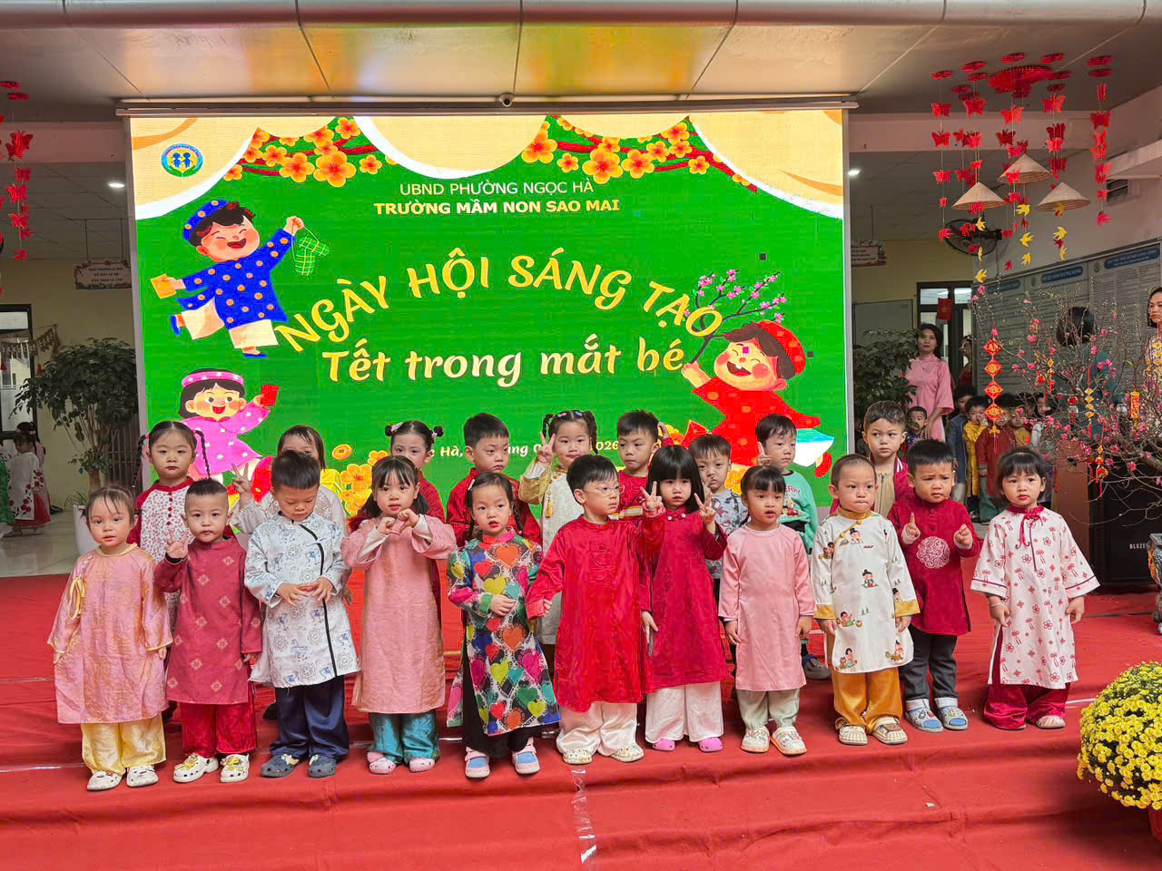Với mong muốn giúp trẻ hiểu và cảm nhận Tết bằng chính trải nghiệm của mình, nằm trong chuỗi các hoạt động chào xuân Bính Ngọ, trường Mầm non Sao Mai đã tổ chức chương trình “Ngày hội sáng tạo” với chủ đề “Tết trong mắt bé” – một ngày hội ngập tràn sắc xuân, tiếng cười và những hoạt động giàu ý nghĩa giáo dục.