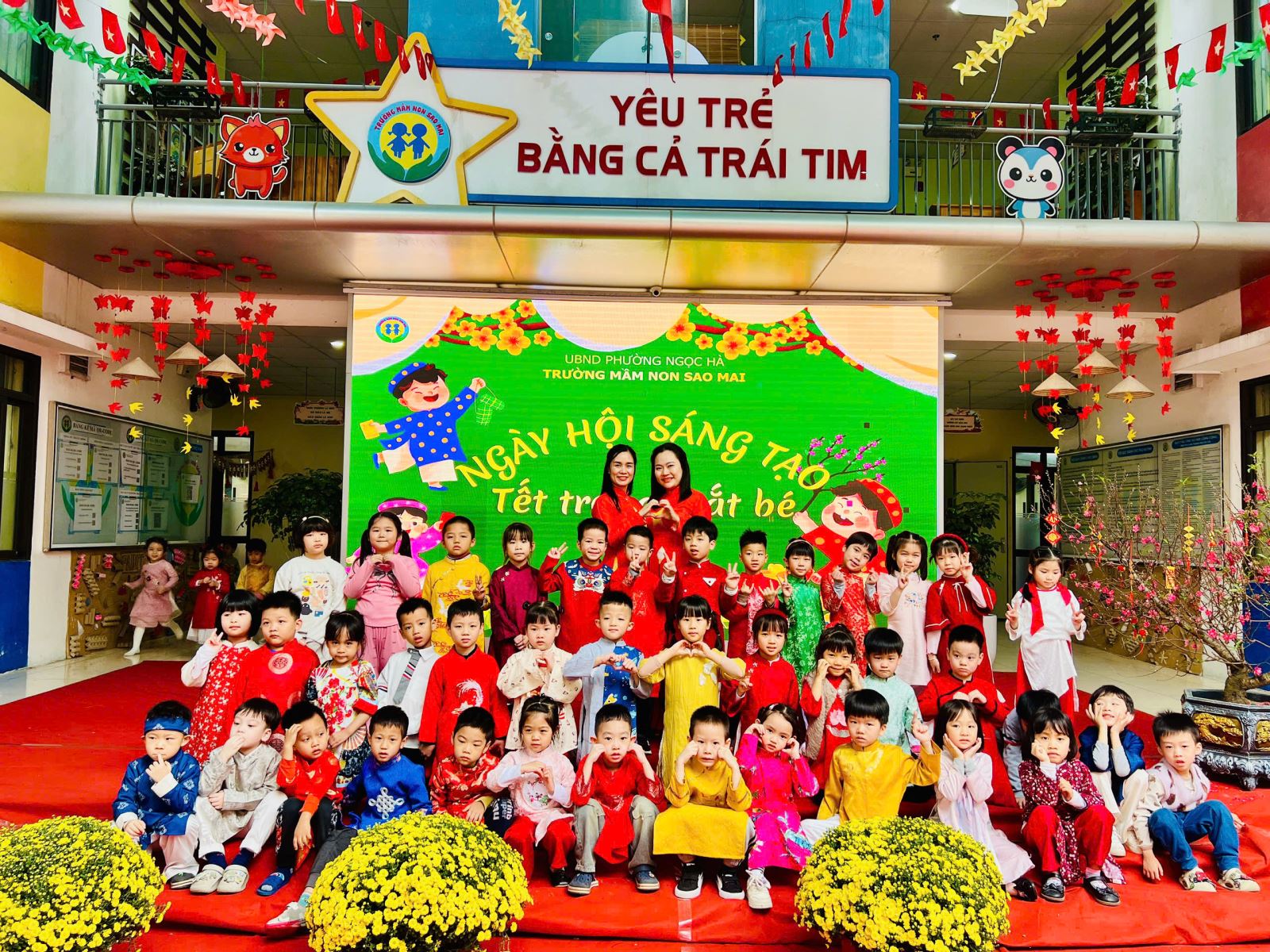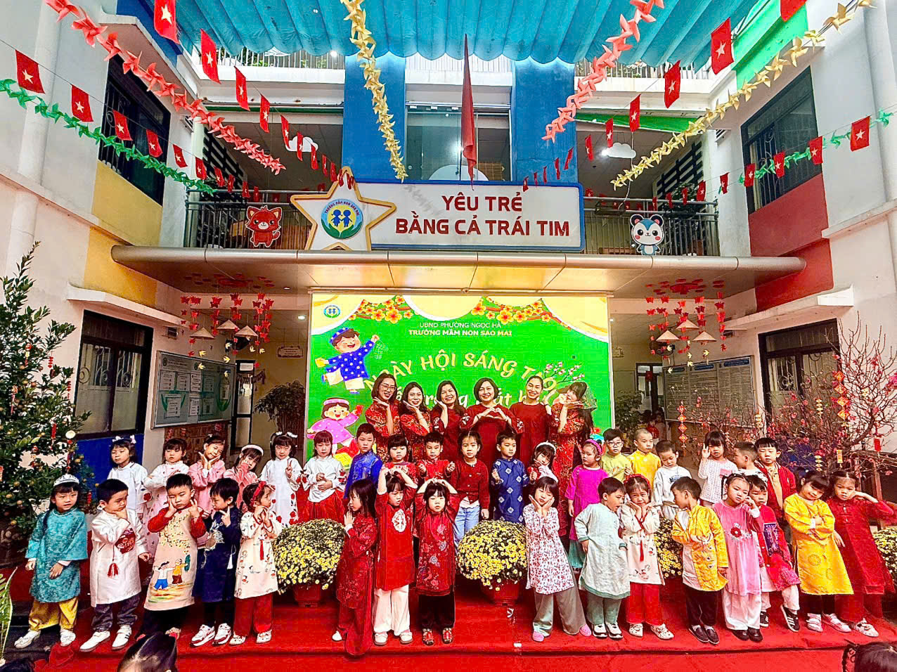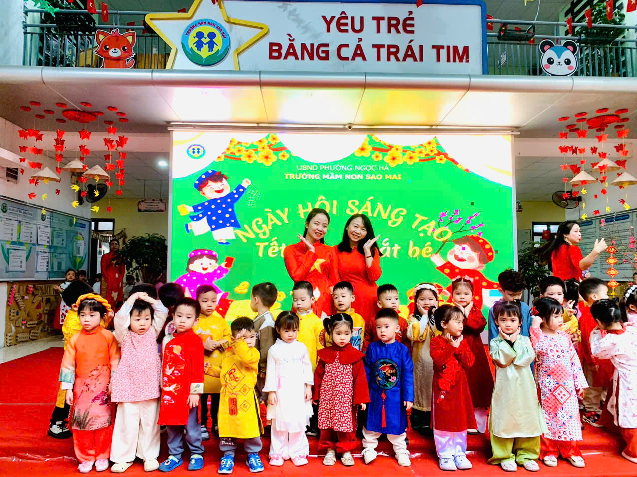 Với mong muốn giúp trẻ hiểu và cảm nhận Tết bằng chính trải nghiệm của mình, nằm trong chuỗi các hoạt động chào xuân Bính Ngọ, trường Mầm non Sao Mai đã tổ chức chương trình “Ngày hội sáng tạo” với chủ đề “Tết trong mắt bé” – một ngày hội ngập tràn sắc xuân, tiếng cười và những hoạt động giàu ý nghĩa giáo dục.