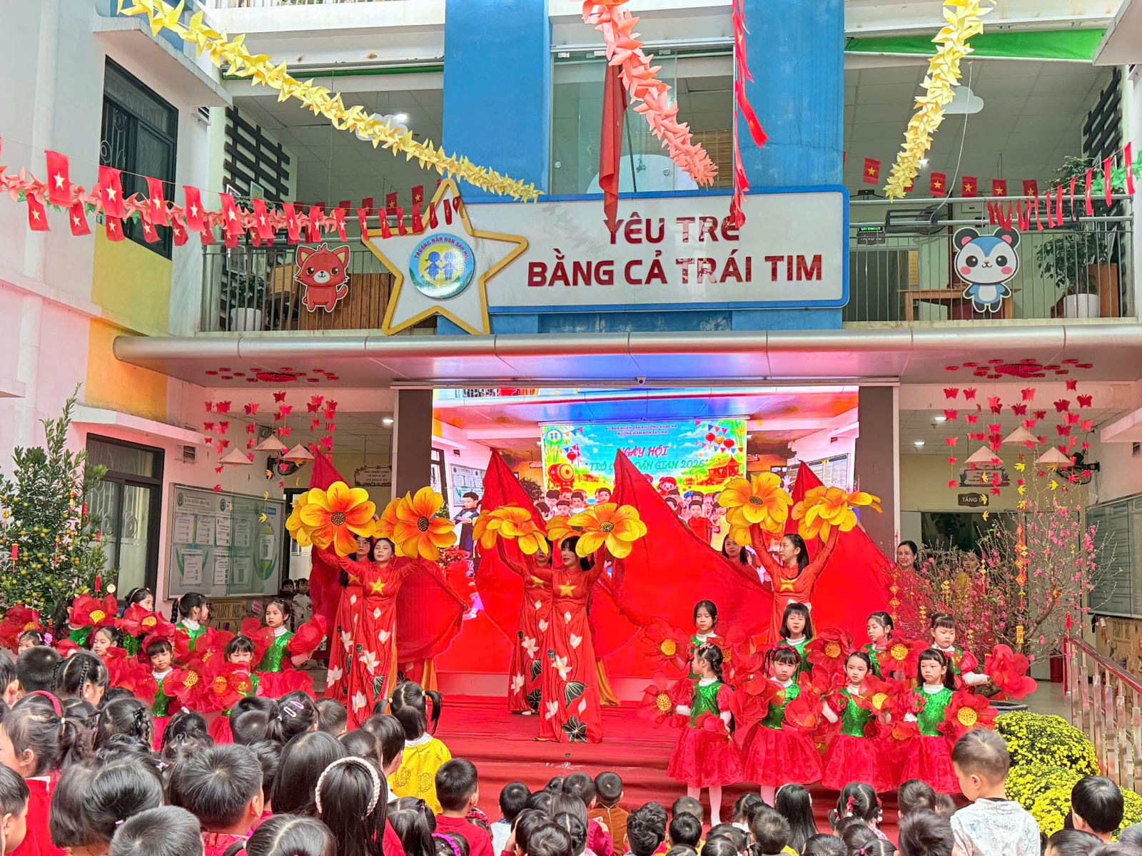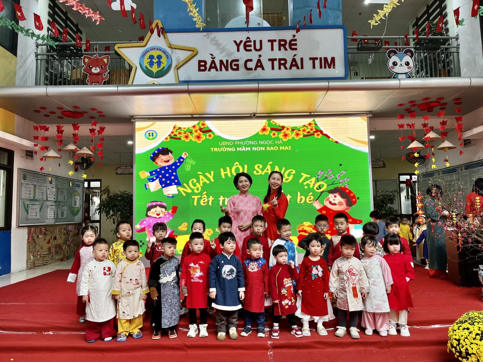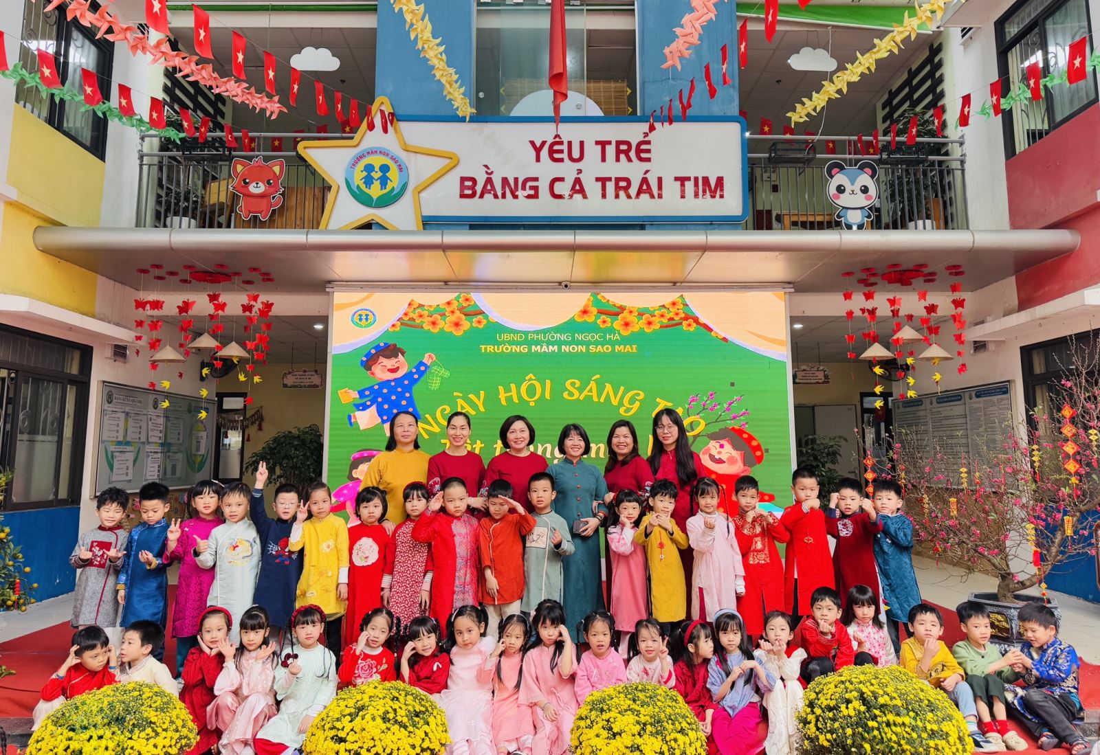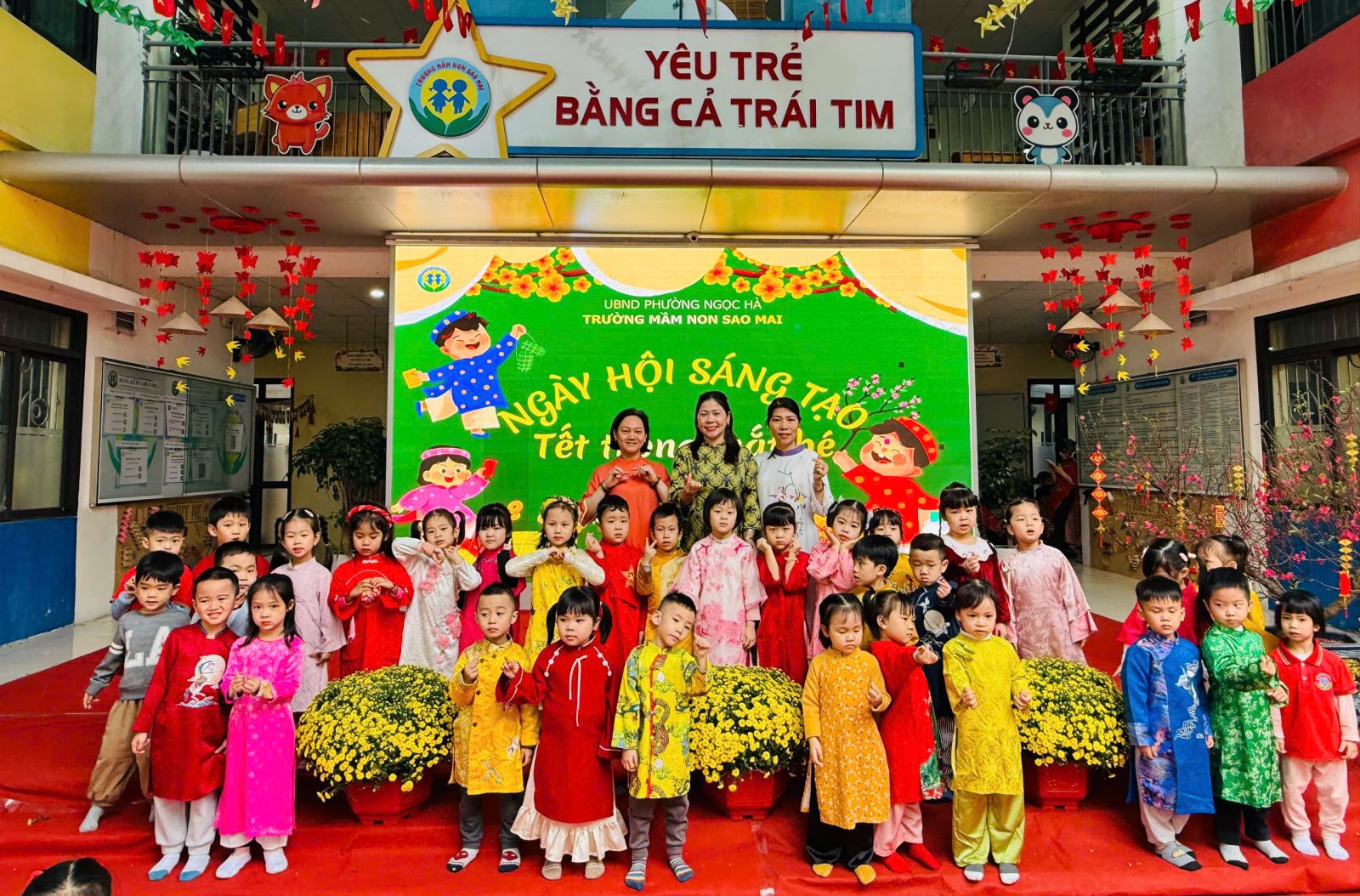 Với mong muốn giúp trẻ hiểu và cảm nhận Tết bằng chính trải nghiệm của mình, nằm trong chuỗi các hoạt động chào xuân Bính Ngọ, trường Mầm non Sao Mai đã tổ chức chương trình “Ngày hội sáng tạo” với chủ đề “Tết trong mắt bé” – một ngày hội ngập tràn sắc xuân, tiếng cười và những hoạt động giàu ý nghĩa giáo dục.
