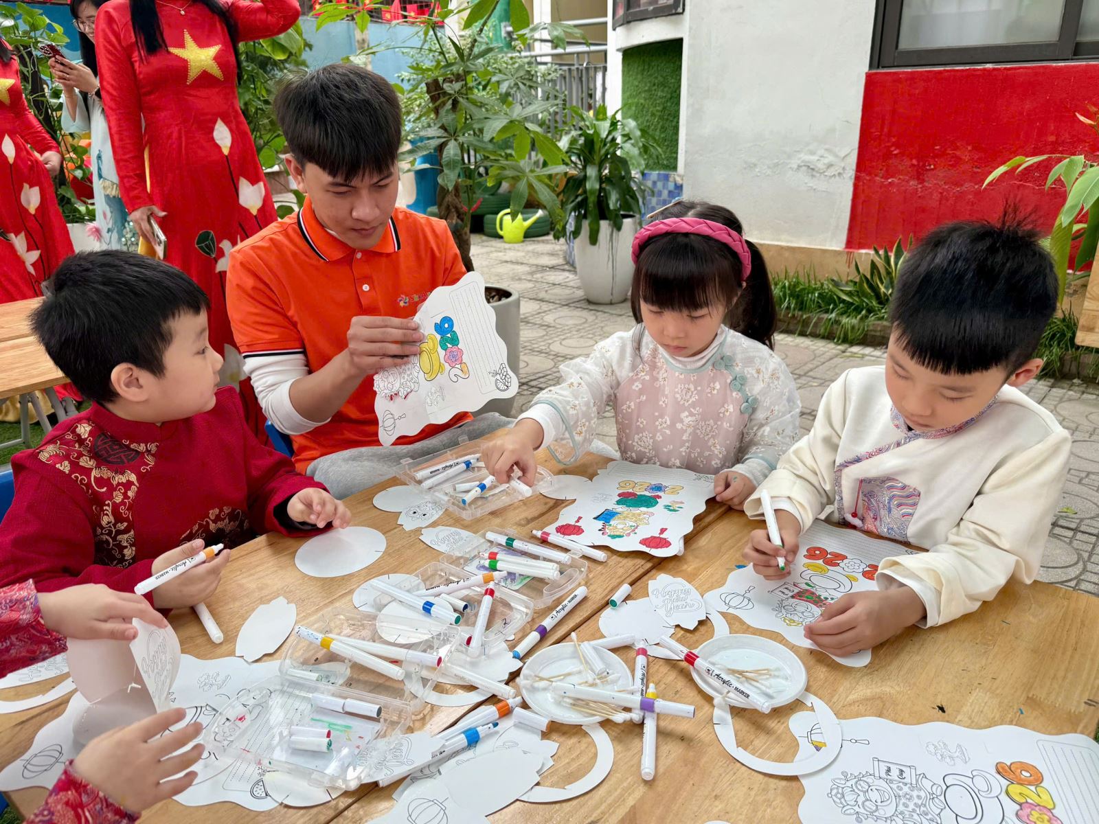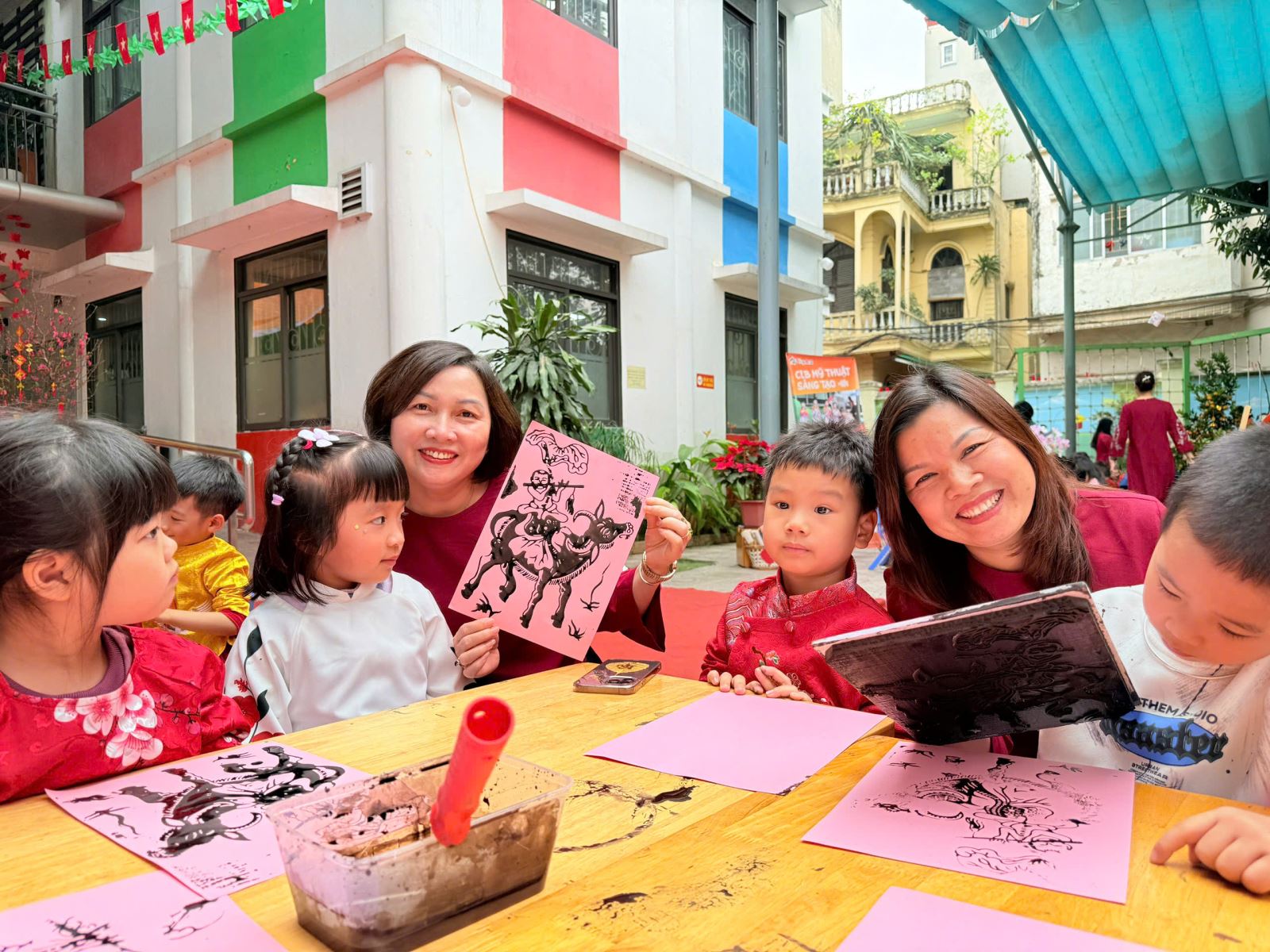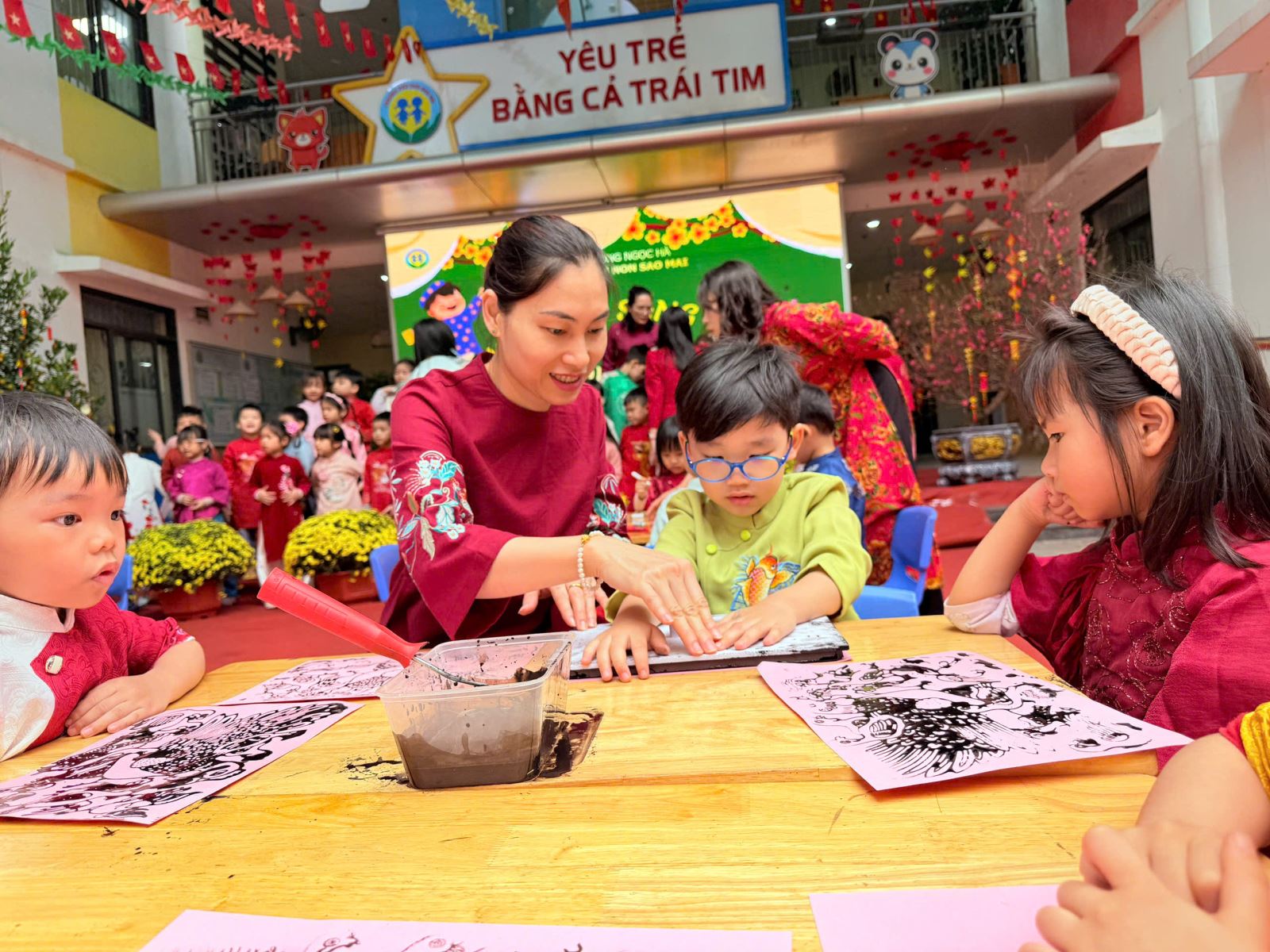 Các bé hào hứng thiết kế những chiếc đèn lồng Tết rực rỡ sắc màu, gửi gắm trong đó niềm vui, sự háo hức và những ước mong ngây thơ khi xuân về. Hoạt động in tranh Đông Hồ mang đến cho trẻ cơ hội làm quen với dòng tranh dân gian truyền thống, để từ từng khuôn in, từng mảng màu giản dị, các con bước đầu cảm nhận được vẻ đẹp văn hóa dân tộc theo cách rất tự nhiên.