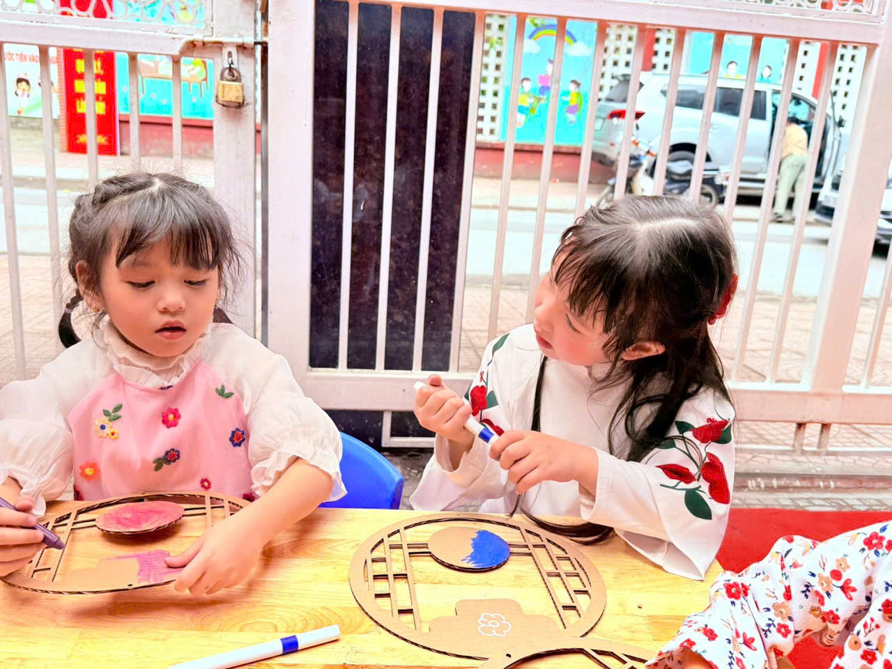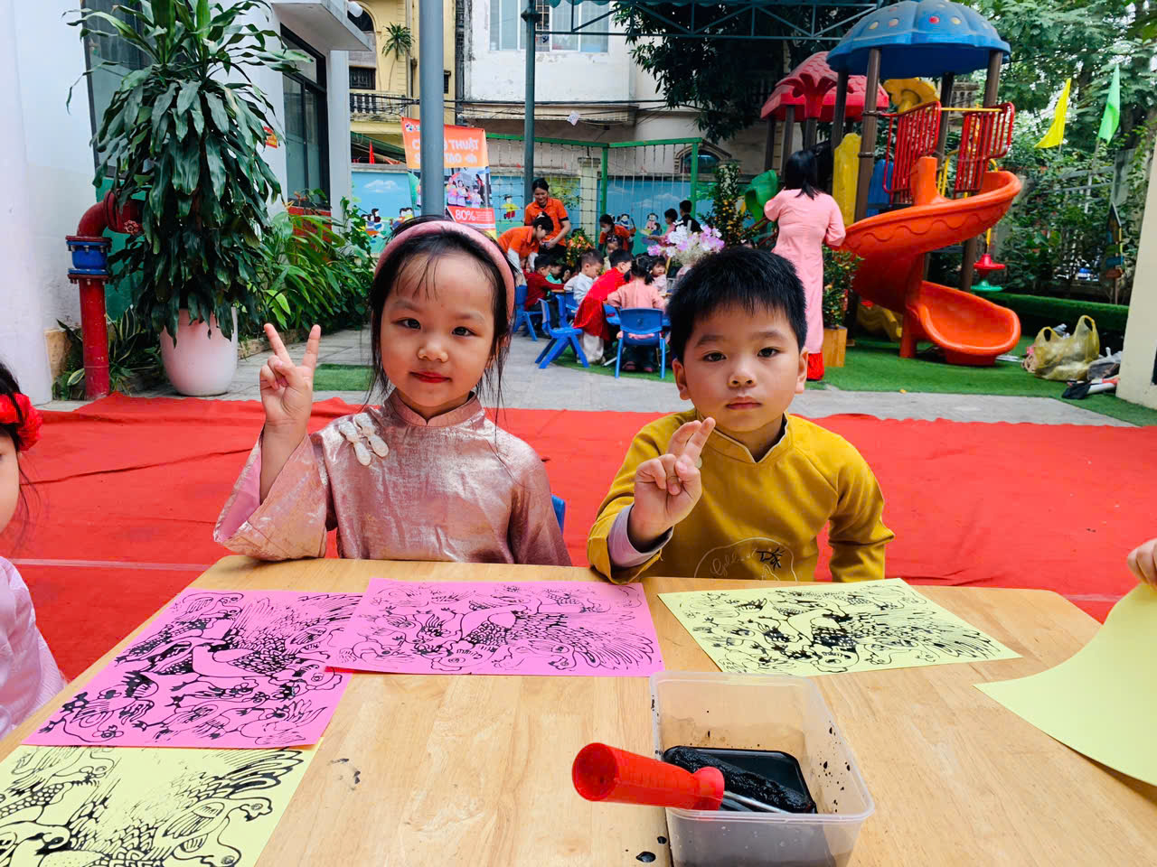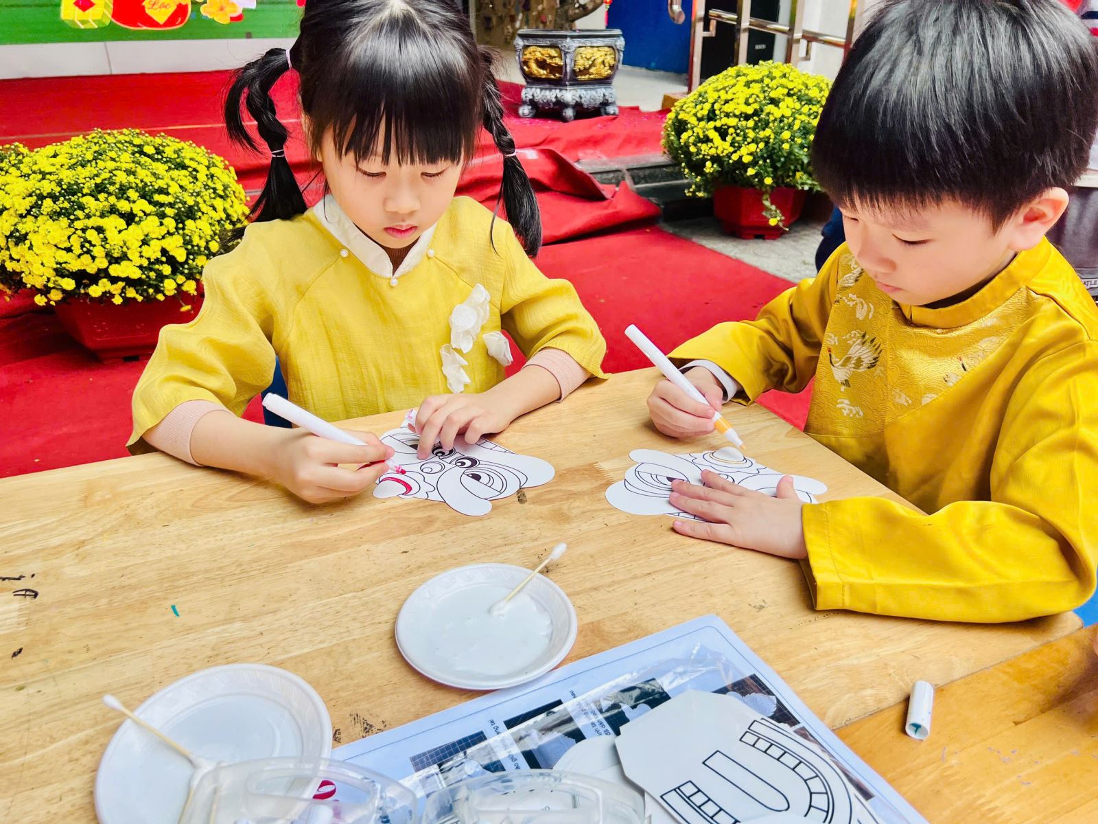 Các bé hào hứng thiết kế những chiếc đèn lồng Tết rực rỡ sắc màu, gửi gắm trong đó niềm vui, sự háo hức và những ước mong ngây thơ khi xuân về. Hoạt động in tranh Đông Hồ mang đến cho trẻ cơ hội làm quen với dòng tranh dân gian truyền thống, để từ từng khuôn in, từng mảng màu giản dị, các con bước đầu cảm nhận được vẻ đẹp văn hóa dân tộc theo cách rất tự nhiên.
