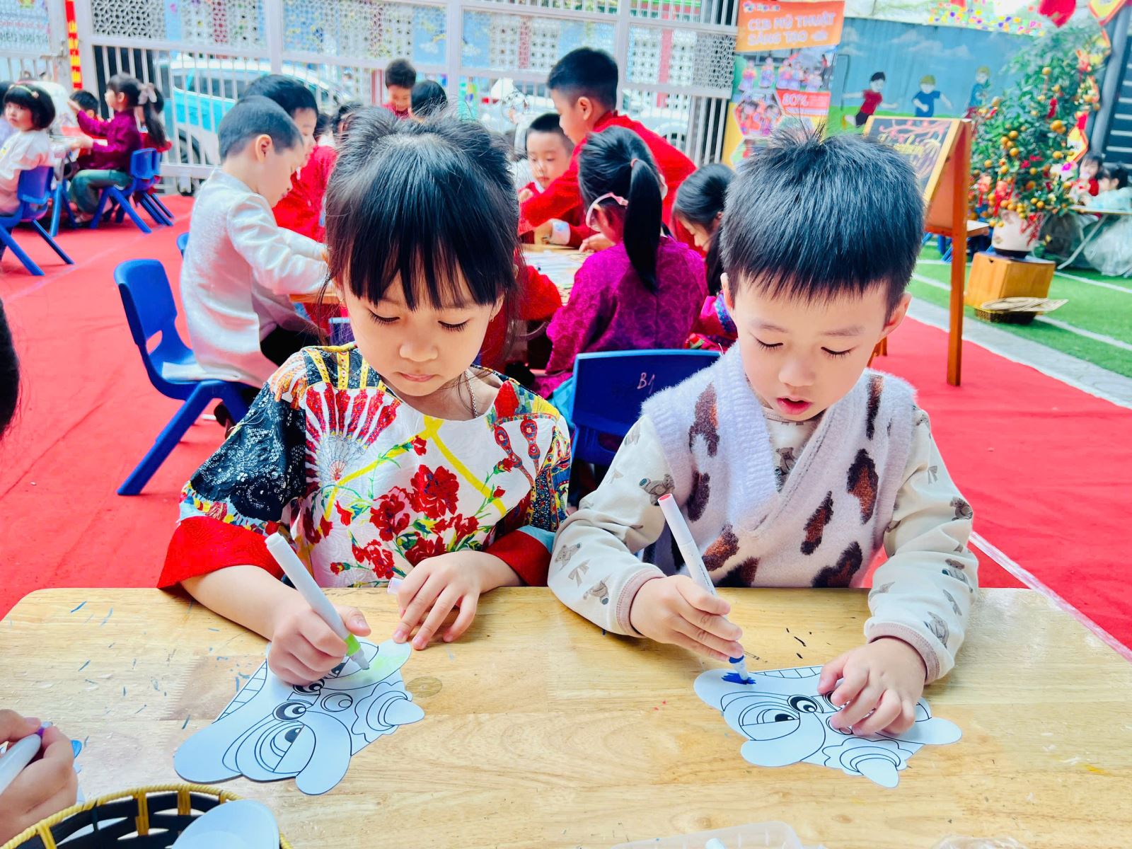 Không gian ngày hội càng thêm rộn ràng sắc xuân với các hoạt động dán hoa đào, hoa mai, tạo hình đầu lân – những hình ảnh thân quen gắn liền với Tết Nguyên đán. Mỗi sản phẩm là một “cái Tết trong mắt bé”, hồn nhiên, đáng yêu và đầy cảm xúc.