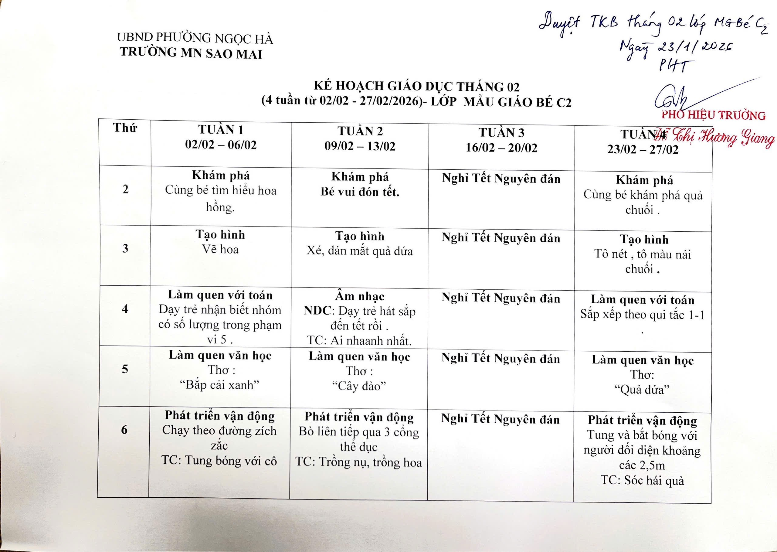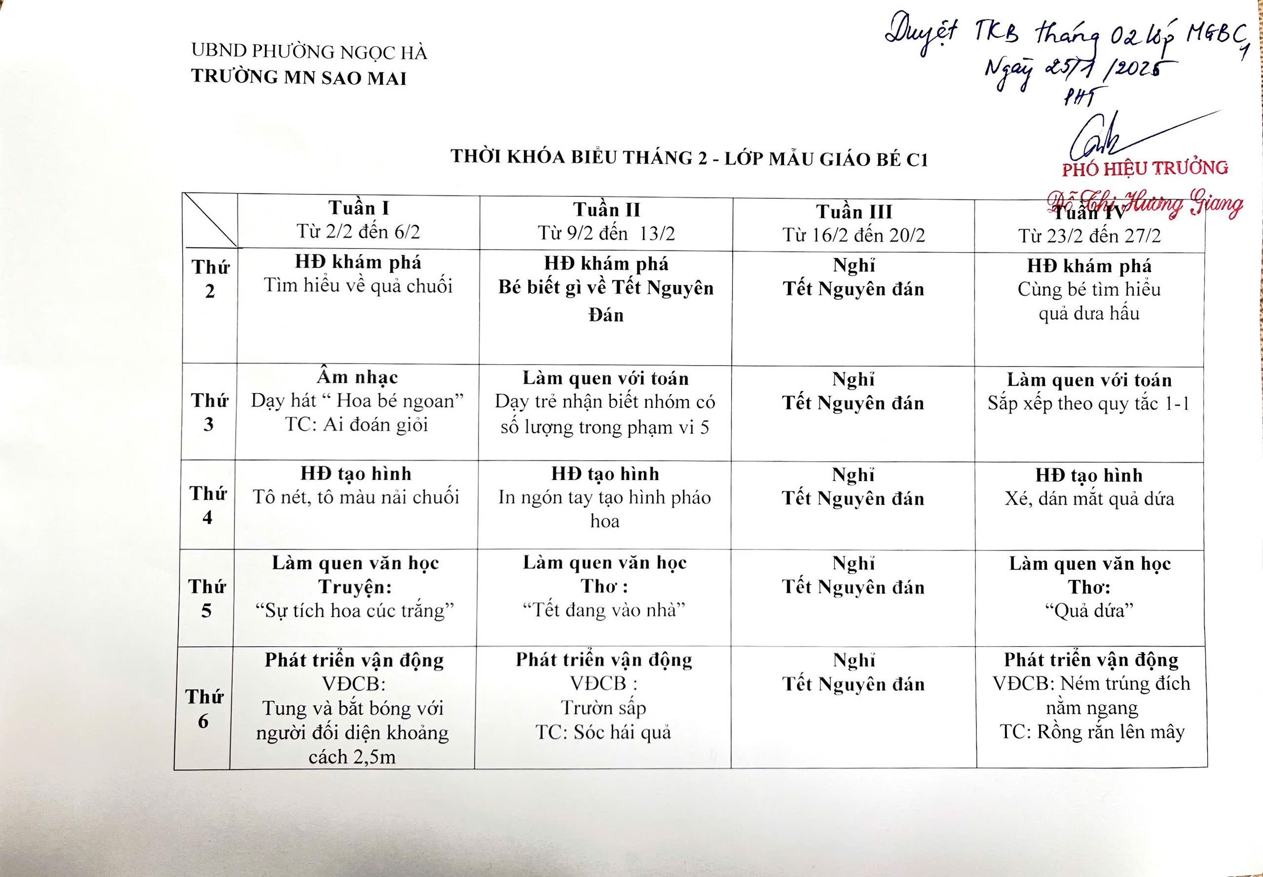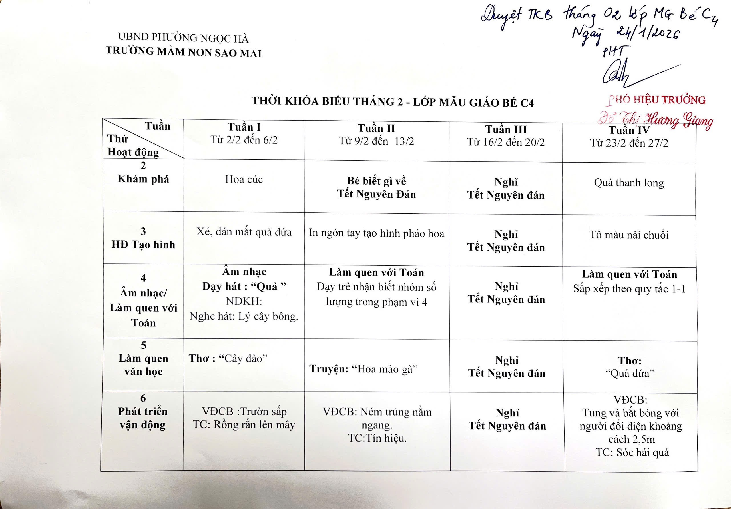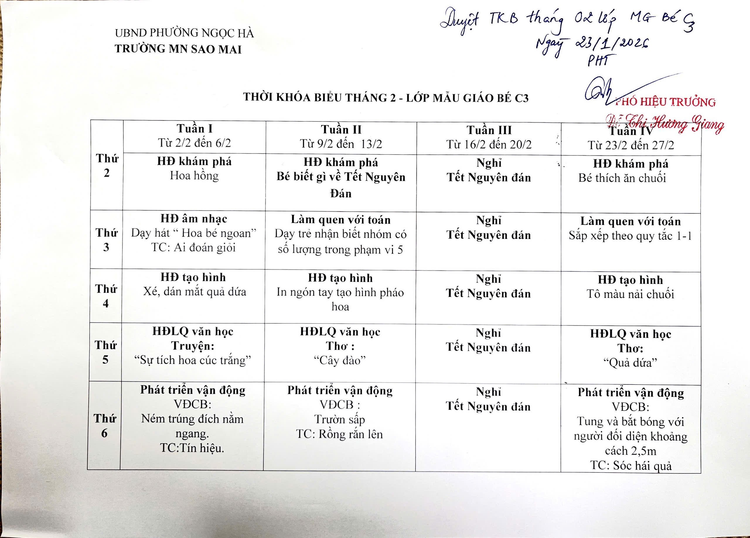 Trường Mầm non Sao Mai trân trọng gửi quý CMHS Thời khóa biểu tháng 2/2026 - Khối mẫu giáo bé, năm học 2025 - 2026.