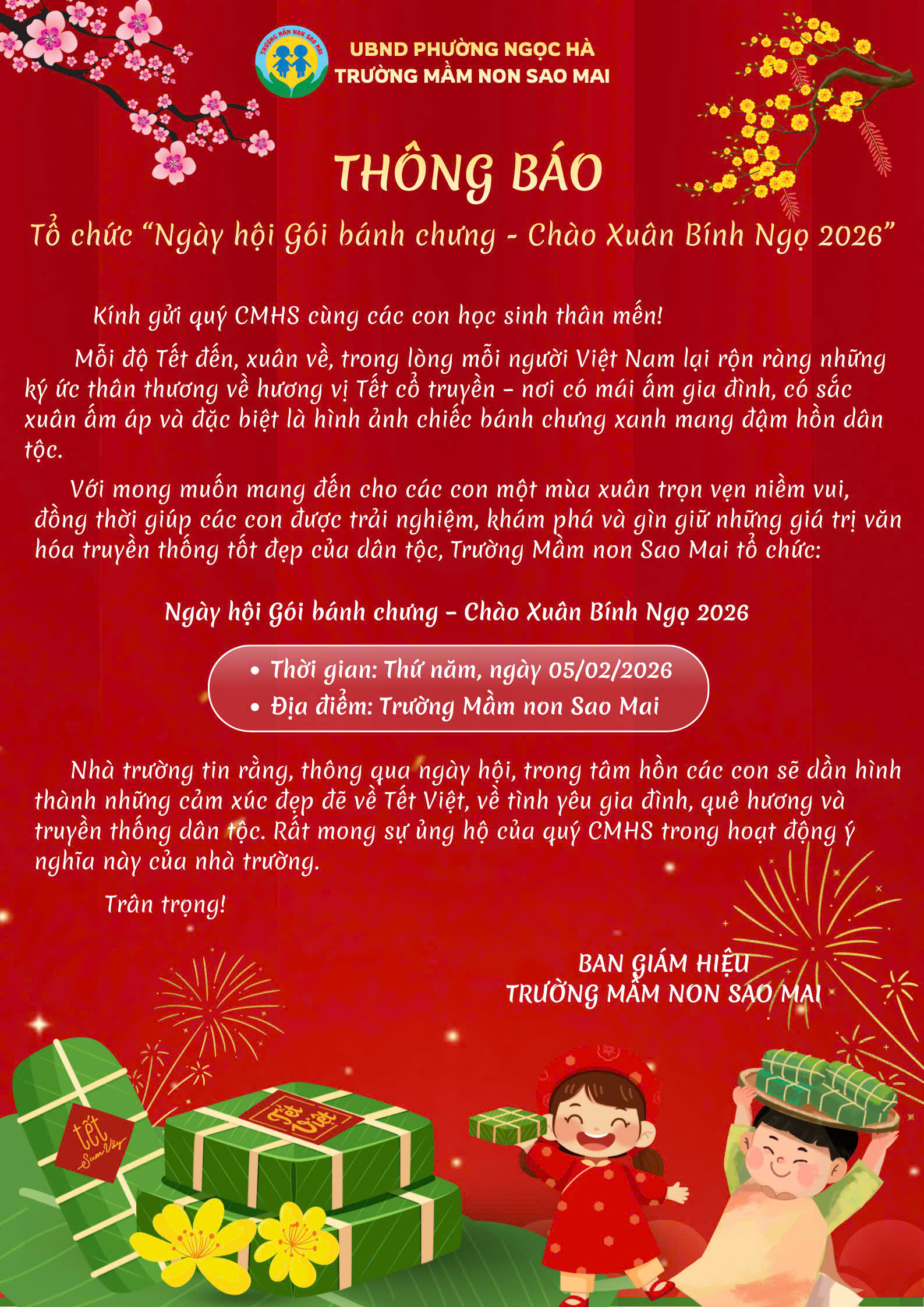Thông báo tổ chức "Ngày hội Gói bánh chưng - Chào Xuân Bính Ngọ 2026" của Trường Mầm non Sao Mai