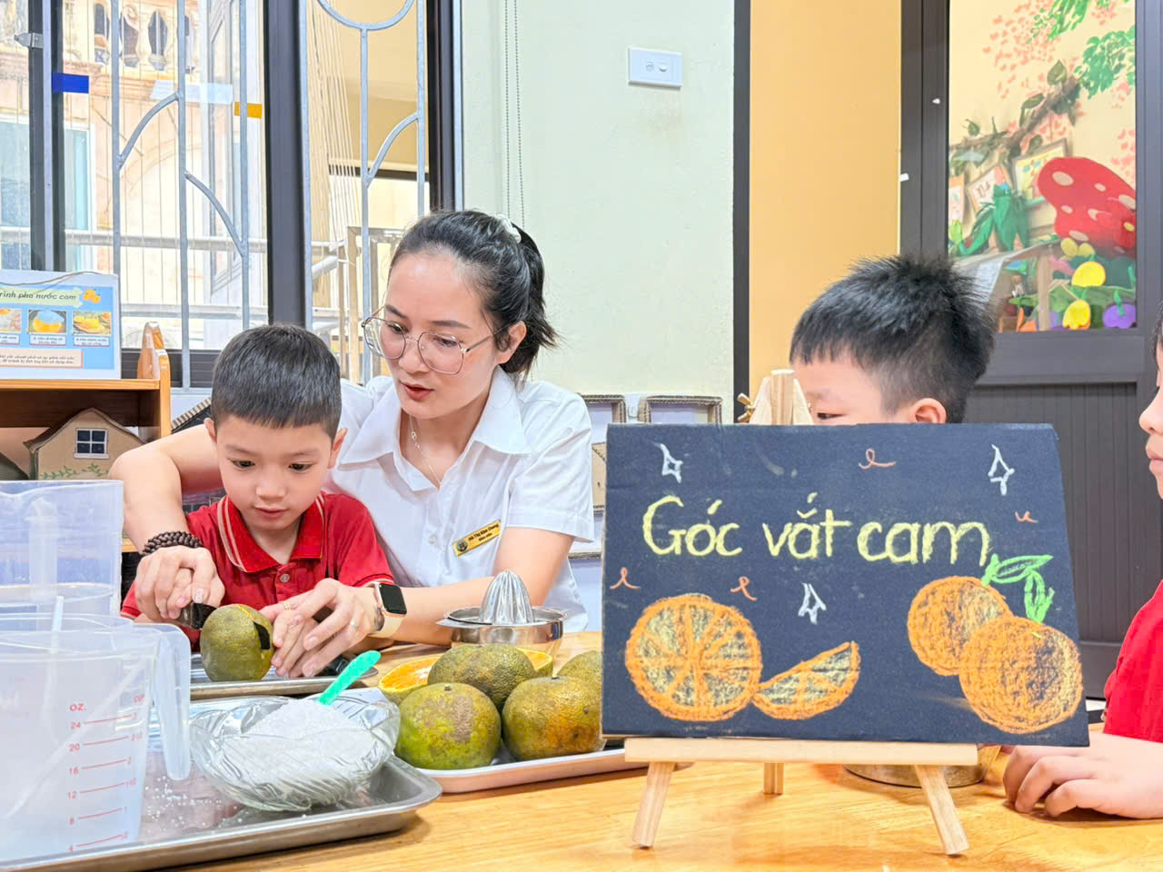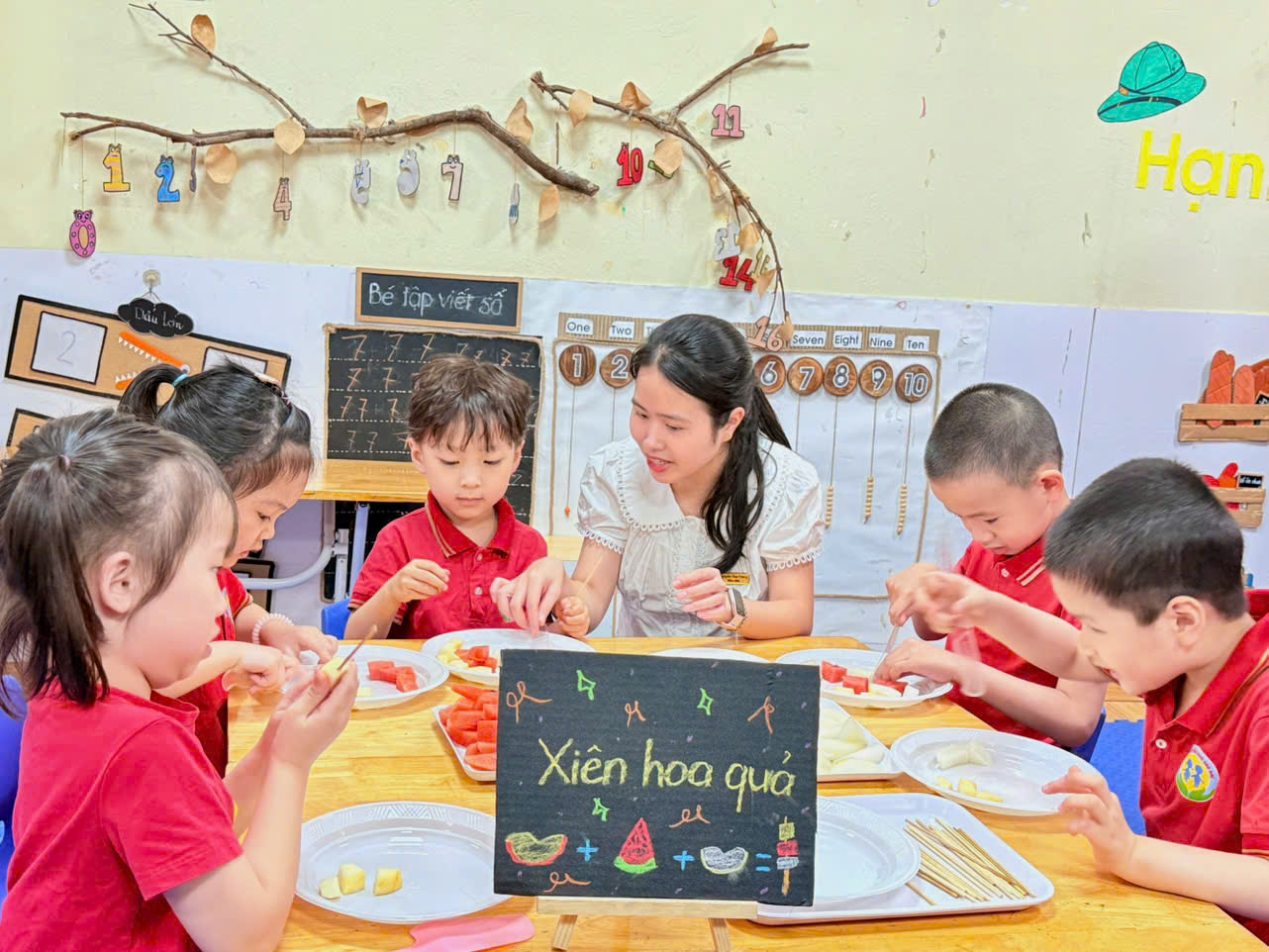 Sau những hoạt động vận động đầy hứng khởi, sinh viên tiếp tục được tìm hiểu cách tổ chức hoạt động góc "Bữa tiệc vui vẻ" tại lớp Mẫu giáo lớn A2. Giáo viên lớp đã bố trí các góc chơi khoa học, phù hợp với chủ đề, tạo điều kiện để trẻ được chủ động lựa chọn hoạt động, phát huy tính sáng tạo và khả năng hợp tác với bạn bè. Qua đó, sinh viên có thêm góc nhìn thực tế về vai trò của giáo viên trong việc định hướng, hỗ trợ và quan sát trẻ trong giờ chơi.
