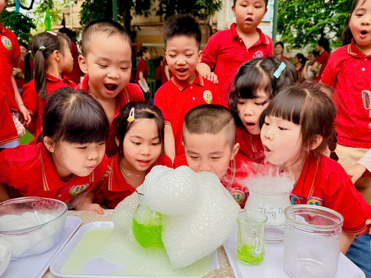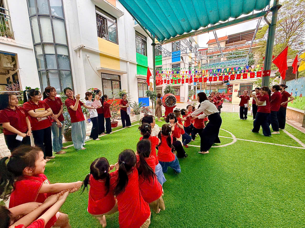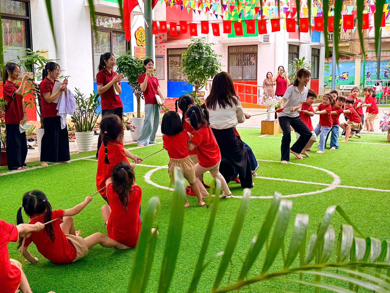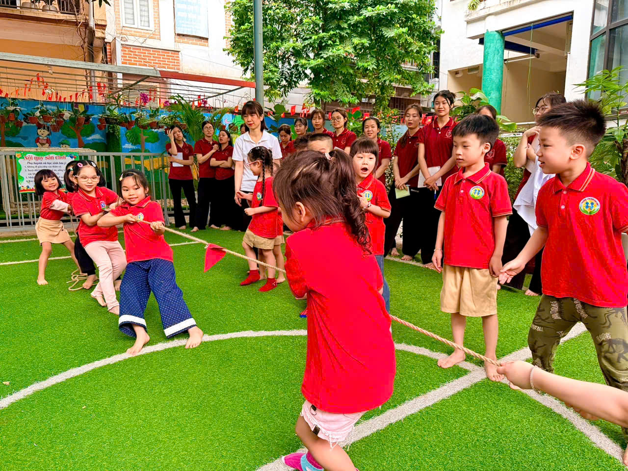 Tiếp nối hoạt động trong lớp, không gian sân trường trở thành nơi để sinh viên quan sát rõ hơn tinh thần học mà chơi, chơi mà học của trẻ thông qua các hoạt động ngoài trời tại lớp Mẫu giáo lớn A4. Dưới sự hướng dẫn của giáo viên Nguyễn Diệu Thúy – Nguyễn Thùy Linh, trẻ hào hứng tham gia hoạt động có chủ đích với nội dung thí nghiệm đá khô, trực tiếp quan sát những hiện tượng khoa học thú vị, qua đó khơi gợi trí tò mò và khả năng khám phá. Tiếp nối trò chơi vận động “Kéo co” sôi nổi, giúp trẻ rèn luyện thể lực, phản xạ nhanh nhẹn và tăng cường tinh thần đoàn kết.