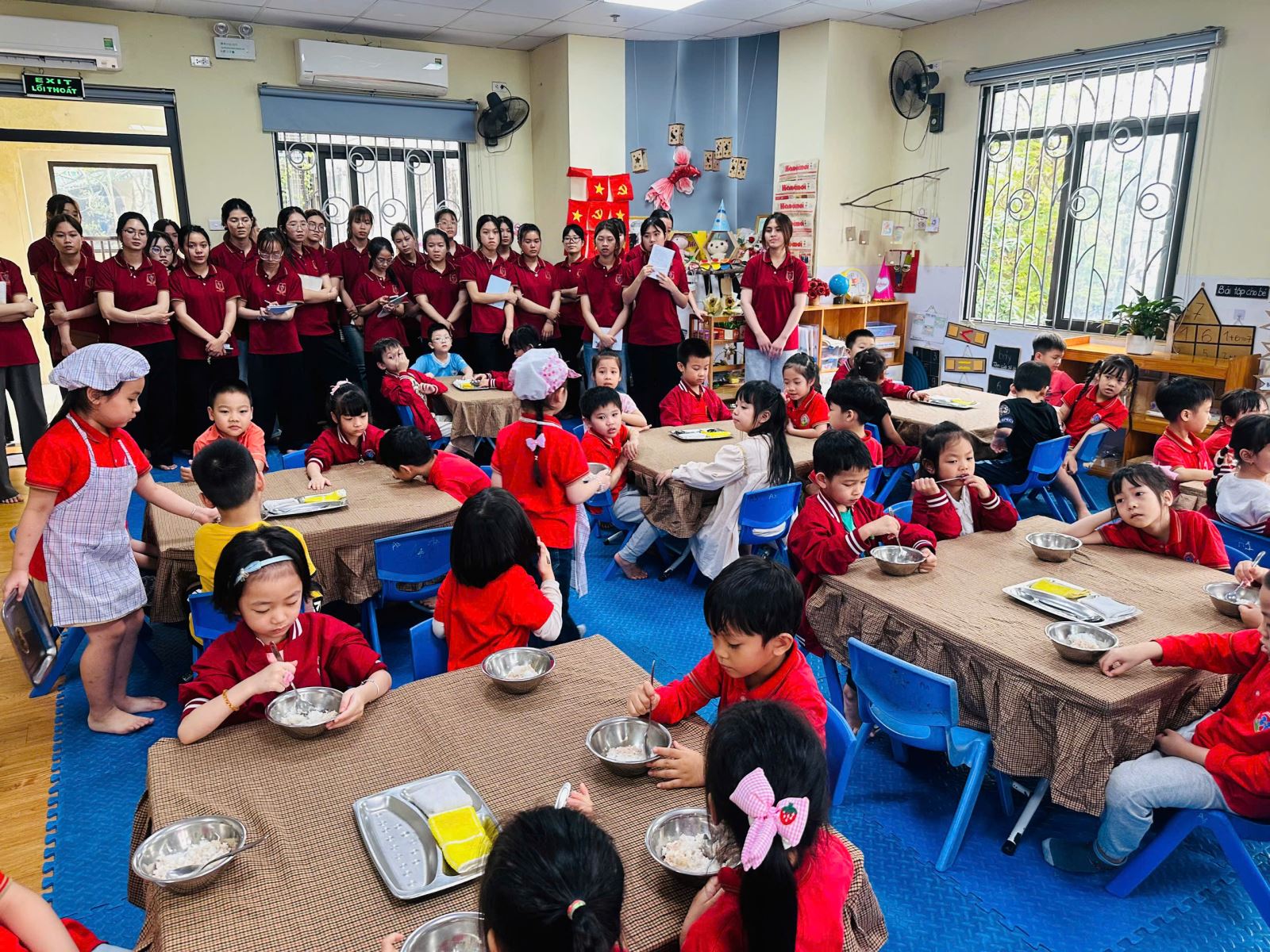 Không chỉ dừng lại ở các hoạt động học và chơi, sinh viên còn được theo dõi giờ ăn tại lớp Mẫu giáo lớn A1. Trong không khí ấm áp, nề nếp, trẻ được hướng dẫn thói quen ăn uống văn minh, tự lập, đảm bảo dinh dưỡng và cảm thấy thoải mái, vui vẻ trong từng bữa ăn. Đây là một trong những hoạt động thường nhật nhưng đóng vai trò quan trọng trong việc hình thành kỹ năng sống cho trẻ.
