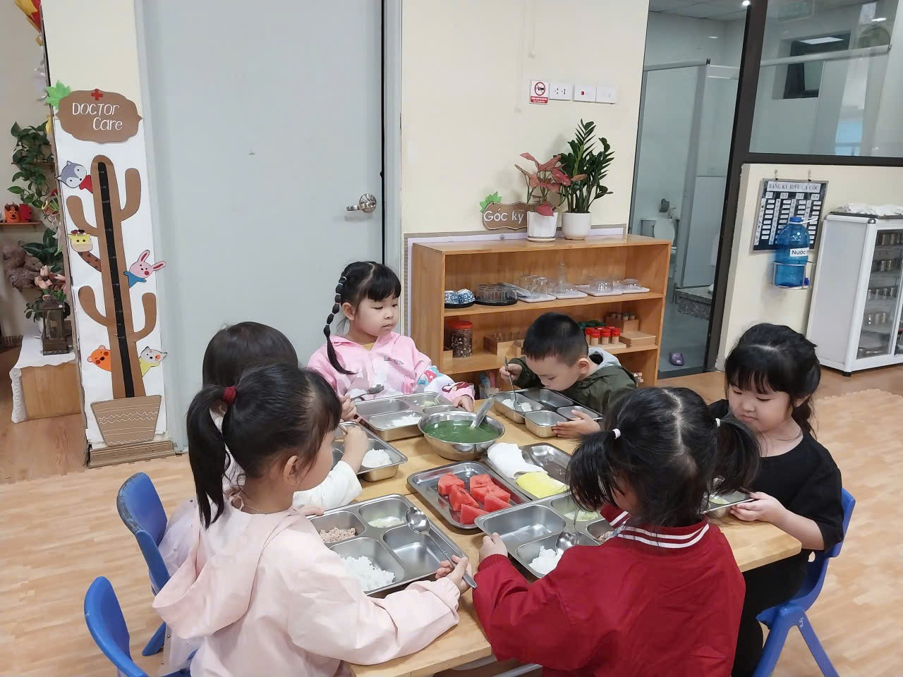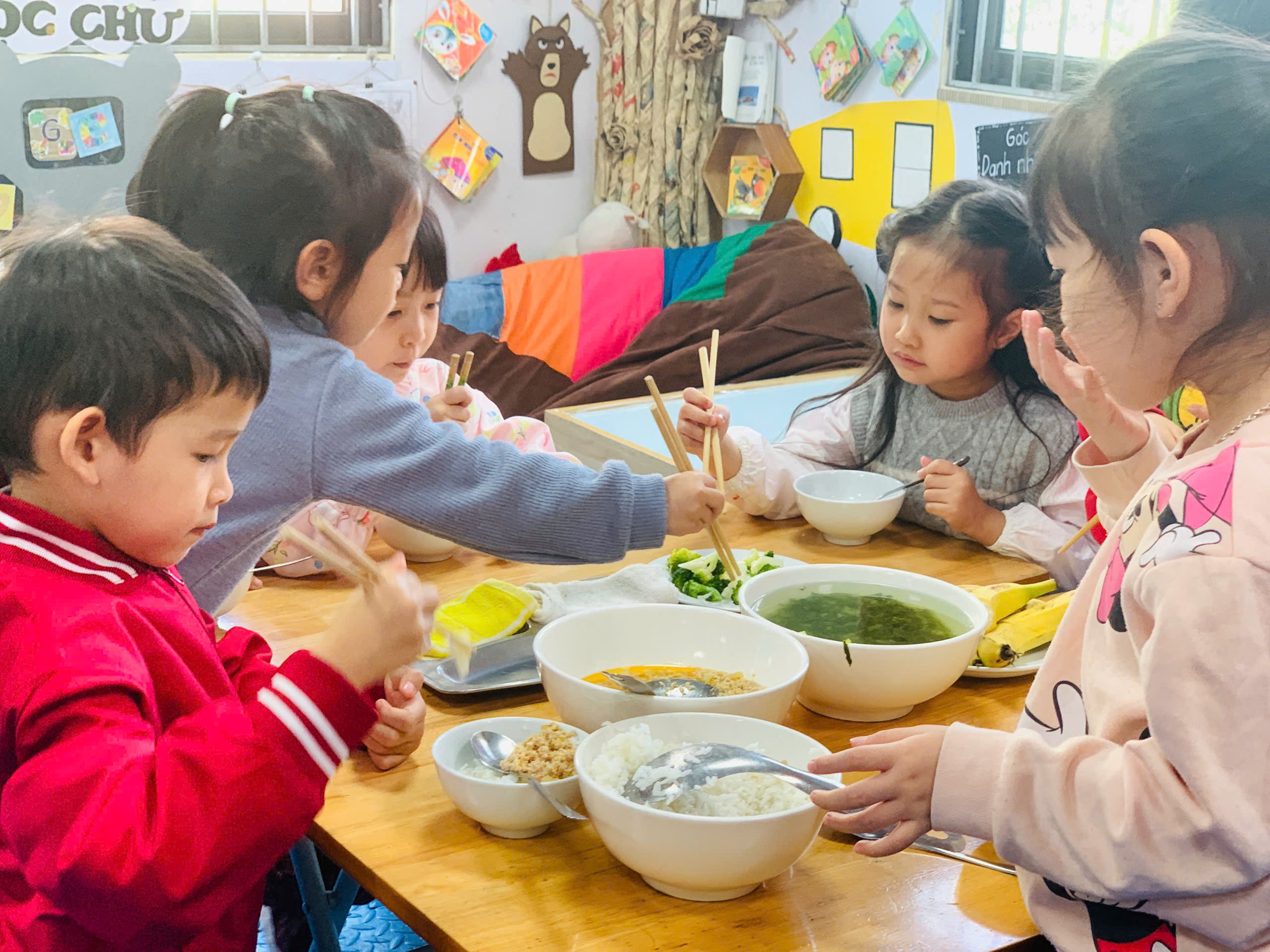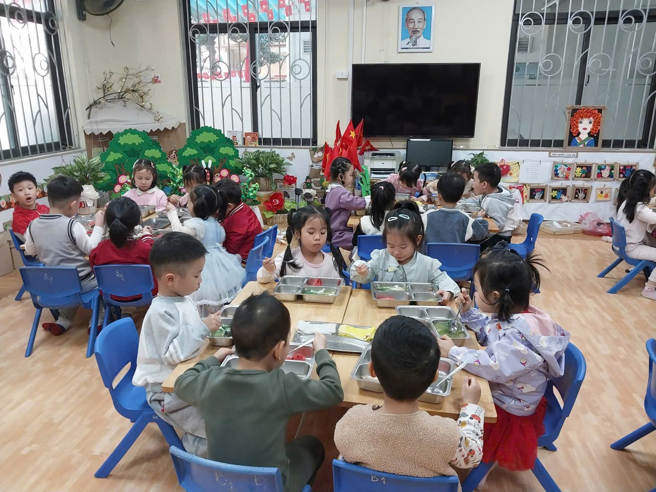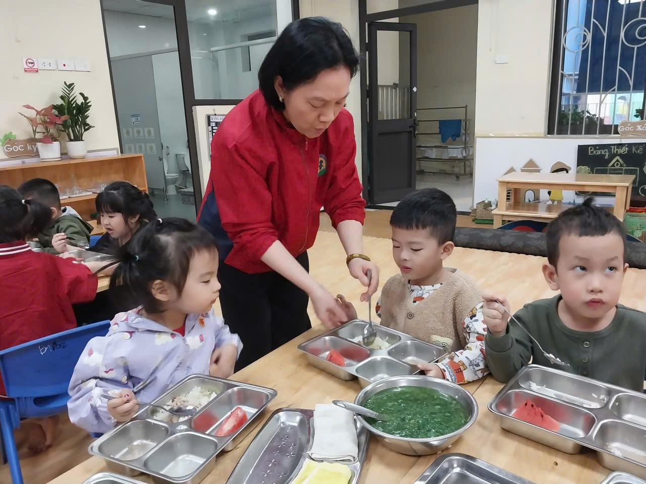 Việc duy trì tổ chức bữa ăn nhằm giúp trẻ hình thành thói quen dinh dưỡng khoa học, tự phục vụ và phát triển các kỹ năng xã hội. Mô hình “bữa ăn khay – bữa ăn gia đình” được duy trì đều đặn và đang mang lại nhiều hiệu quả thiết thực.