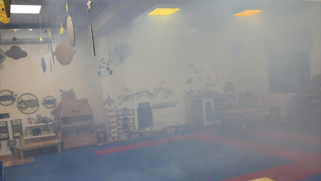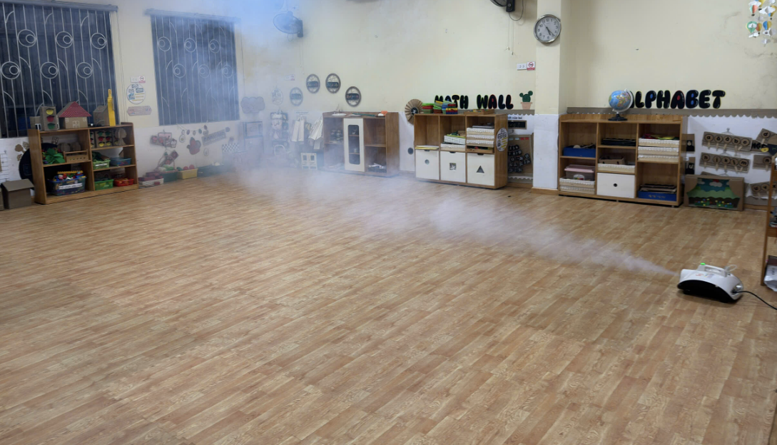 Công tác phun khử khuẩn được thực hiện theo đúng quy trình chuyên môn, sử dụng dung dịch khử khuẩn được khuyến cáo bởi ngành y tế. Phạm vi bao phủ bao gồm các phòng học, phòng chức năng, bếp ăn một chiều, khu vệ sinh, hành lang, sân chơi, khu vui chơi ngoài trời và toàn bộ bề mặt thường xuyên tiếp xúc của trẻ. Mục tiêu là tạo nên một “lớp áo bảo vệ vô hình” giúp ngăn chặn tối đa mầm bệnh tồn lưu trong môi trường.