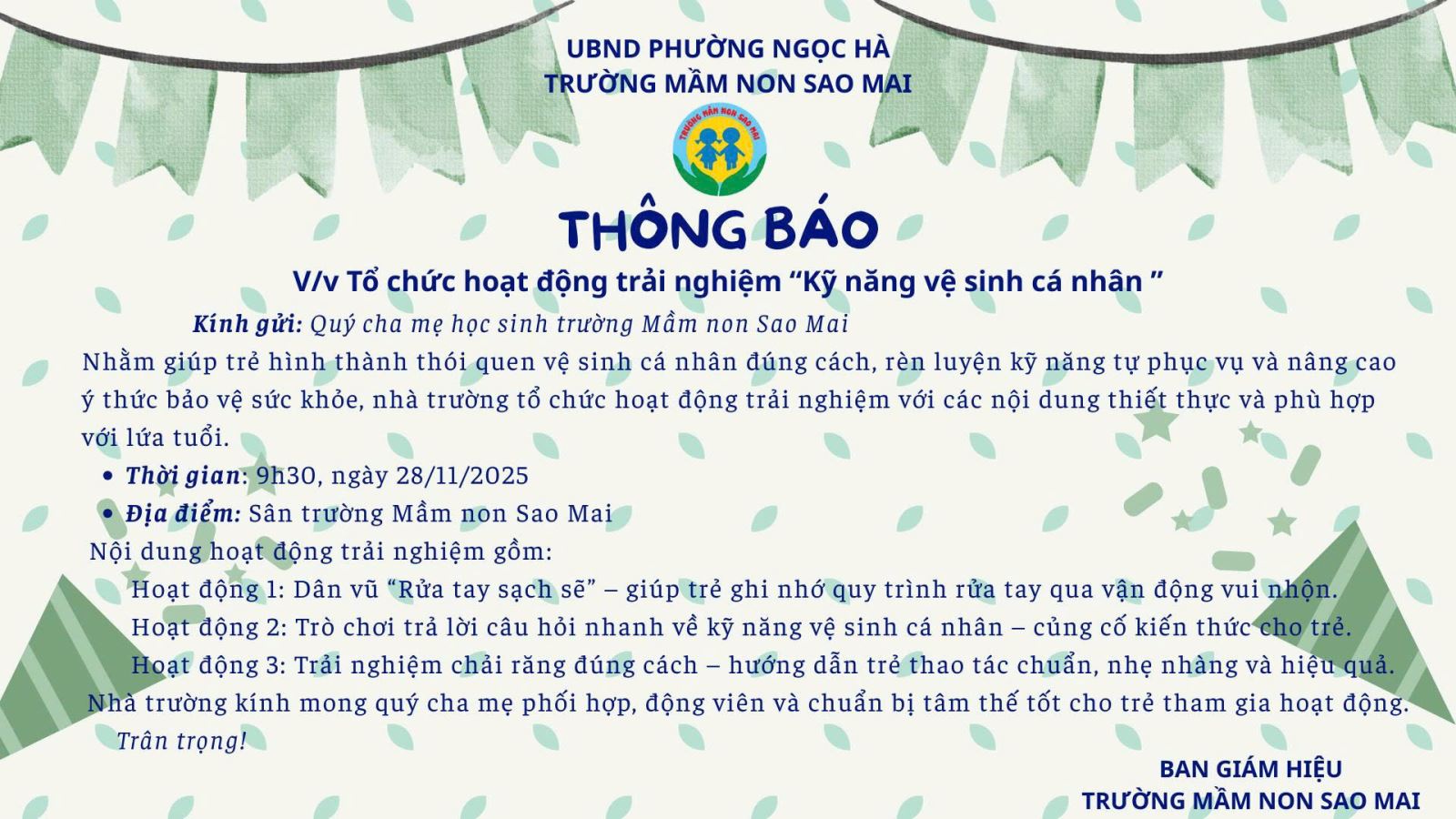 Trường Mầm non Sao Mai trân trọng kính gửi quý cha mẹ học sinh thông báo về việc tổ chức hoạt động trải nghiệm "Kỹ năng vệ sinh cá nhân" cho trẻ.