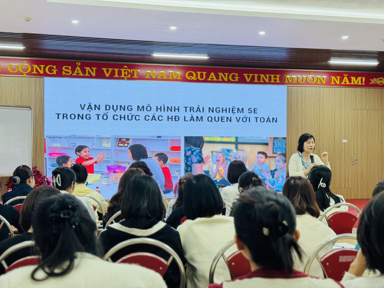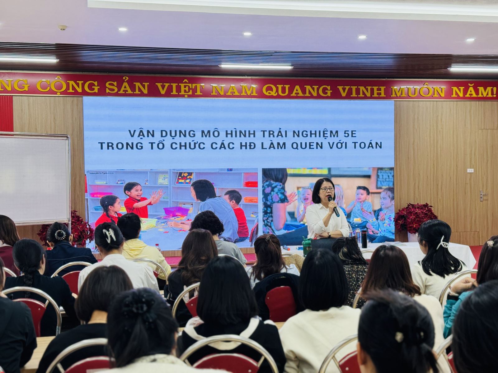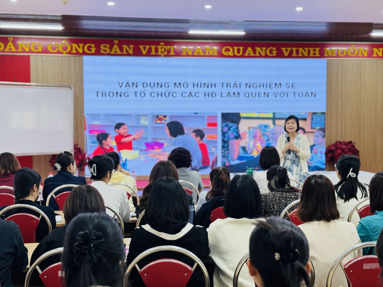 Nhằm nâng cao chất lượng giáo dục và cập nhật những phương pháp giảng dạy hiện đại trong giáo dục mầm non, đội ngũ giáo viên Trường Mầm non Sao Mai đã tích cực tham gia lớp bồi dưỡng chuyên môn về Phát triển chương trình nhà trường với chuyên đề: “Định hướng đổi mới các hình thức cho trẻ tham gia hoạt động Làm quen với toán”