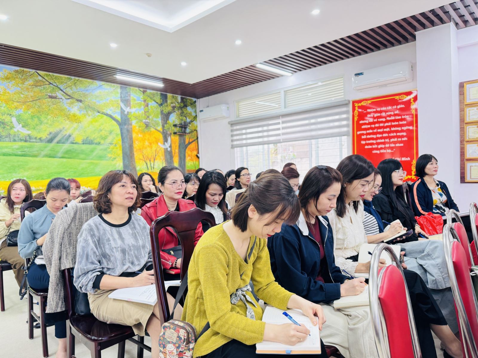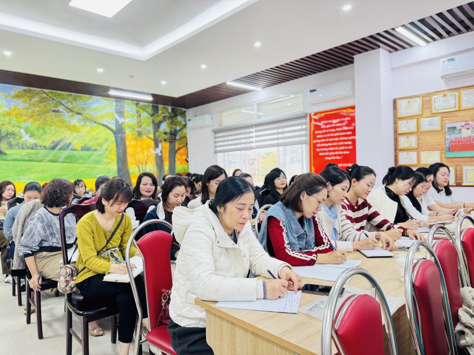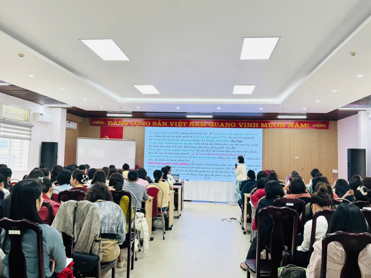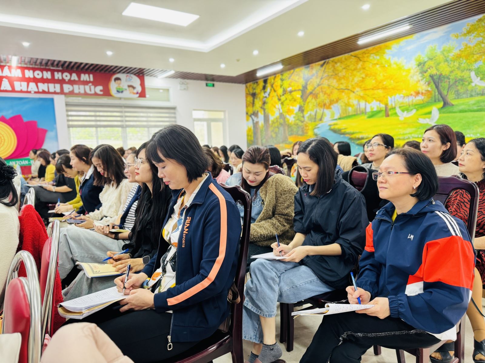 Nhằm nâng cao chất lượng giáo dục và cập nhật những phương pháp giảng dạy hiện đại trong giáo dục mầm non, đội ngũ giáo viên Trường Mầm non Sao Mai đã tích cực tham gia lớp bồi dưỡng chuyên môn về Phát triển chương trình nhà trường với chuyên đề: “Định hướng đổi mới các hình thức cho trẻ tham gia hoạt động Làm quen với toán”