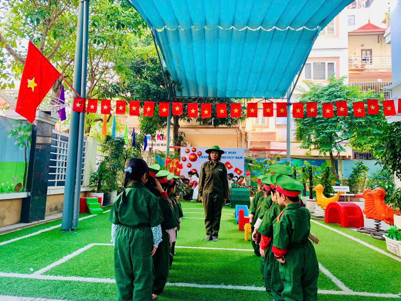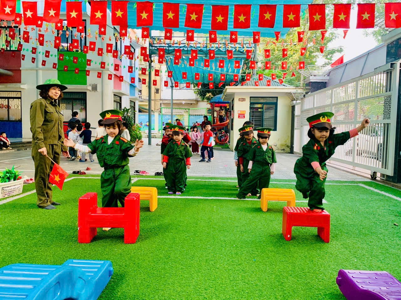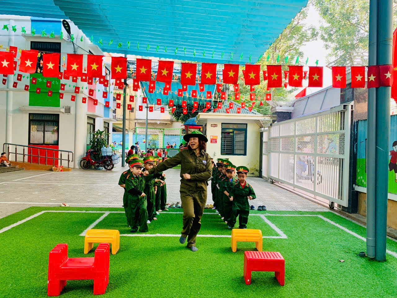Trong chuỗi hoạt động chào mừng, nổi bật là hoạt động “Bé làm chú bộ đội tí hon”. Các bé được khoác lên mình bộ trang phục bộ đội xanh thân thương, đội mũ sao vàng, tập đi đều bước, chào cờ và tham gia những trò chơi vận động mô phỏng sinh hoạt của chú bộ đội. Qua đó, trẻ không chỉ được rèn luyện thể chất mà còn cảm nhận được sự nghiêm túc, kỷ luật và tinh thần đoàn kết – những phẩm chất đẹp của Quân đội Nhân dân Việt Nam.