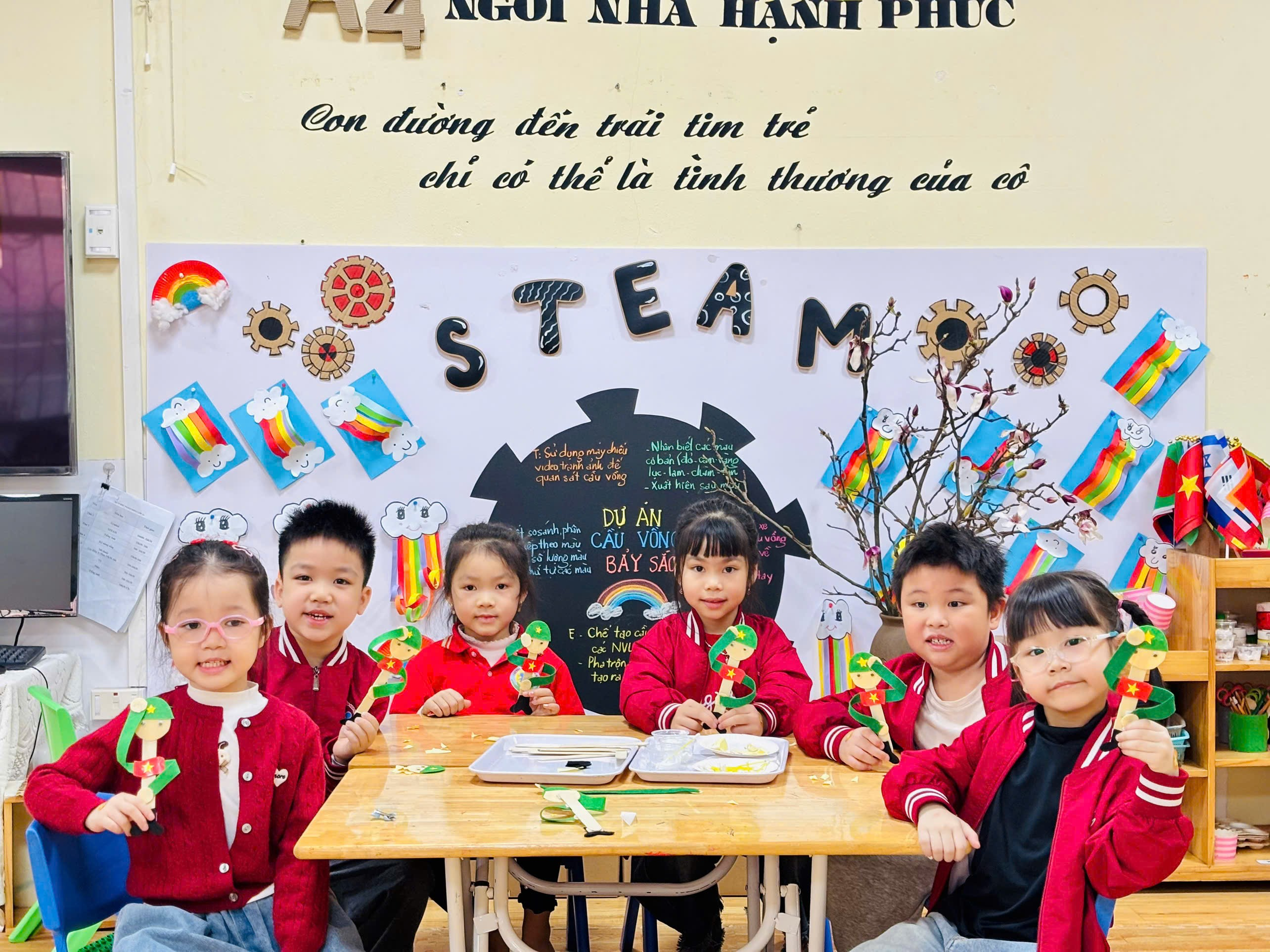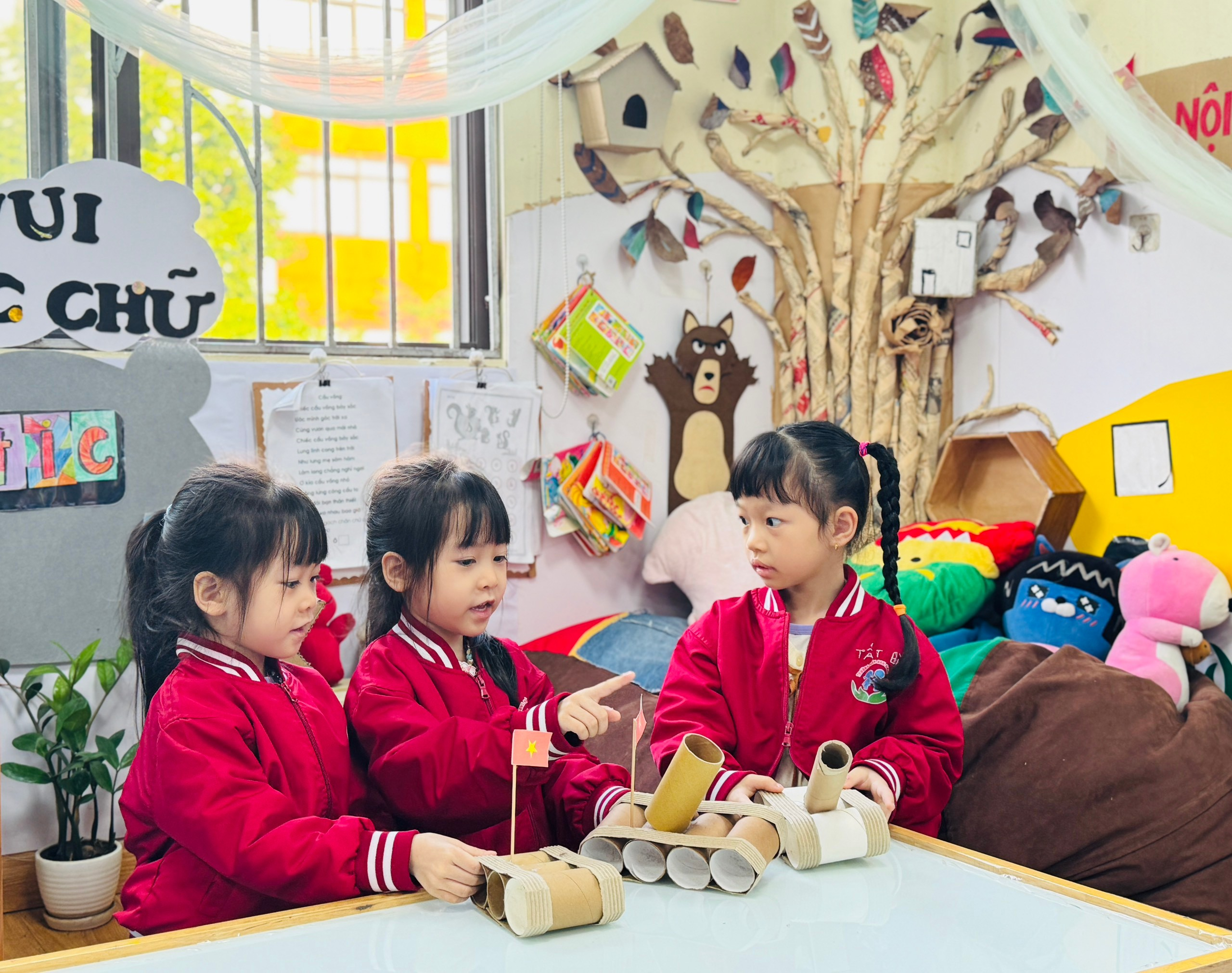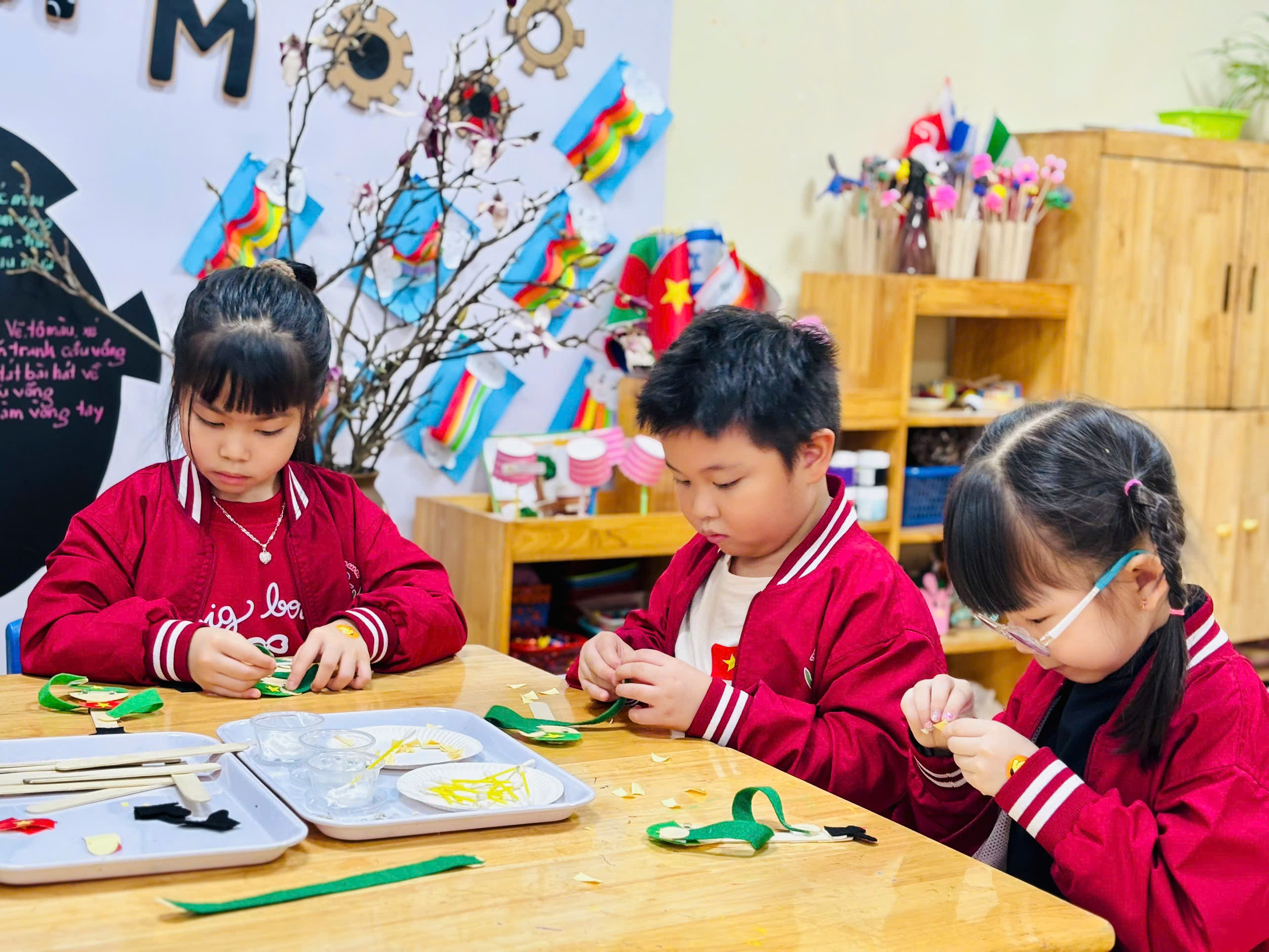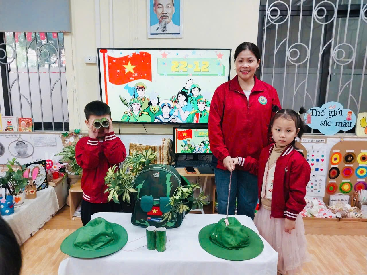 Bên cạnh đó, hoạt động tạo hình xe tăng, ống nhòm, trang phục chú bộ đội… từ các nguyên vật liệu tái chế quen thuộc như giấy màu, ống bìa cứng, chai nhựa… đã mang đến cho các bé cơ hội phát huy trí tưởng tượng và sự khéo léo của đôi tay. Mỗi sản phẩm tuy đơn giản nhưng chứa đựng sự hứng thú, niềm tự hào và tình cảm trong trẻo mà các bé dành cho hình ảnh người lính.