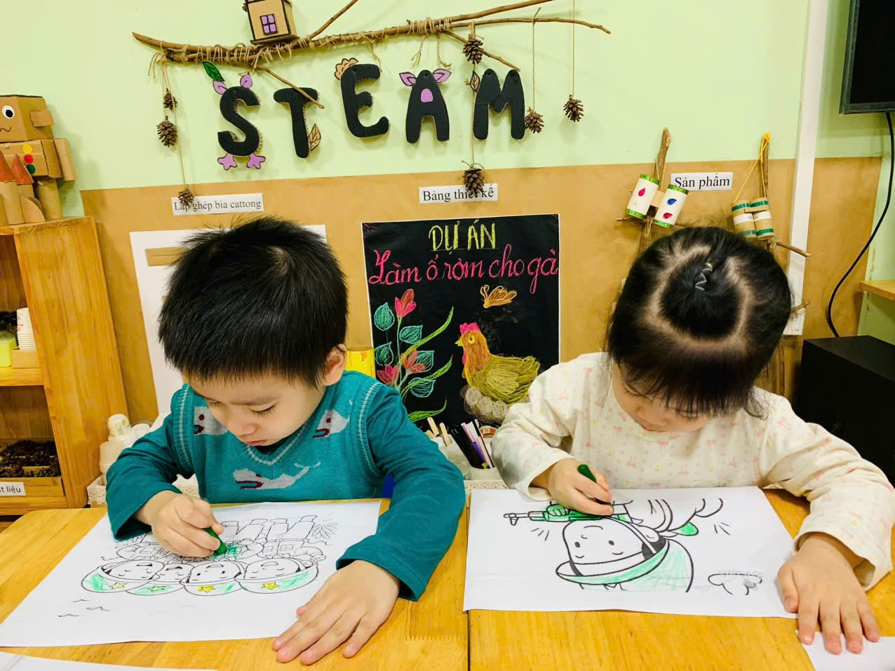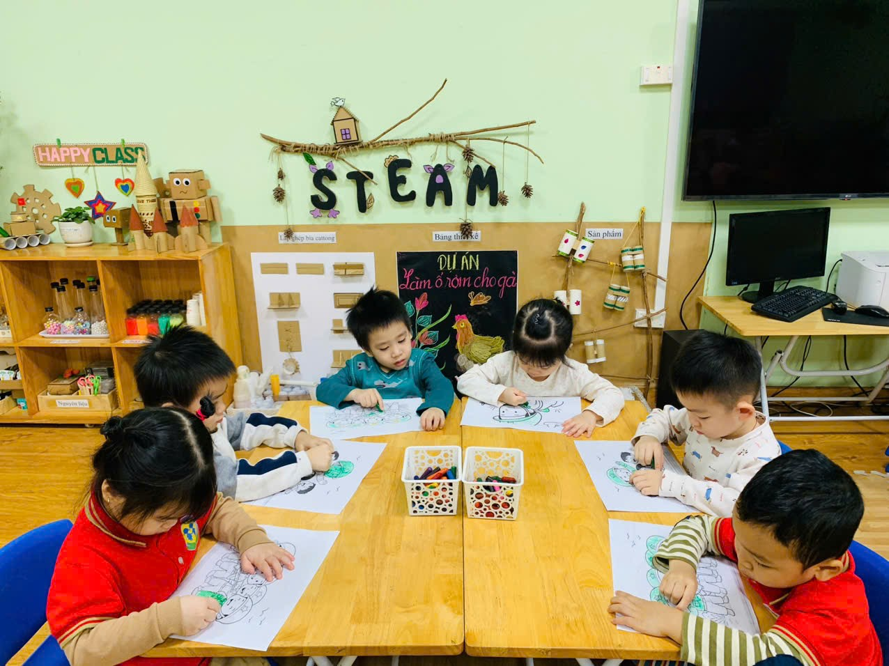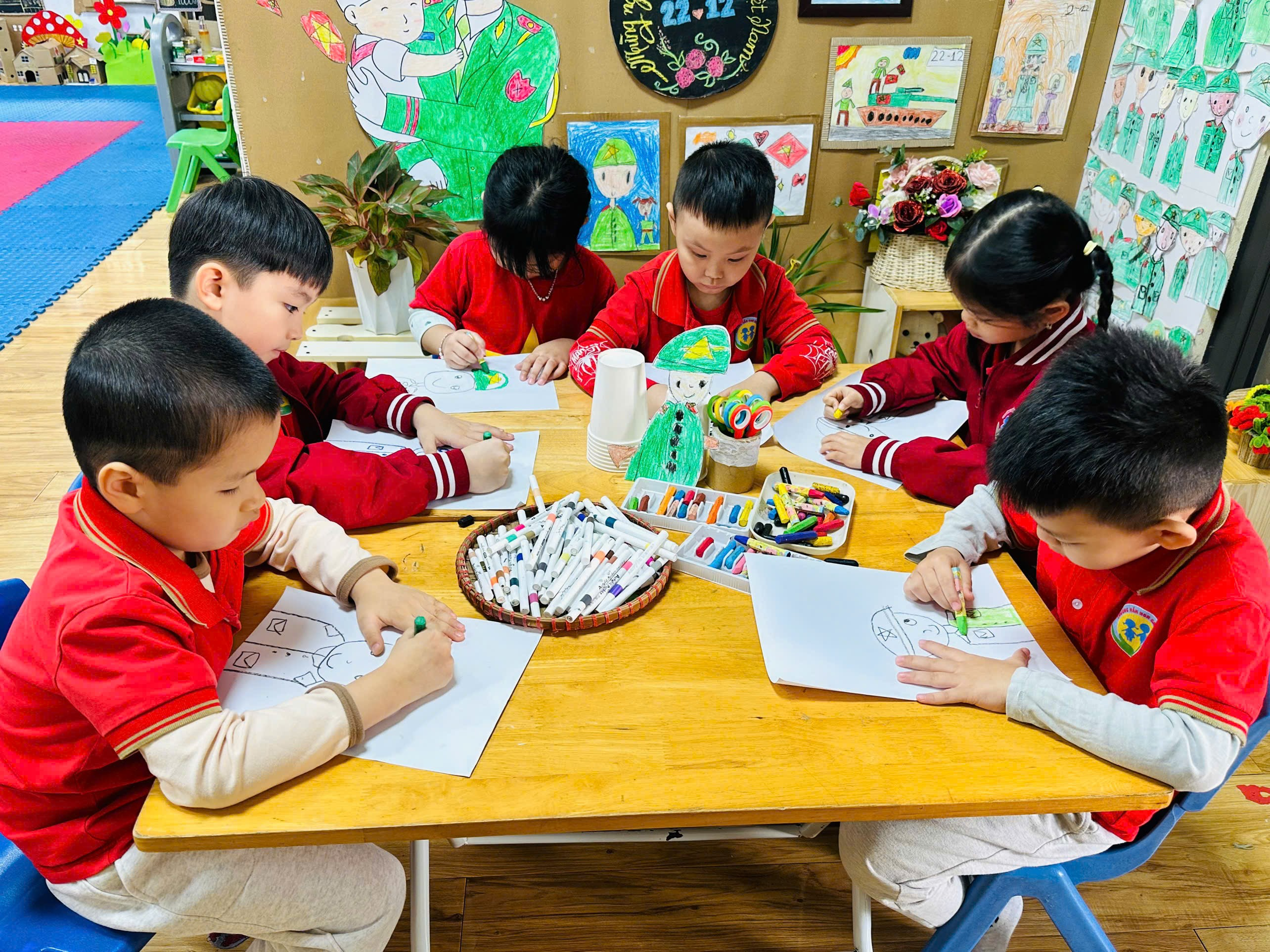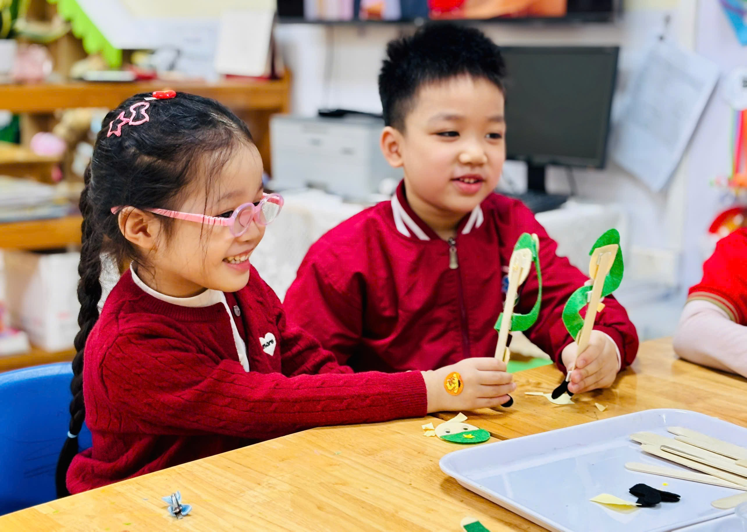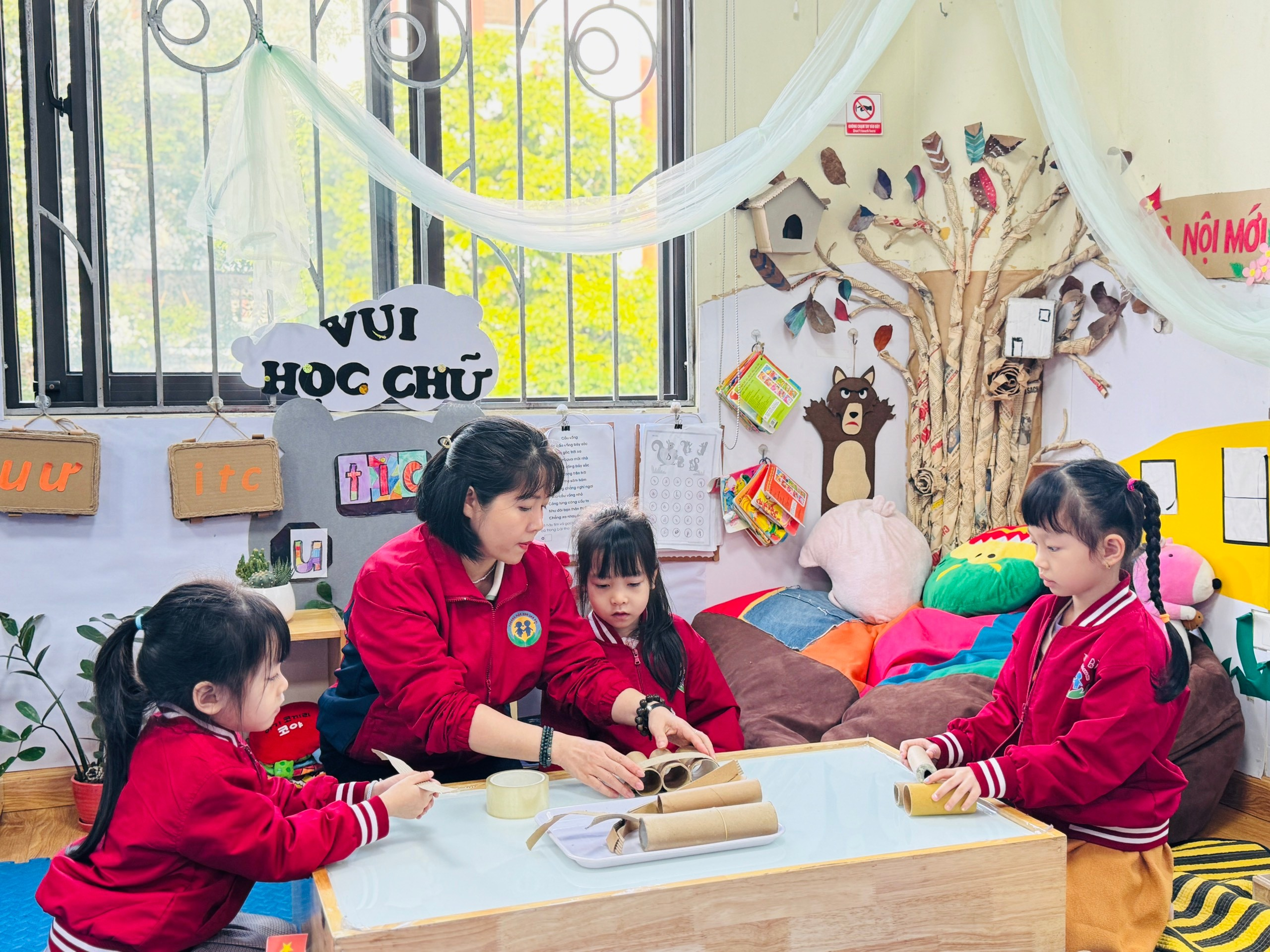 Bên cạnh đó, hoạt động tạo hình xe tăng, ống nhòm, trang phục chú bộ đội… từ các nguyên vật liệu tái chế quen thuộc như giấy màu, ống bìa cứng, chai nhựa… đã mang đến cho các bé cơ hội phát huy trí tưởng tượng và sự khéo léo của đôi tay. Mỗi sản phẩm tuy đơn giản nhưng chứa đựng sự hứng thú, niềm tự hào và tình cảm trong trẻo mà các bé dành cho hình ảnh người lính.