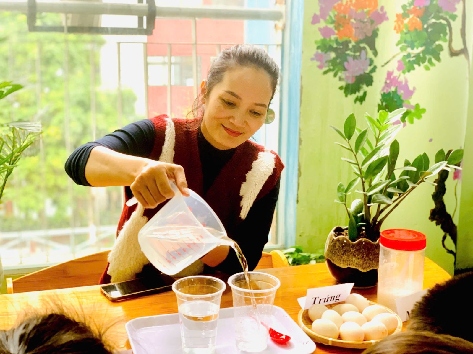 Cách làm: Cốc thứ nhất cho nước lọc vào, cốc thứ 2 cho nước lọc và hòa tan thêm ít muối. Sau đó, thả vào mỗi cốc một quả trứng.
