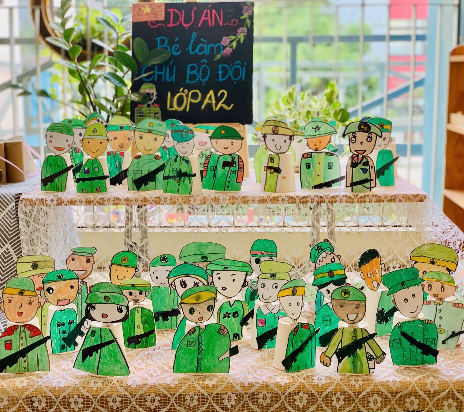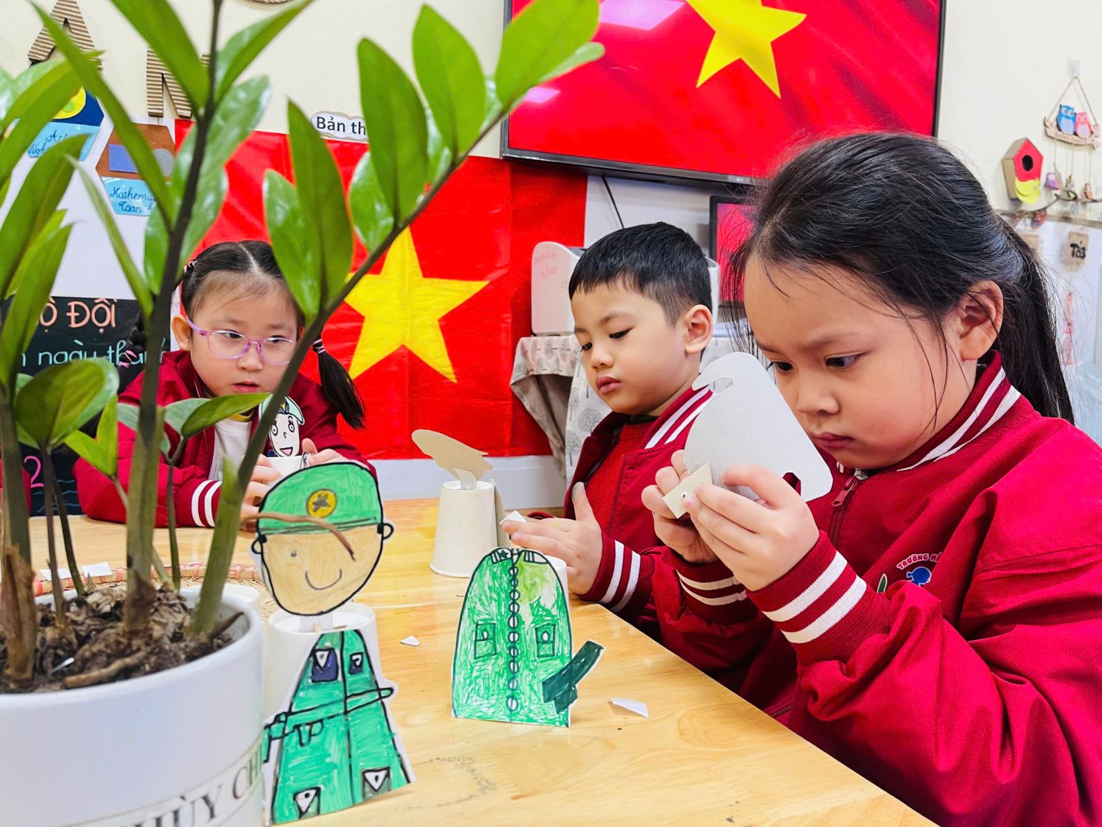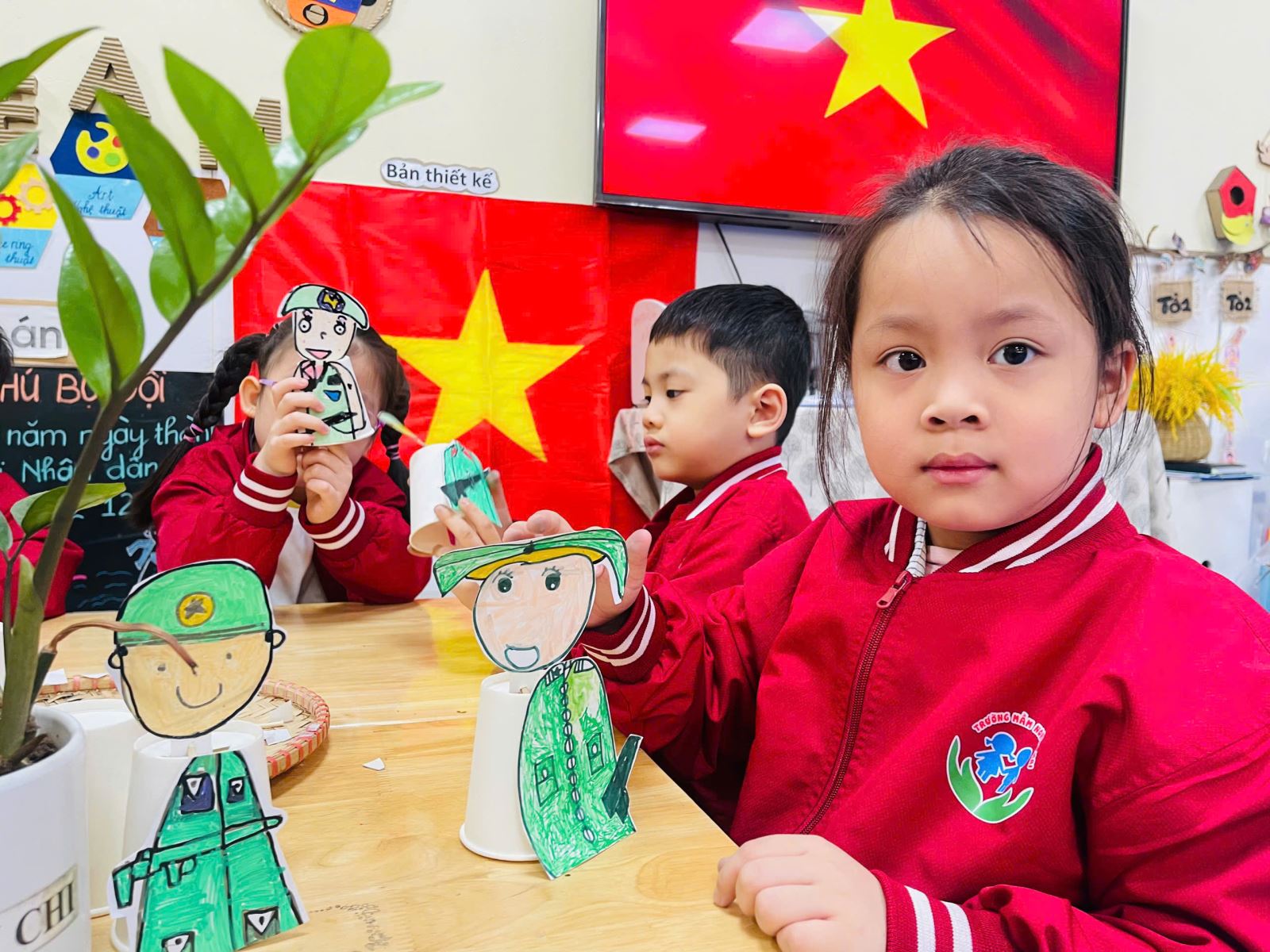 Trong hoạt động này, trẻ được làm quen với những vật liệu đơn giản như cốc giấy, bìa màu, bút màu, kéo, băng dính 2 mặt... Dưới sự hướng dẫn tận tình của cô giáo, những chiếc cốc giấy tưởng chừng như vô tri dưới bàn tay khéo léo của các con đã được “biến hóa” thành hình ảnh chú bộ đội thân thương với chiếc mũ cối , áo xanh và dáng vẻ oai phong.