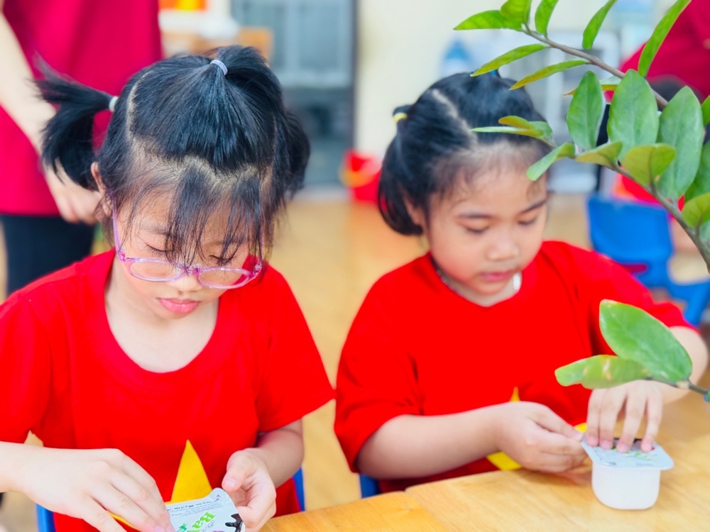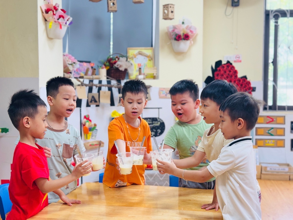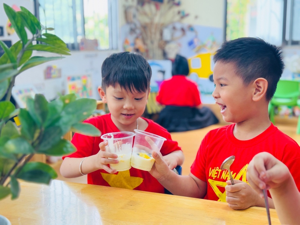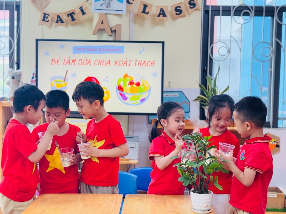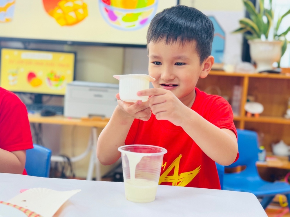 Các bé vô cùng hào hứng khi được hóa thân thành những “đầu bếp nhí”, tự tay lựa chọn nguyên liệu, pha trộn và trình bày món xoài sữa chua thạch đen theo ý thích của mình. Mỗi cốc sữa chua không chỉ là thành quả của sự khéo léo mà còn chứa đựng niềm vui, sự sáng tạo và tinh thần làm việc nhóm của các bé.