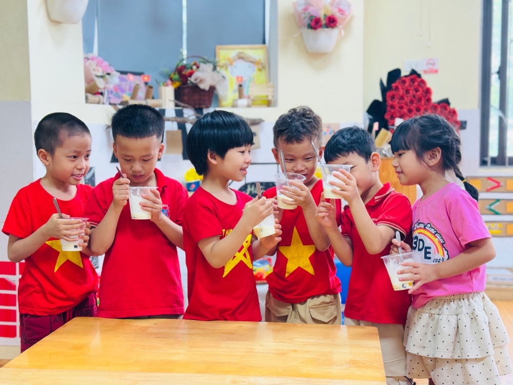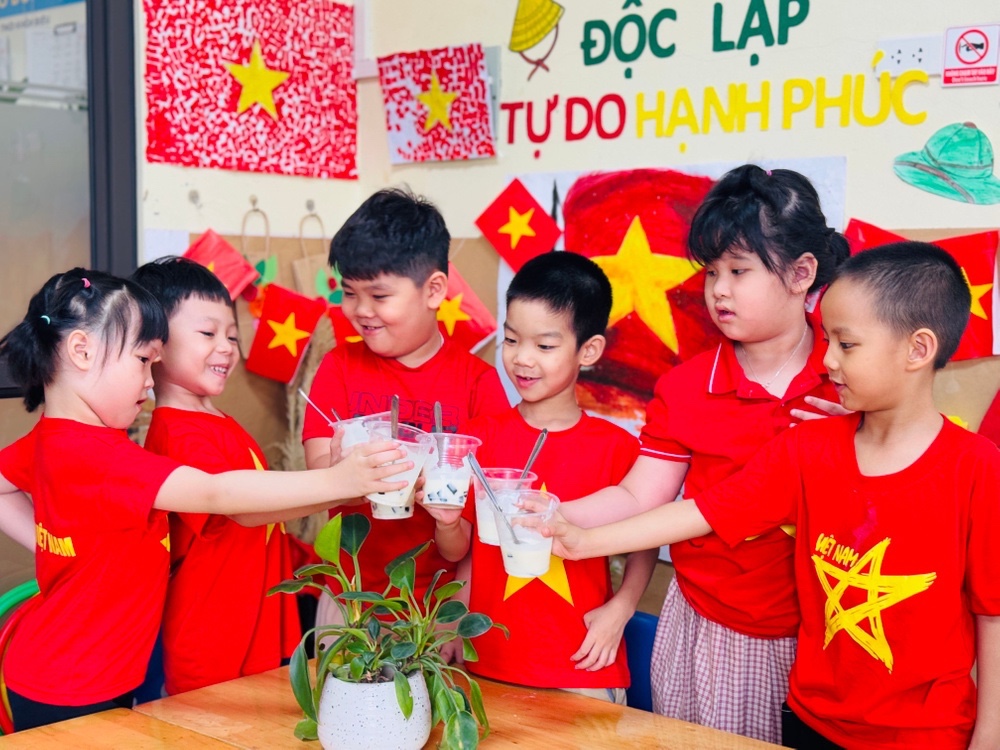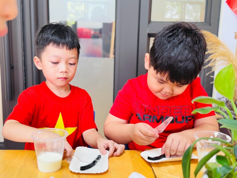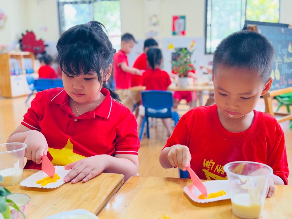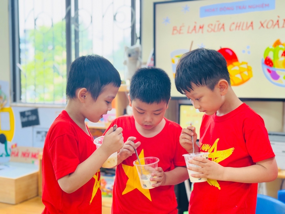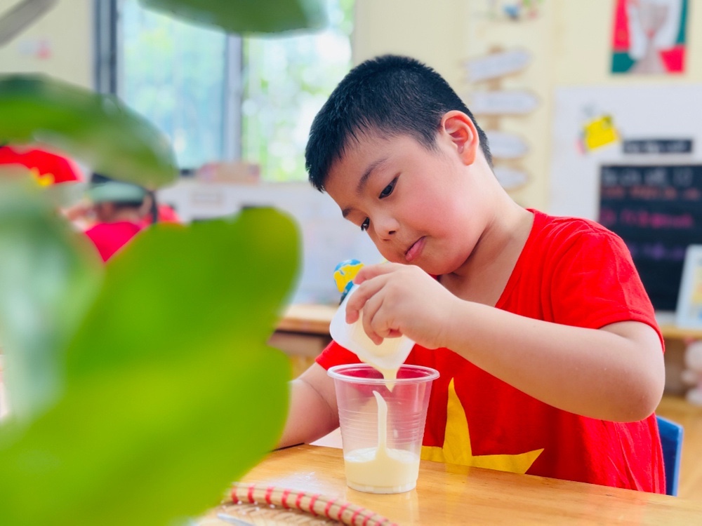 Các bé vô cùng hào hứng khi được hóa thân thành những “đầu bếp nhí”, tự tay lựa chọn nguyên liệu, pha trộn và trình bày món xoài sữa chua thạch đen theo ý thích của mình. Mỗi cốc sữa chua không chỉ là thành quả của sự khéo léo mà còn chứa đựng niềm vui, sự sáng tạo và tinh thần làm việc nhóm của các bé.