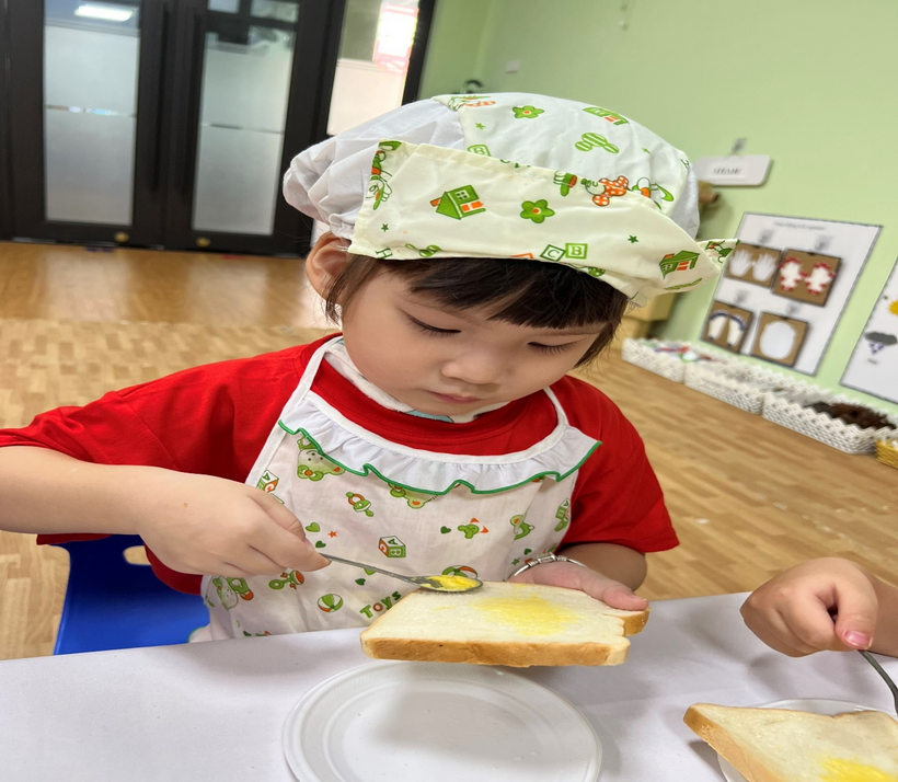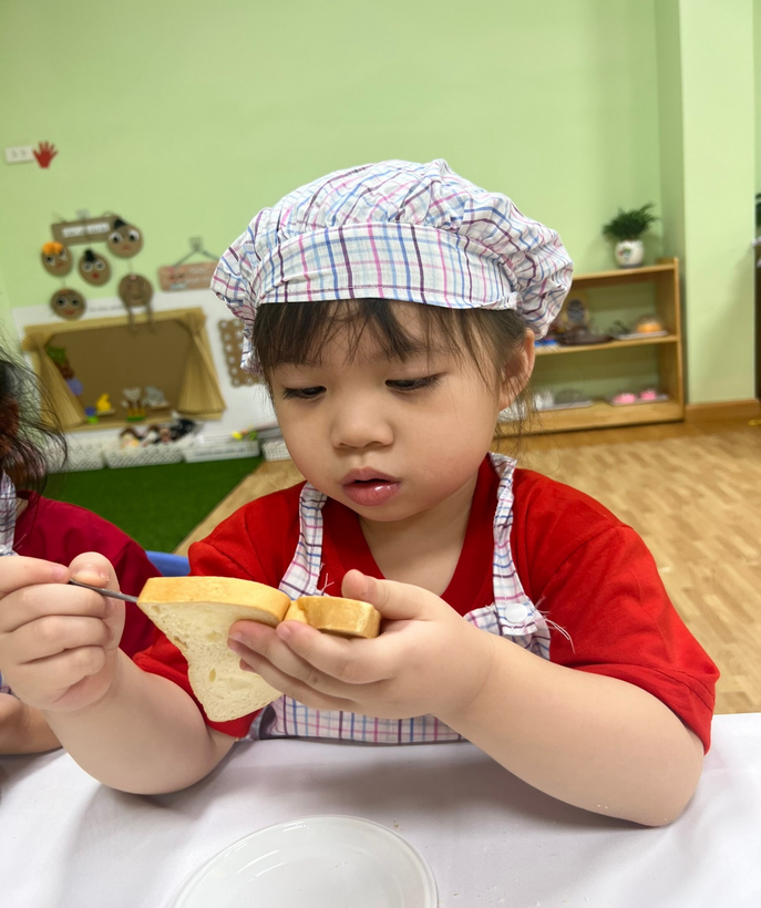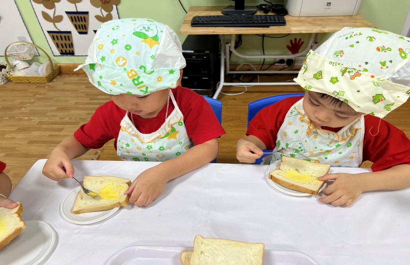 Sáng thứ hai ngày 17/10/2022 lớp mẫu giáo bé C2 Trường Mầm non Sao Mai tổ chức hoạt động Bé tập làm nội trợ món “Bánh mì phết bơ”