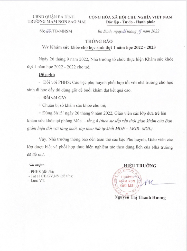 Trường Mầm Non Sao Mai thông báo tới toàn thể giáo viên và phụ huynh học sinh lịch khám sức khỏe đợt 1 năm học 2022- 2023.