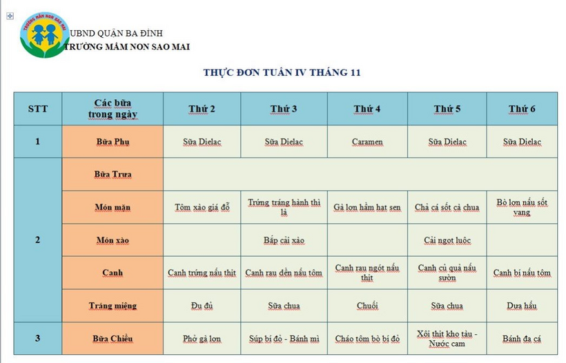 Mời Bố Mẹ cùng xem thực đơn của bé: Tuần từ 21/11/2022 - 25/11/2022 với nhiều món ăn ngon ngon và bổ dưỡng .