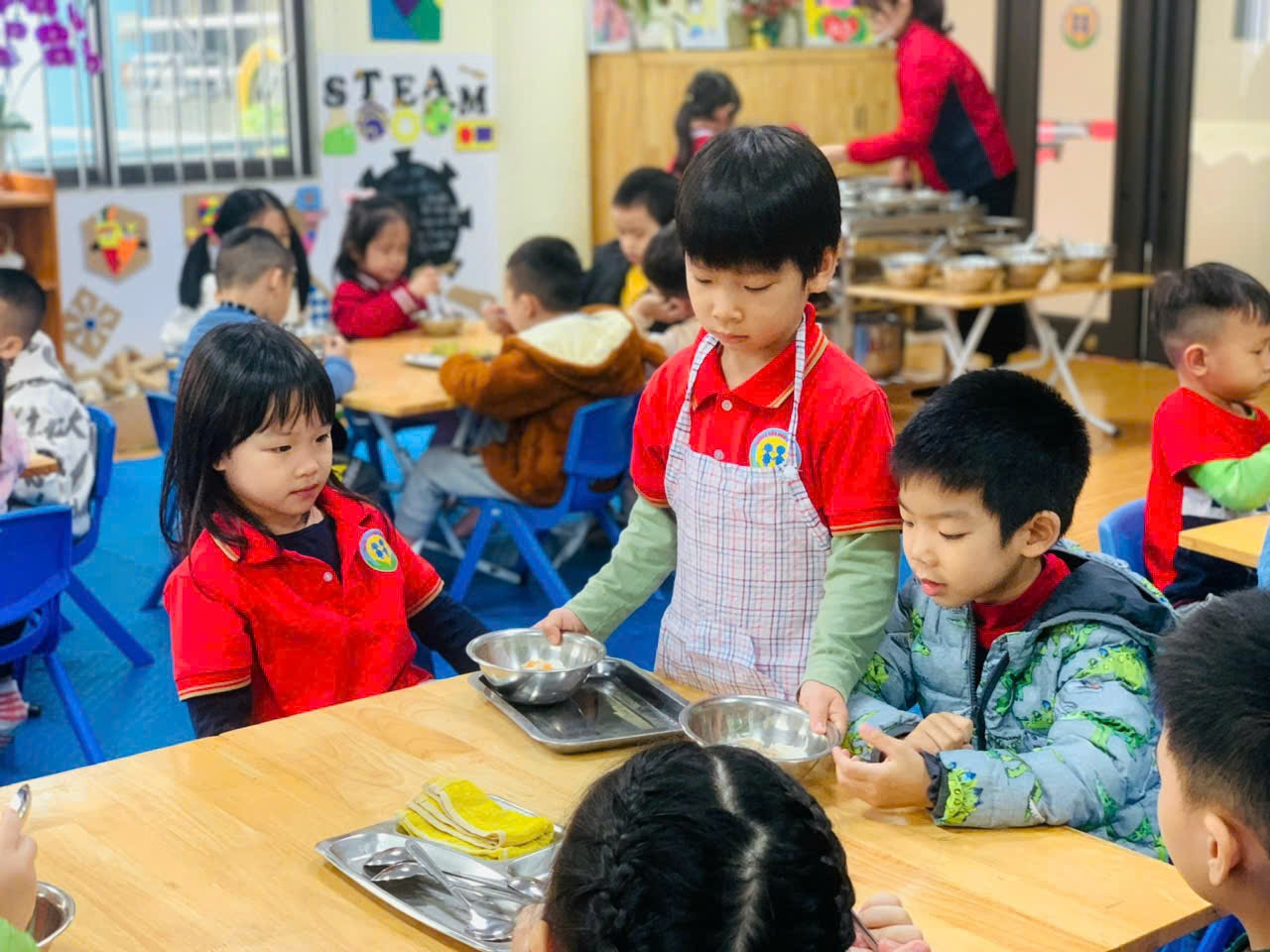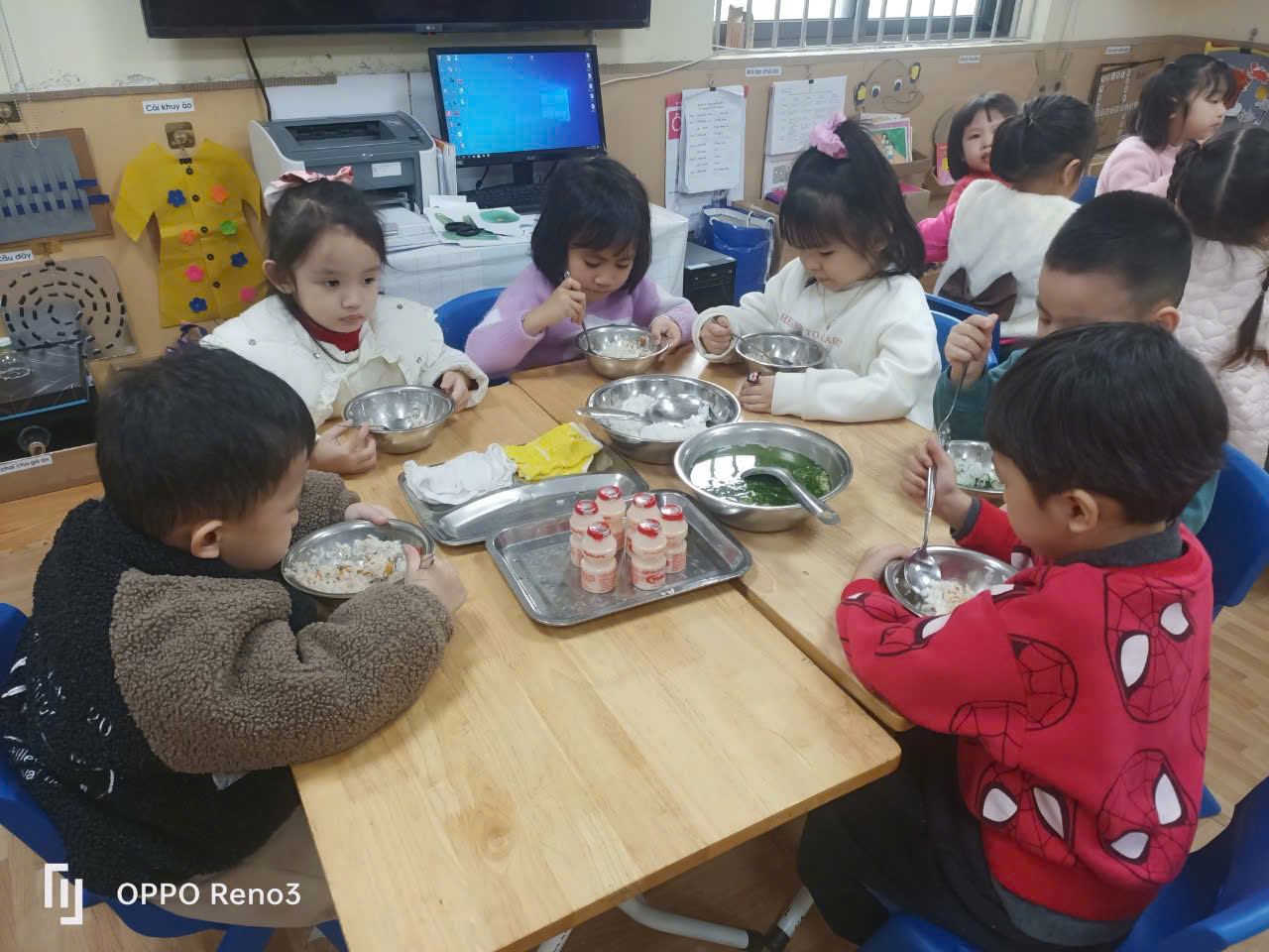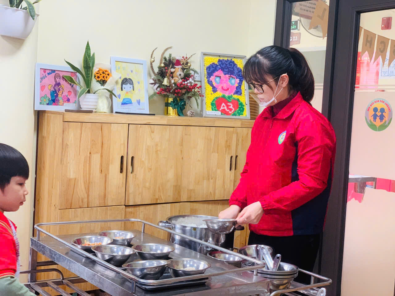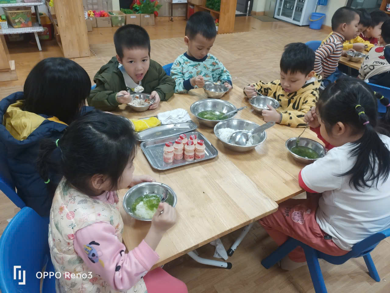 Bữa ăn của trẻ được đảm bảo đủ độ ấm nóng trong thời tiết lạnh giá.Một số hình ảnh giờ ăn trưa của trẻ tại trường Mầm non Sao Mai :