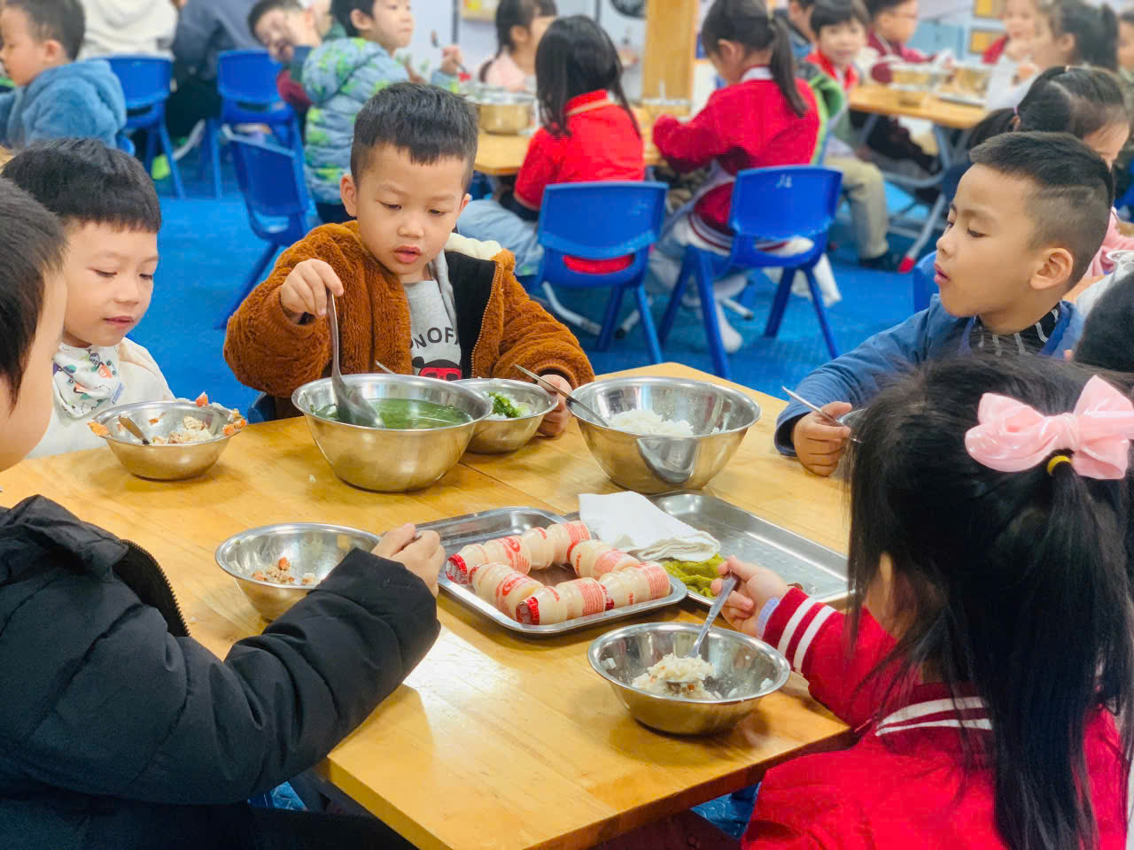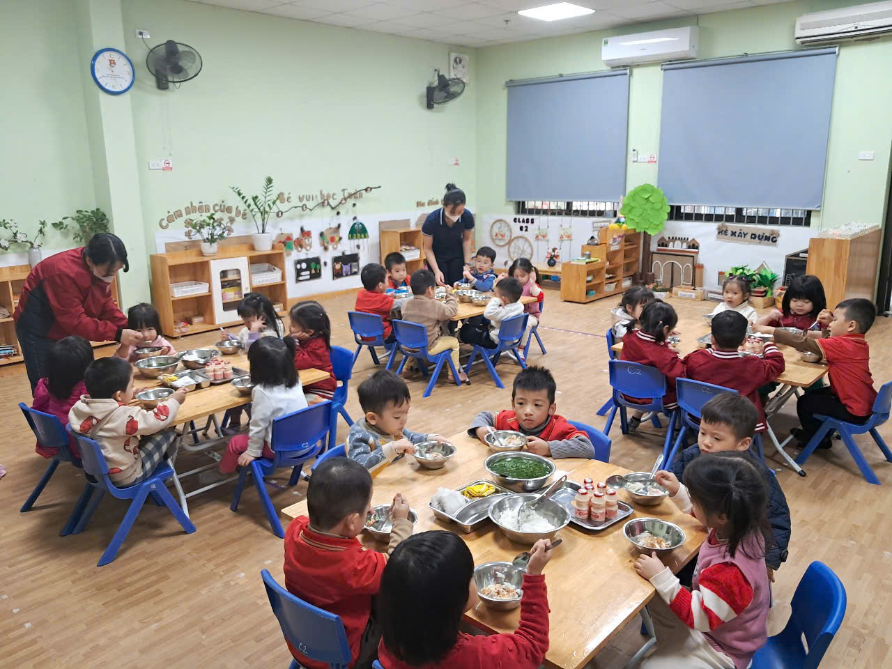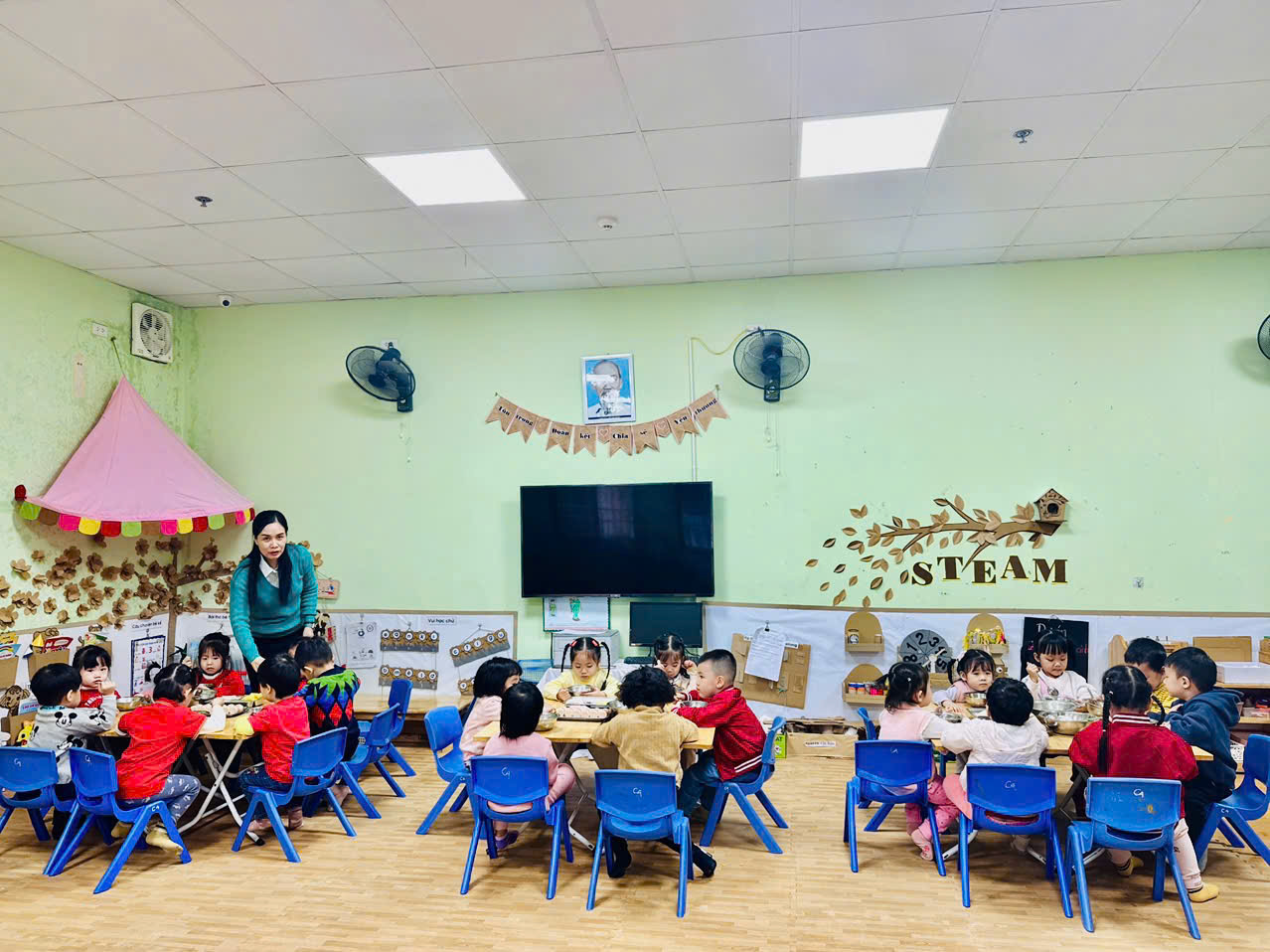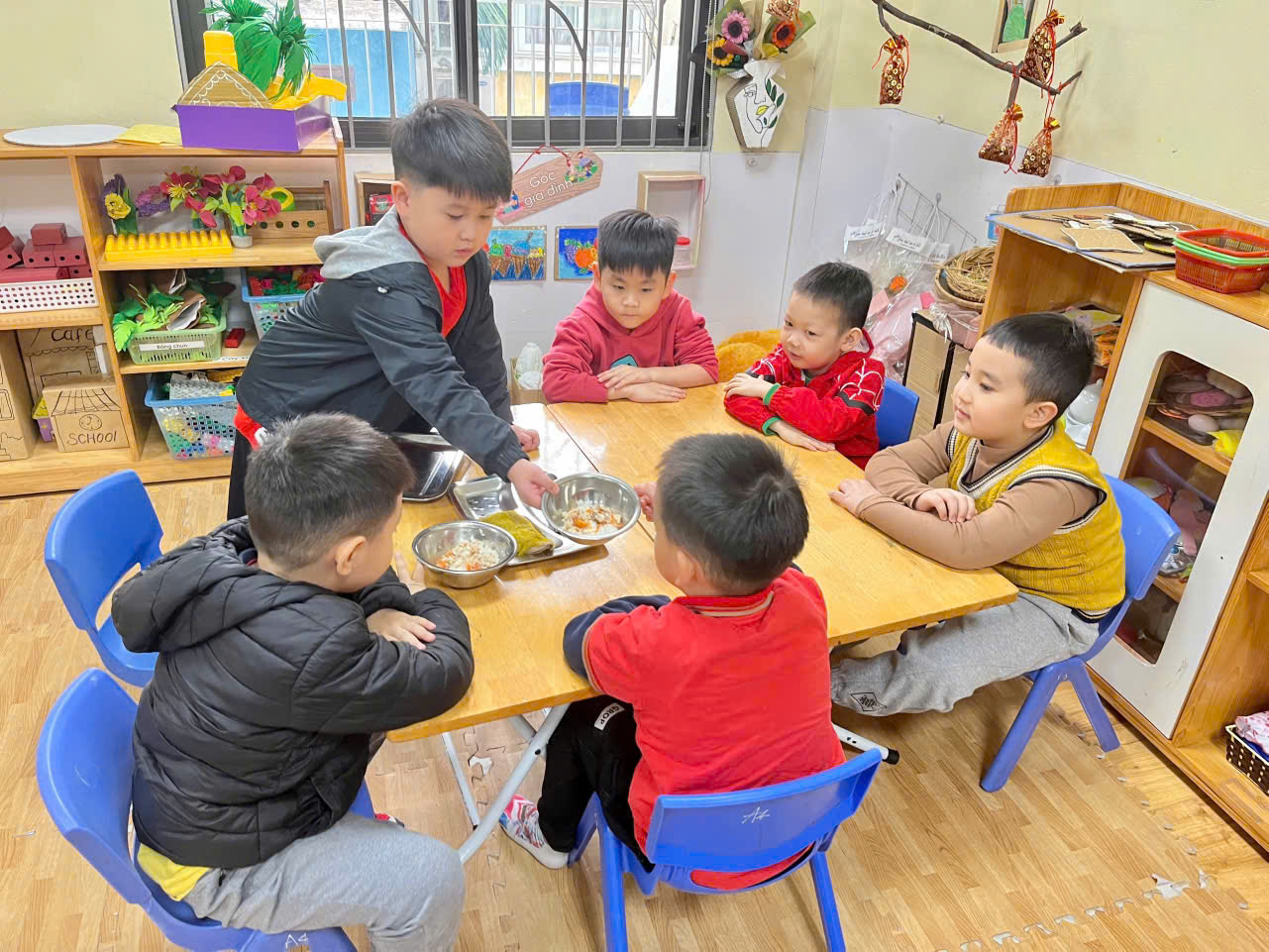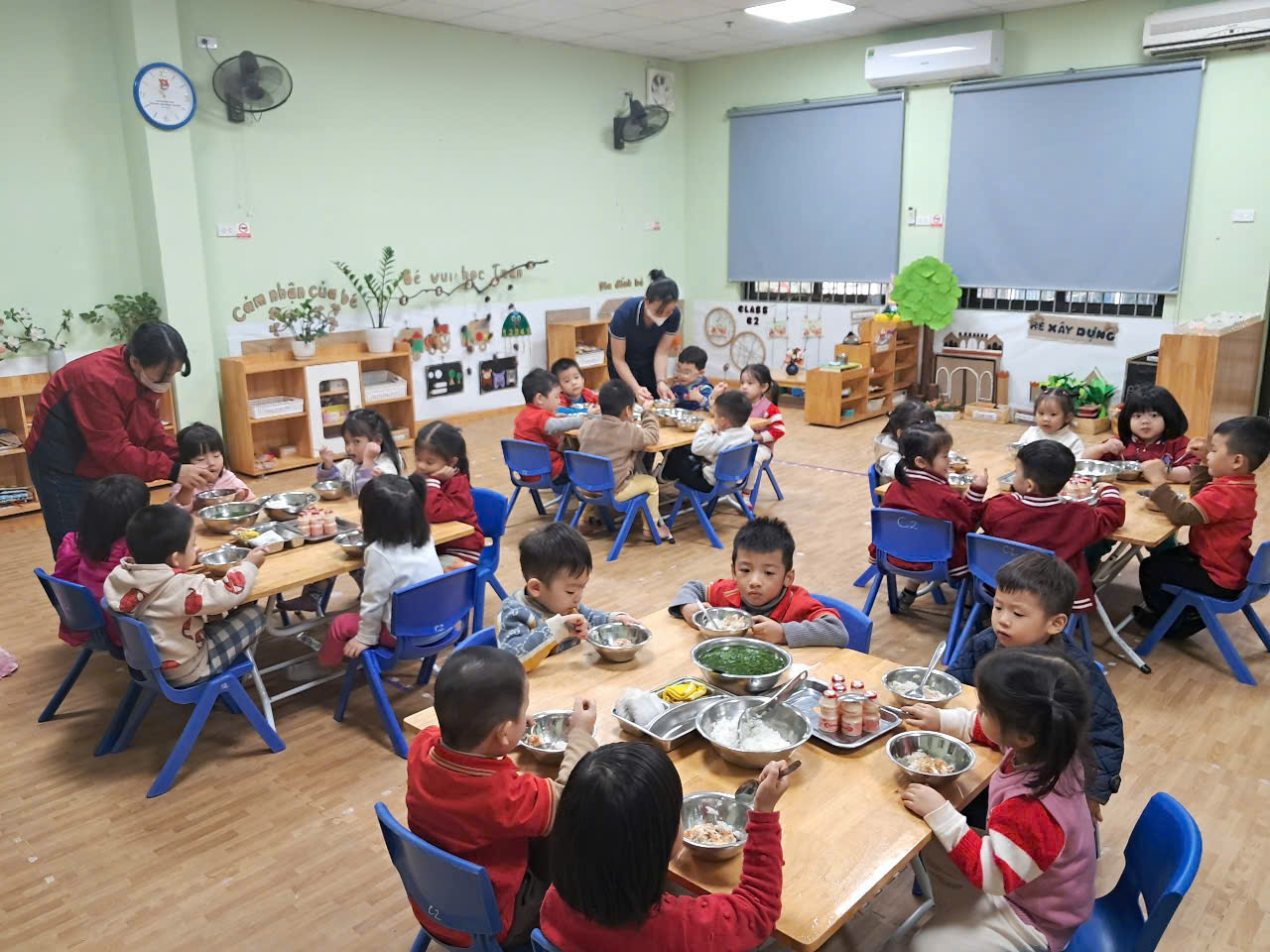Bữa ăn của trẻ được đảm bảo đủ độ ấm nóng trong thời tiết lạnh giá.Một số hình ảnh giờ ăn trưa của trẻ tại trường Mầm non Sao Mai :