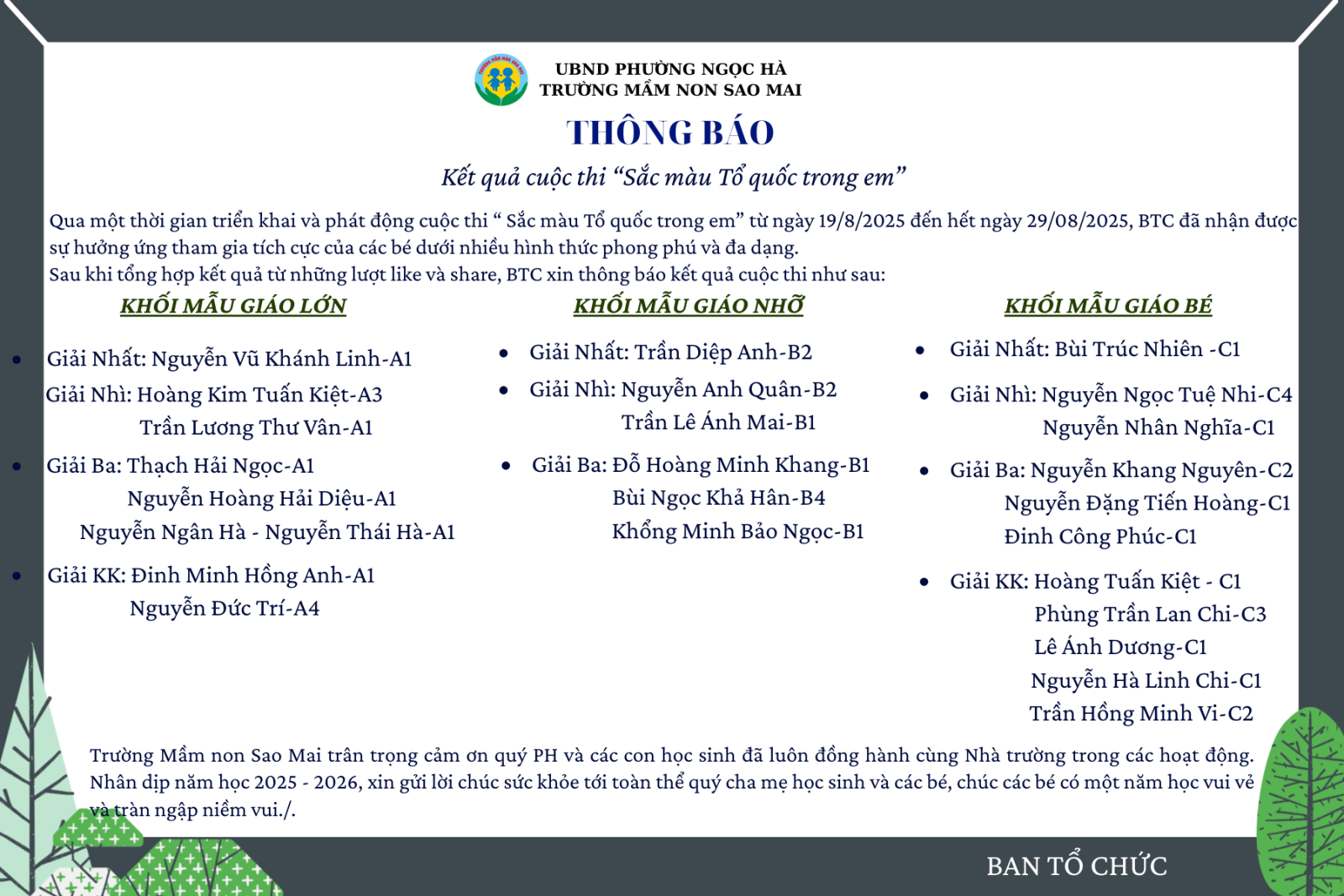 Trường Mầm non Sao Mai thông báo kết quả cuộc thi "Sắc màu Tổ quốc trong em"