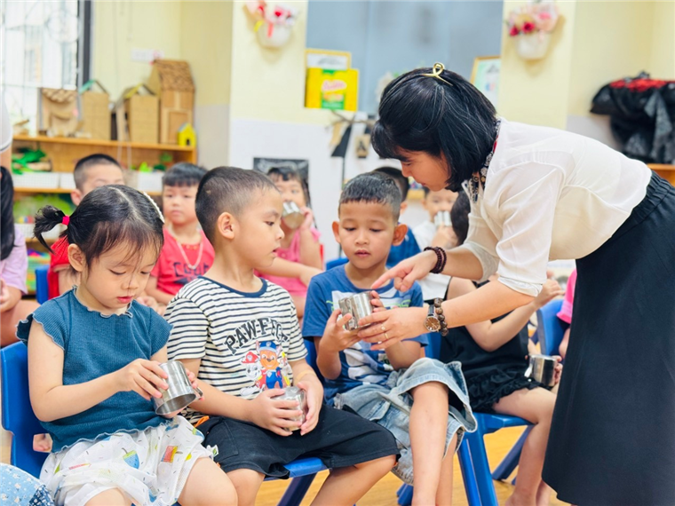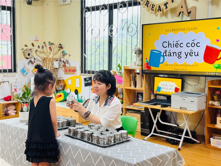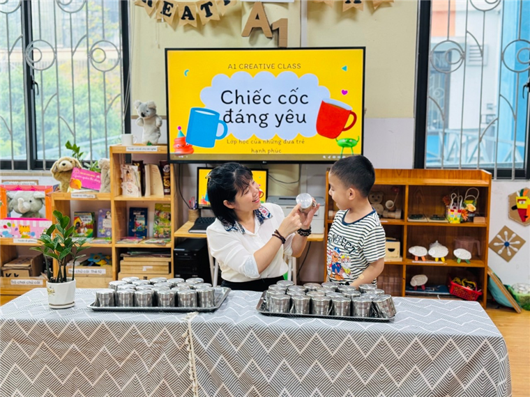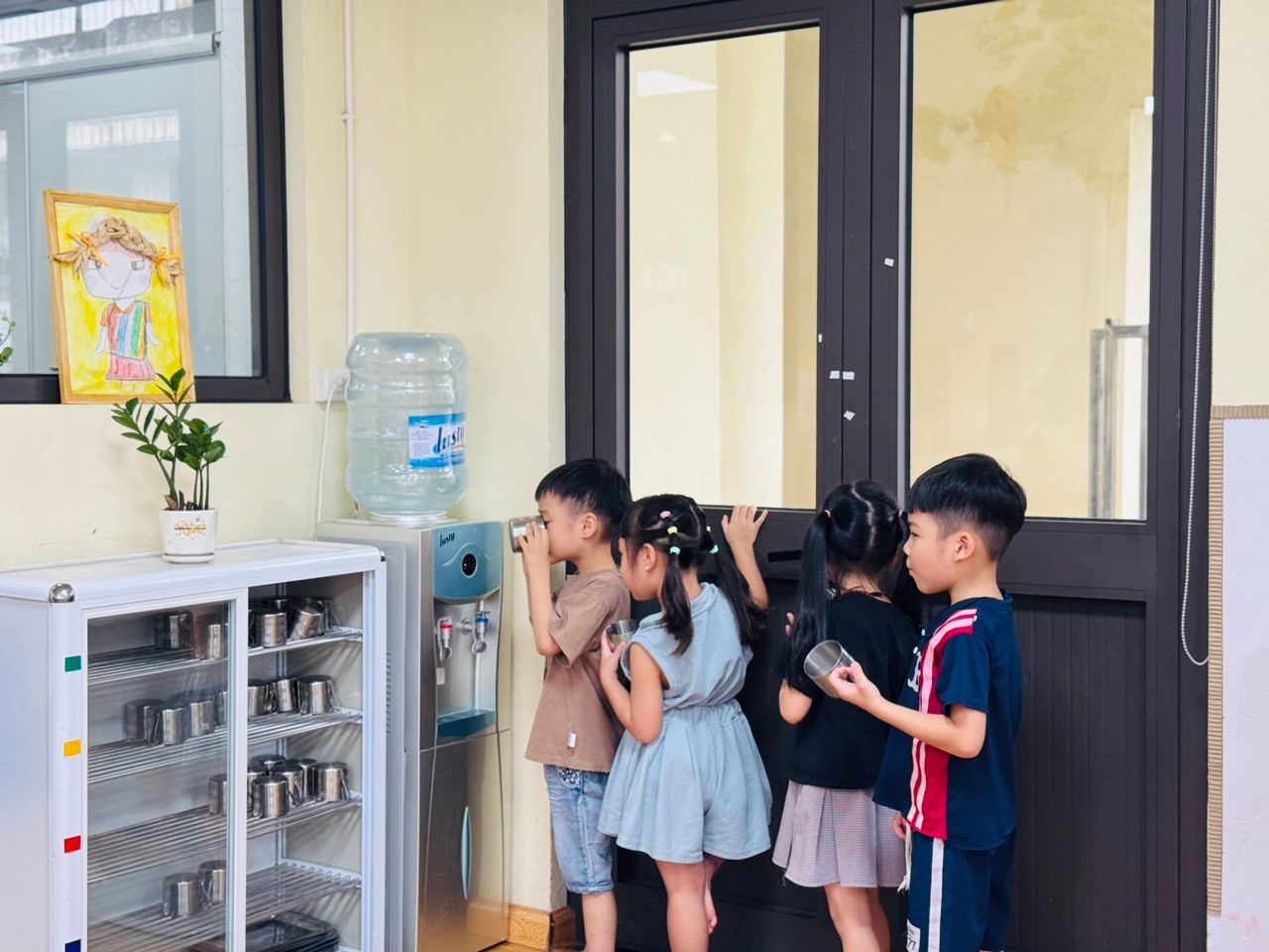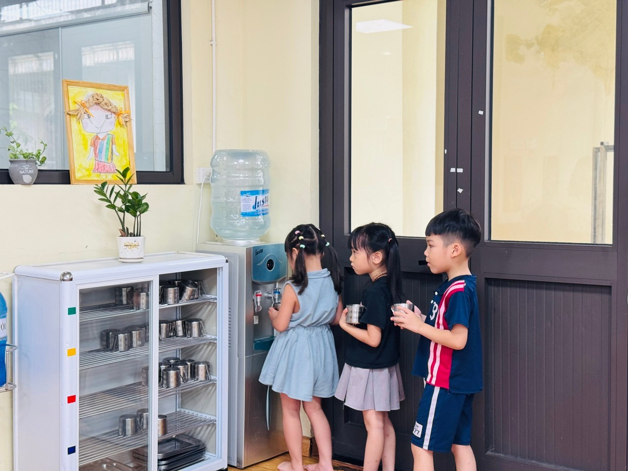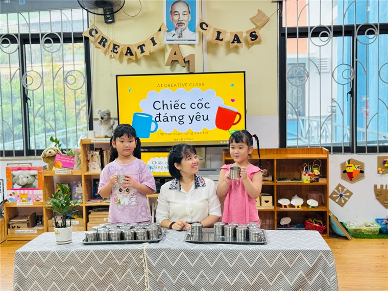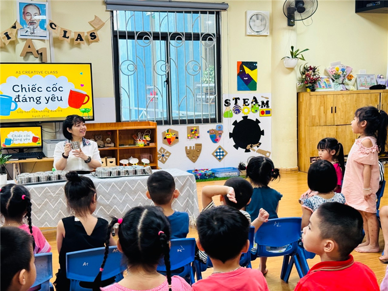 💧 Mở đầu hoạt động, cô giáo nhẹ nhàng hướng dẫn các bé cách nhận biết cốc của mình thông qua ký hiệu riêng (số thứ tự, hình vẽ…). Mỗi bé đều rất hào hứng khi tự tay tìm đúng chiếc cốc thân quen của mình.