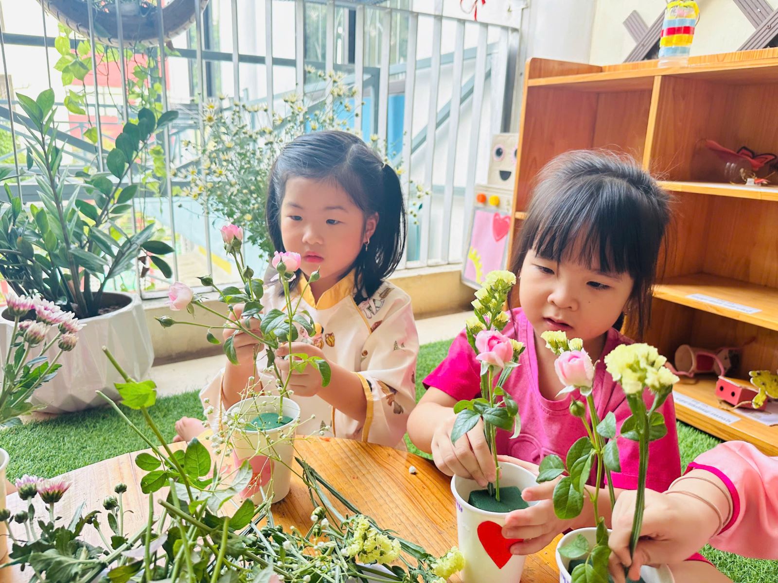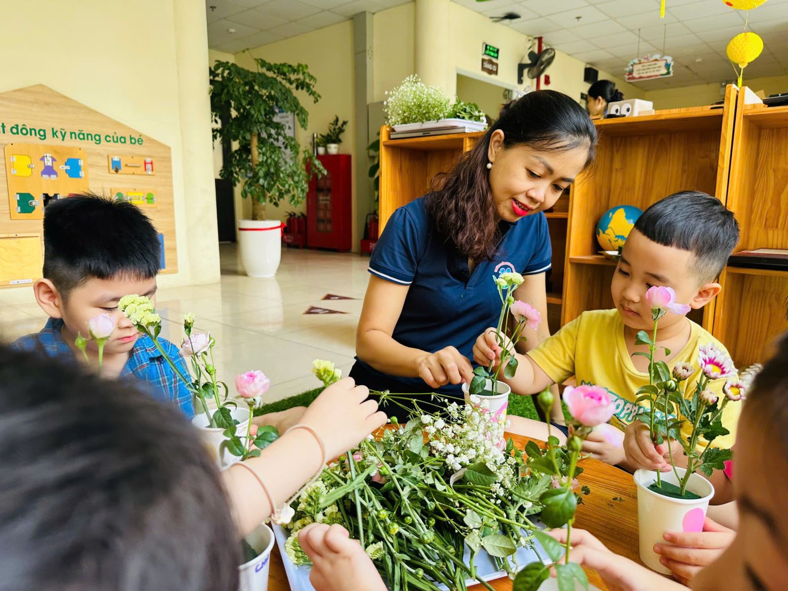 Các bé lớp A4 với hoạt động trang trí cốc giấy và cắm hoa tặng mẹ