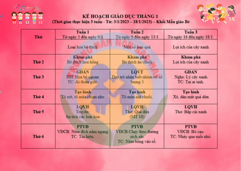Thời khóa biểu khối Mẫu giáo bé - Tháng 01/2023