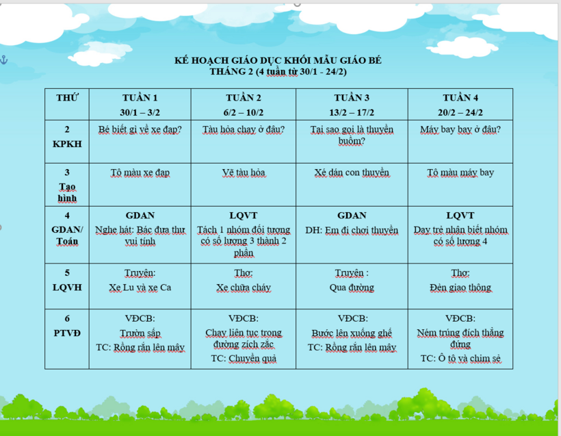 Thời khóa biểu khối Mẫu giáo bé tháng 2/2023