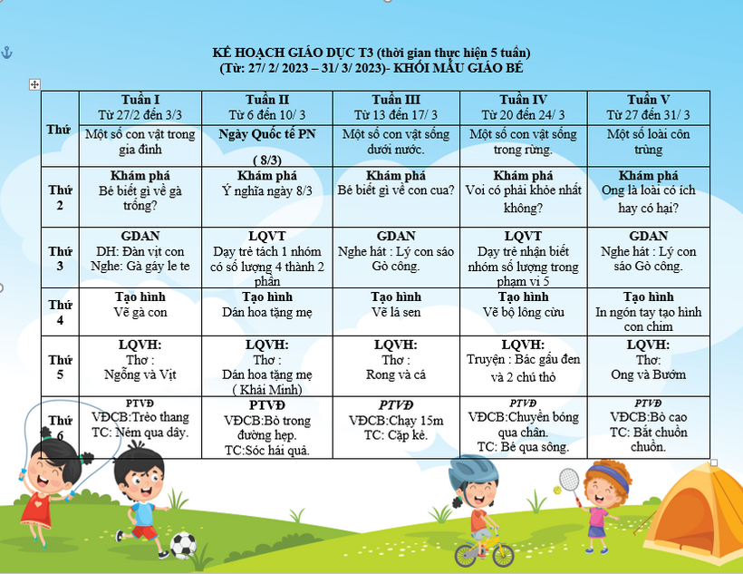Thời khóa biểu Khối Mẫu giáo Bé tháng 3/2023