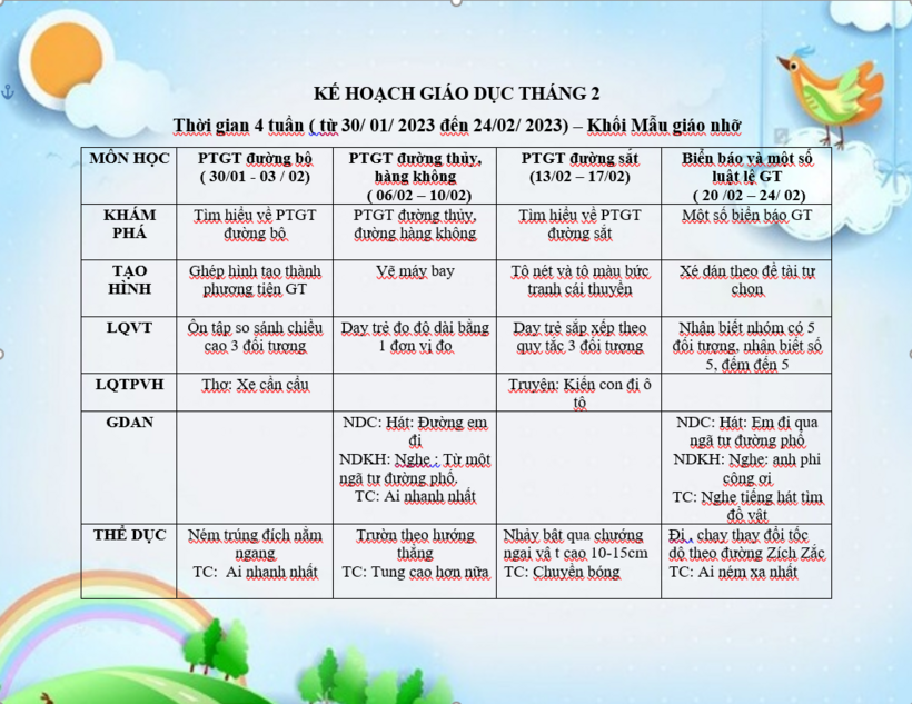 Thời khóa biểu khối mẫu giáo Nhỡ tháng 2/2023