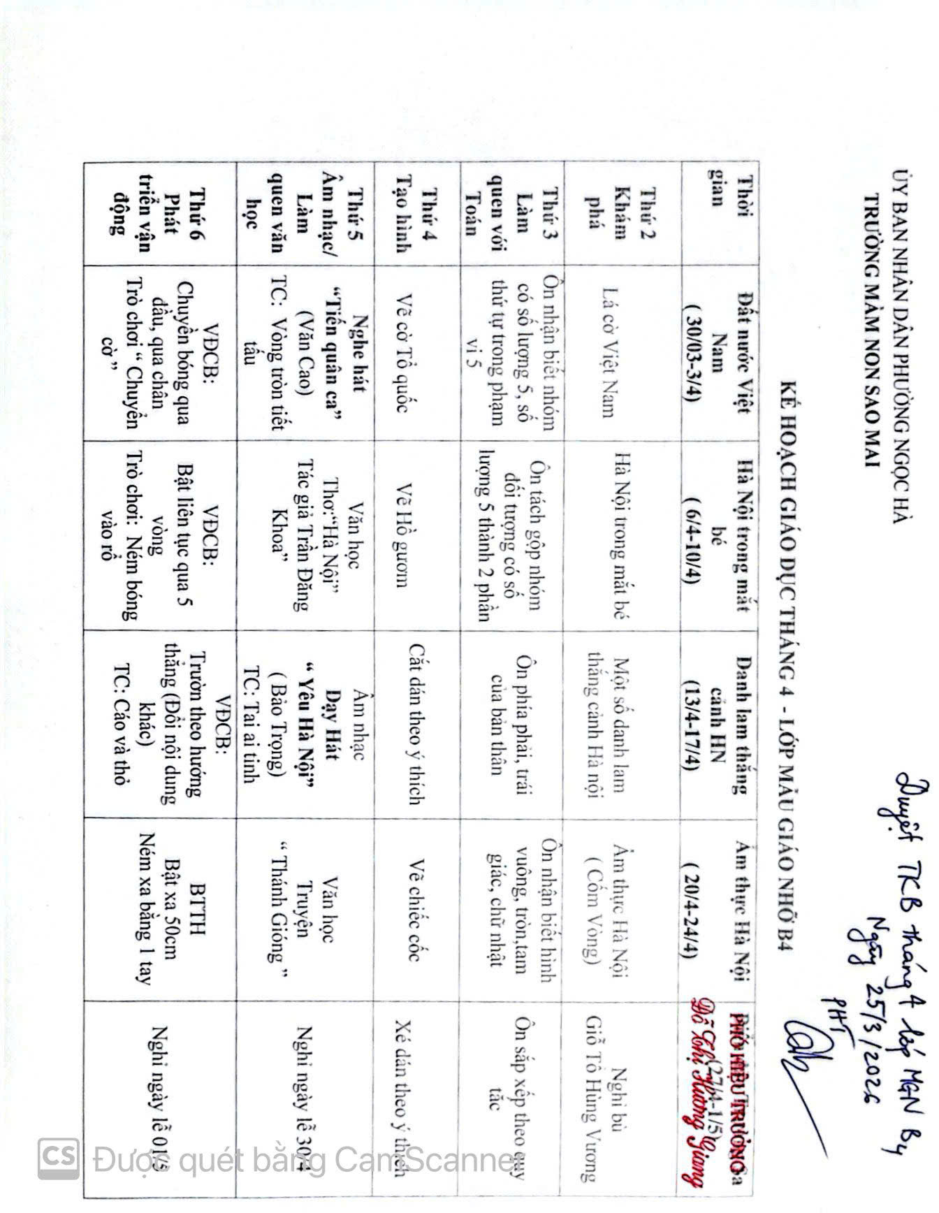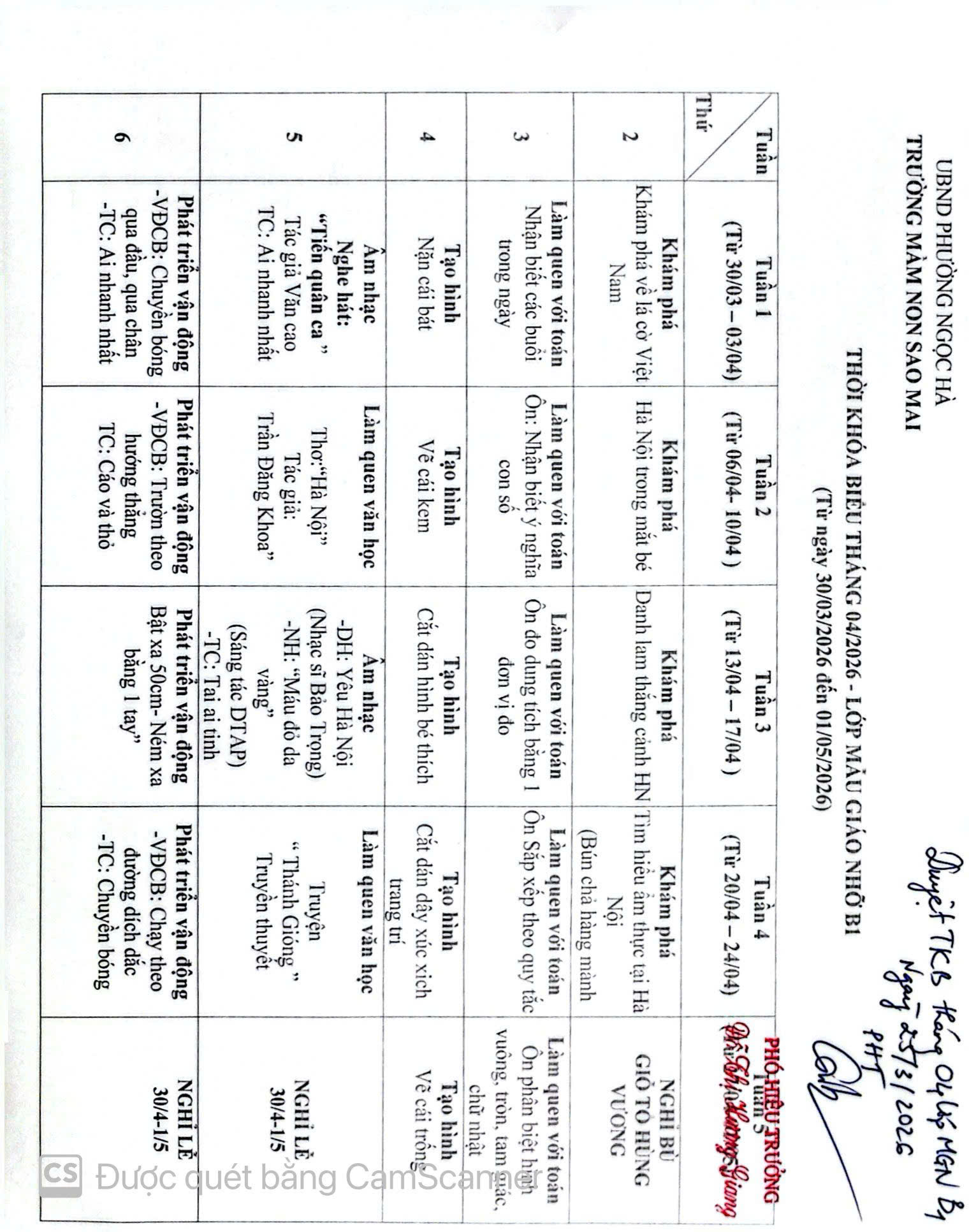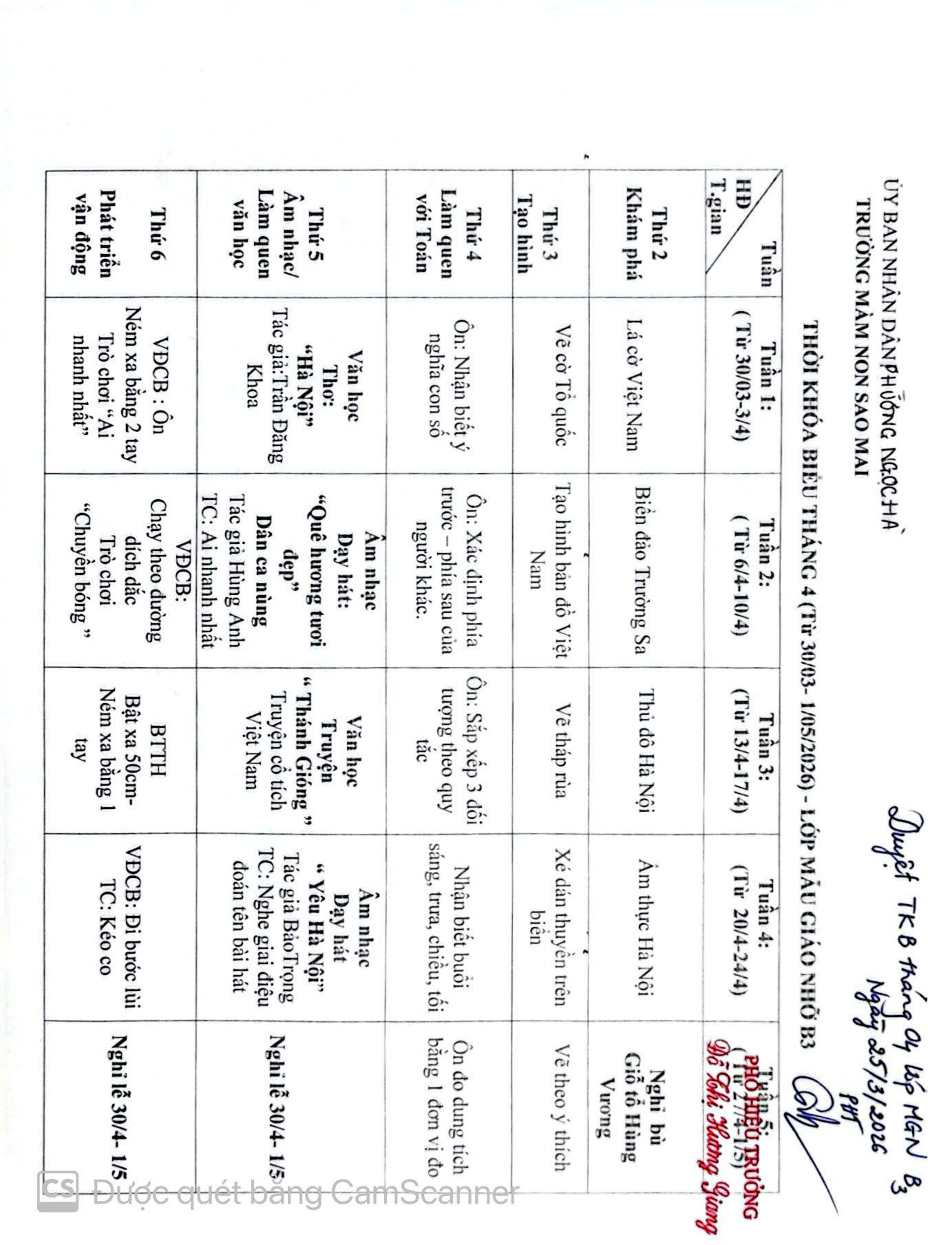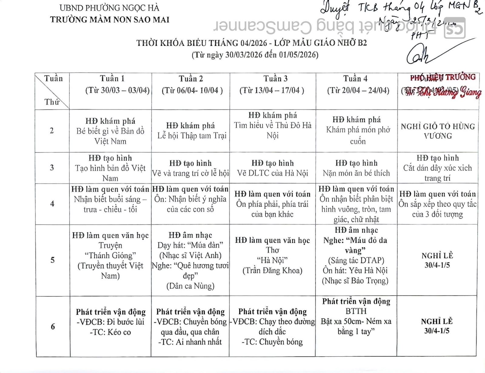 Trường Mầm non Sao Mai trân trọng gửi tới quý PHHS Thời khóa biểu tháng 04/2026 - Khối mẫu giáo nhỡ